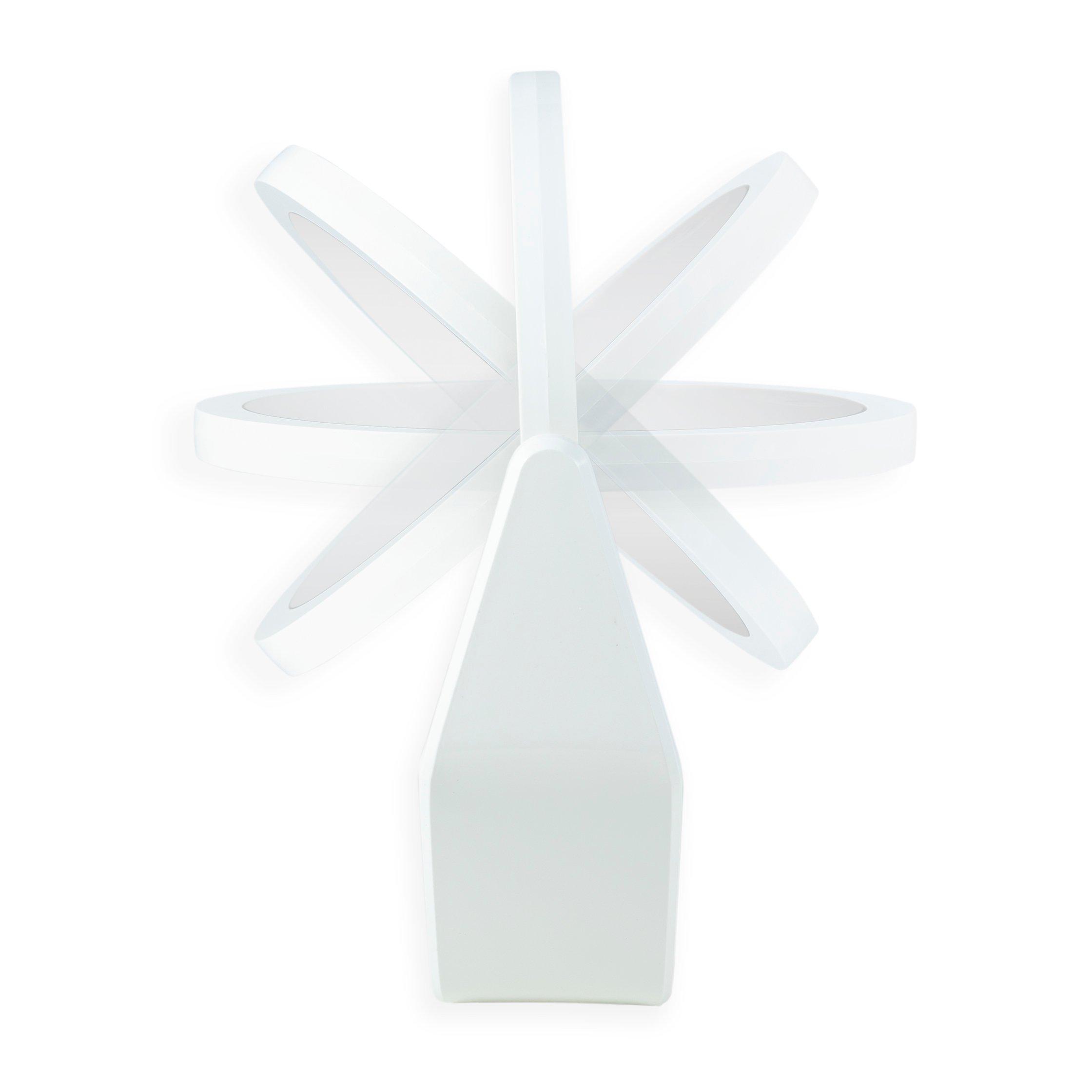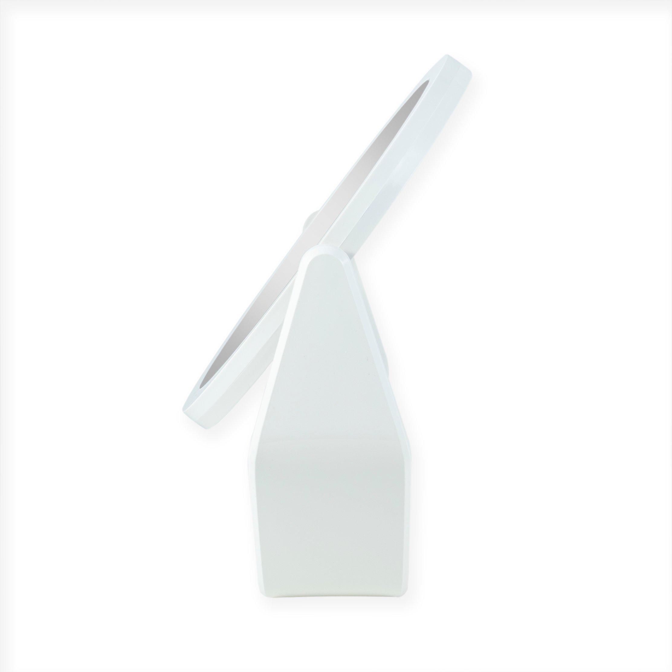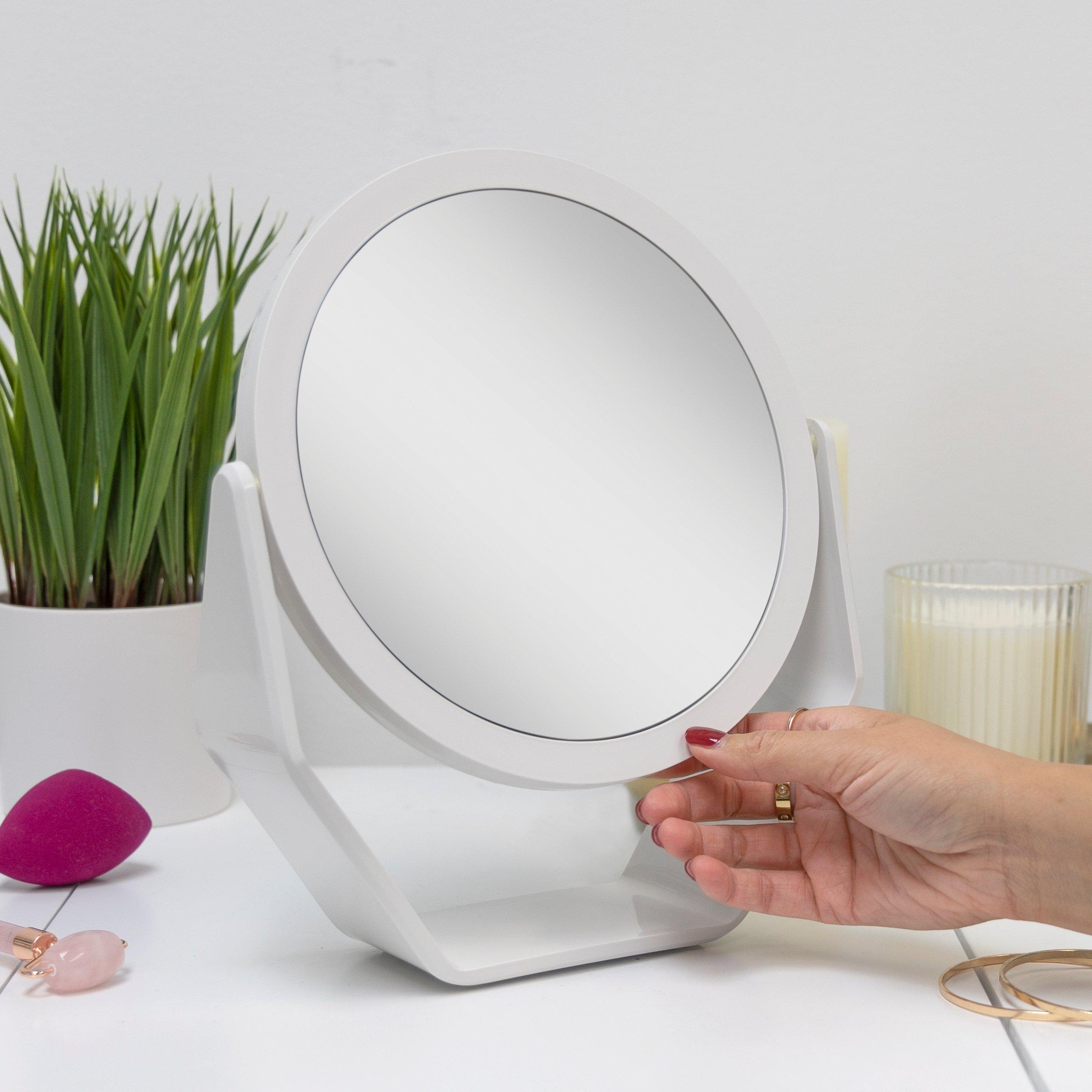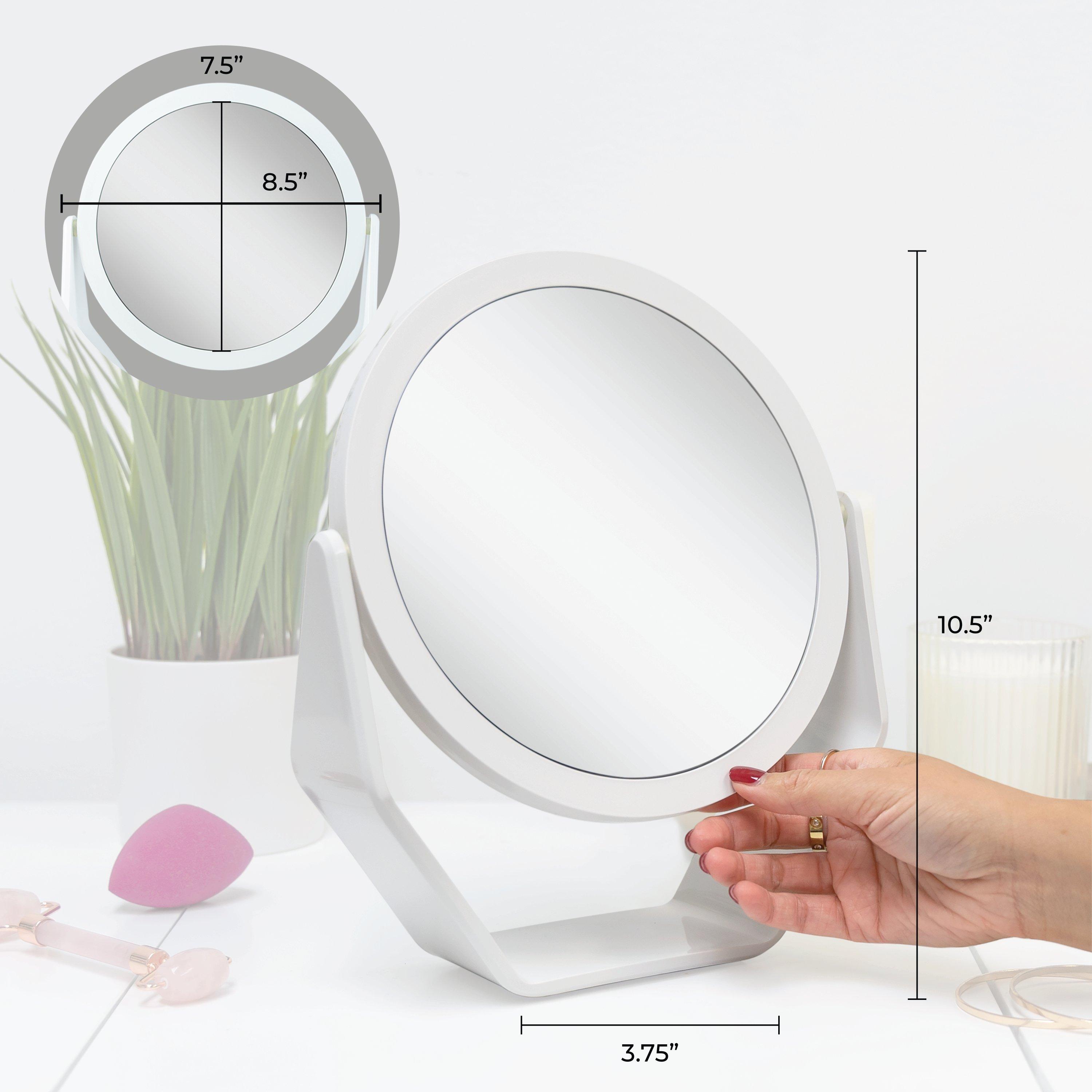 Choice of an 6.5 or 8.5 inch dia. mirror head. Either 5.25 or 7.5 inch glass face mirrors without lights head. 360-degree rotating makeup mirror with magnification. 5-times and 1-time magnification mirror for the bathroom. Acrylic finish base and frame.