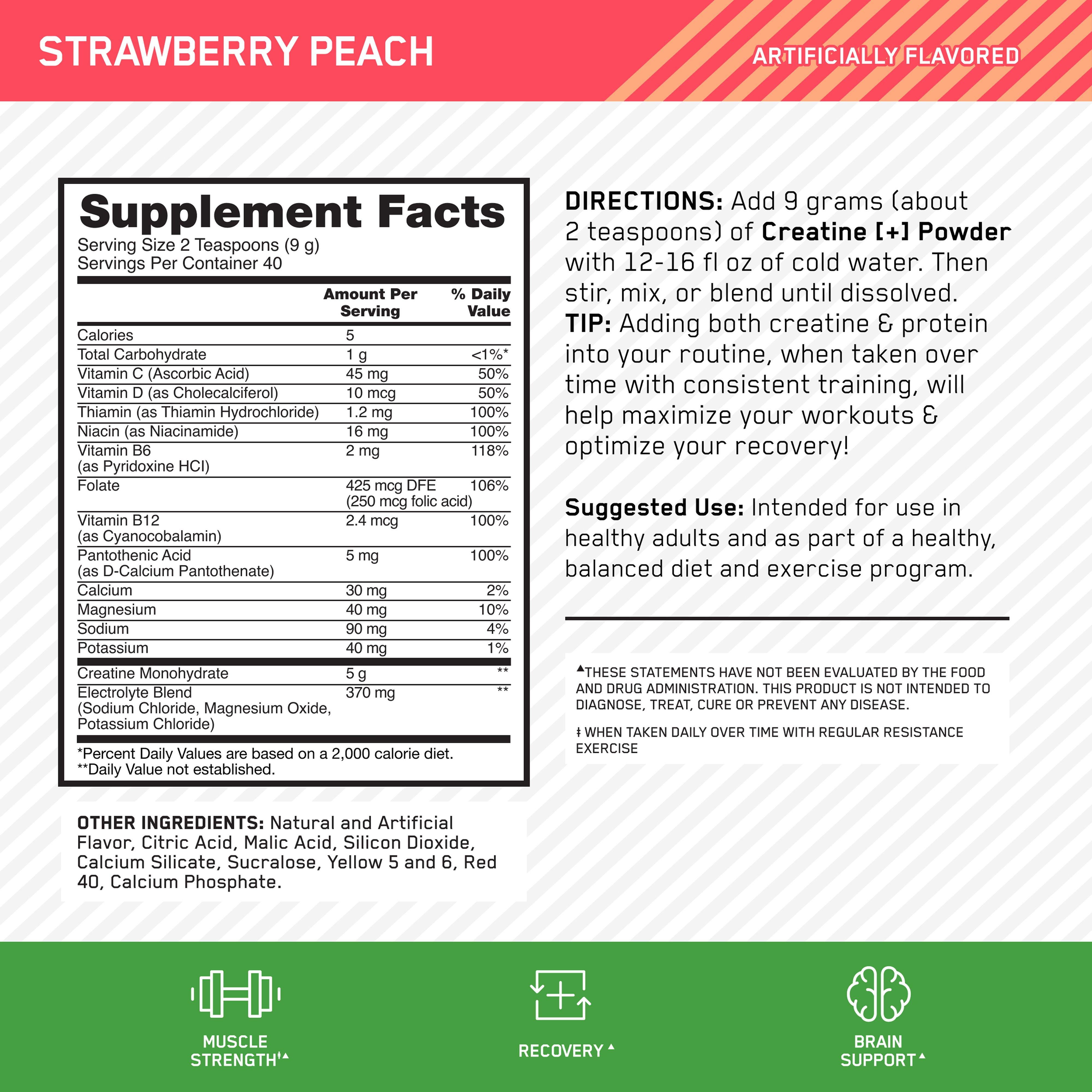 Optimum Nutrition Creatine [+] powder mix supports muscle strength and recovery with 5g of creatine monohydrate per serving and delivers antioxidant, brain, bone and cellular energy support with vitamins B, C, and D. Packed with 370mg electrolyte blend to replace what’s lost through sweat.