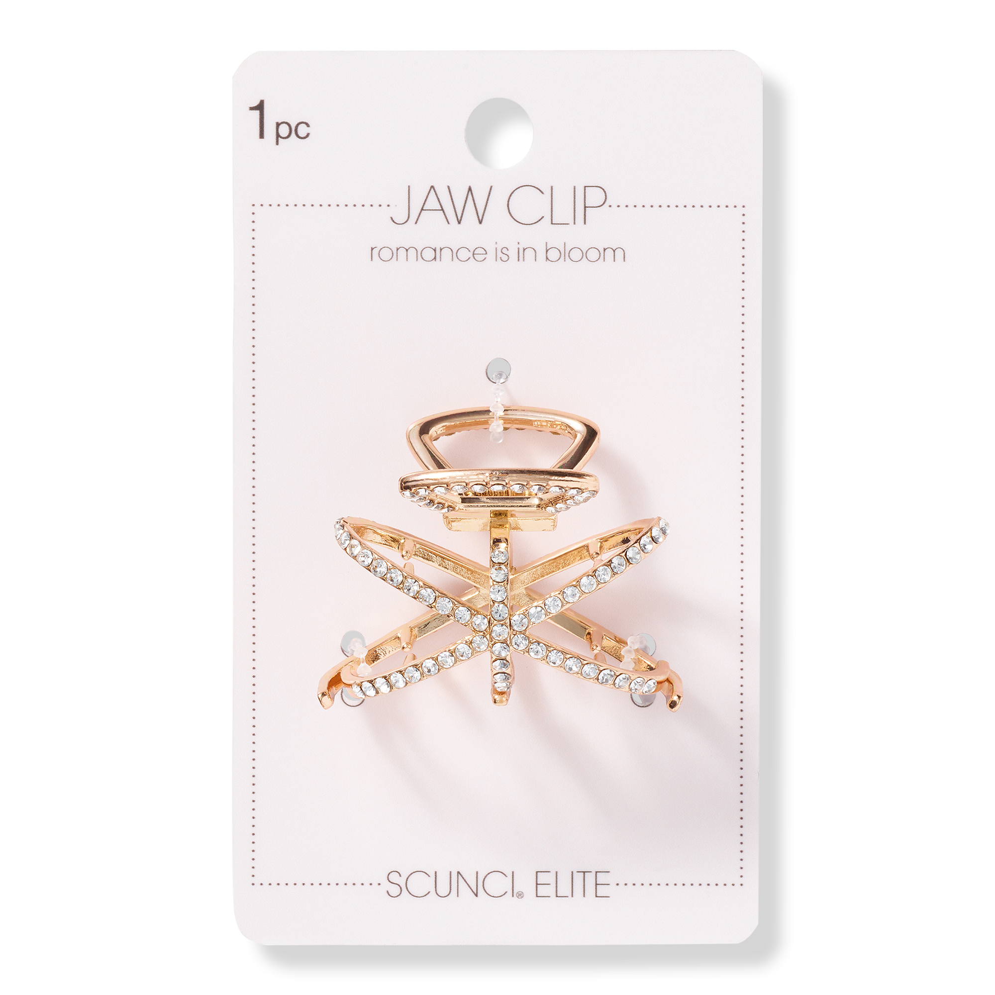 Make a shining statement with the Scünci Elite Jaw Clip made of intertwined gold rings adorned with ornate crystals. The medium-hold clip won't pull hair.