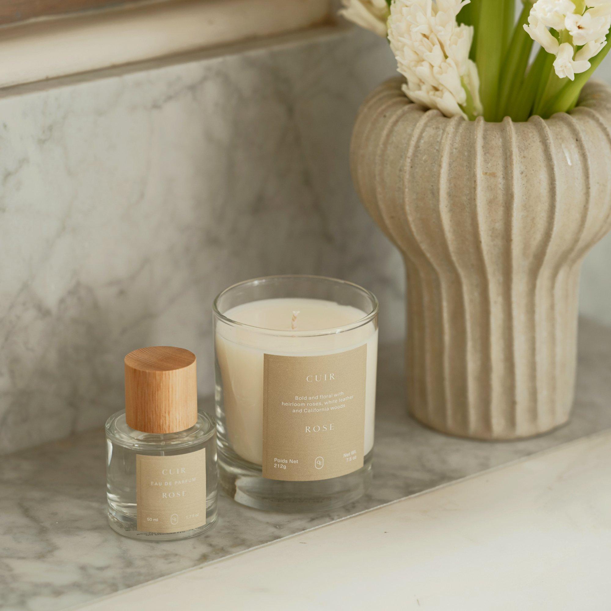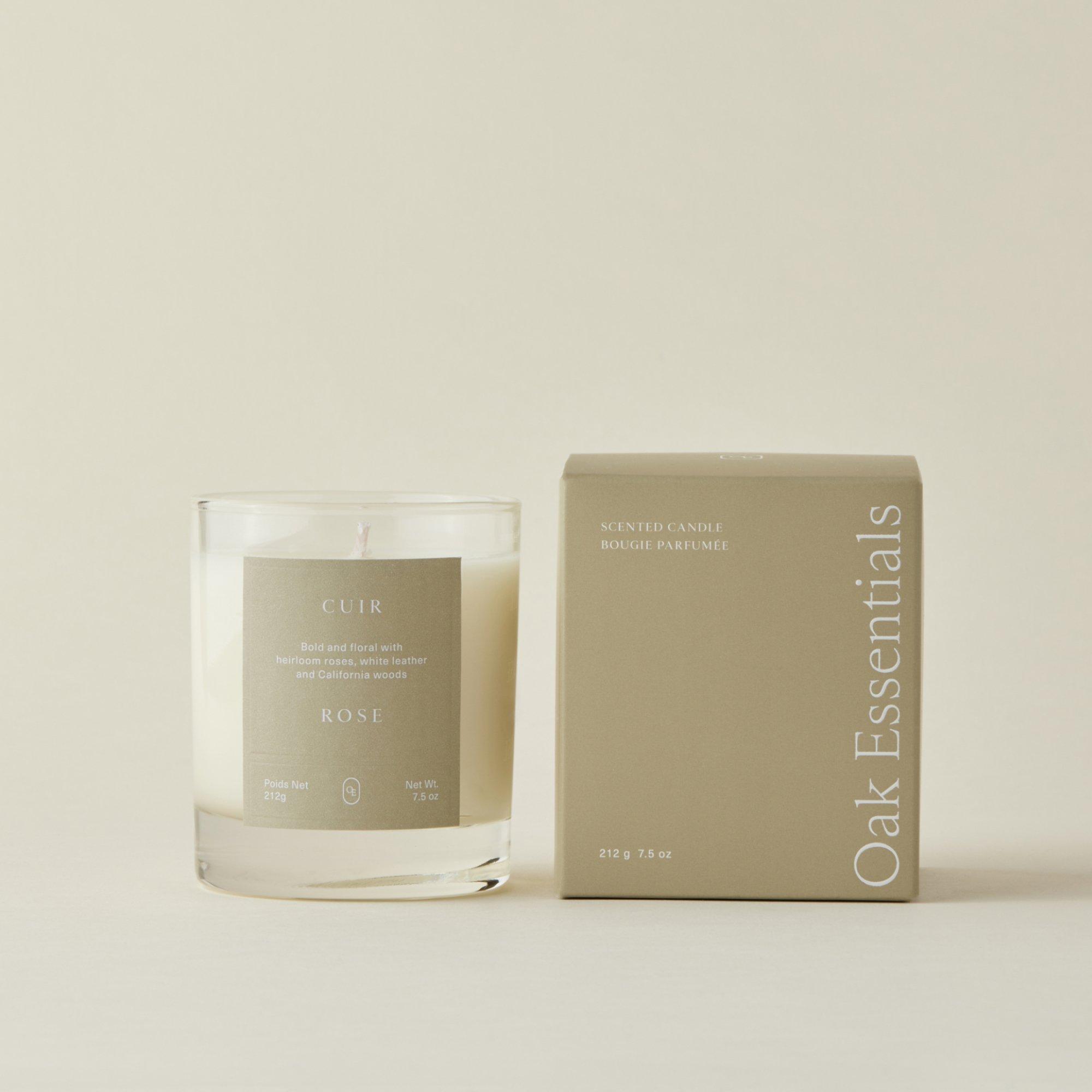 Oak Essentials Cuir Rose Candle is a floral and woody candle that seamlessly diffuses to create a signature scent personality in every room.