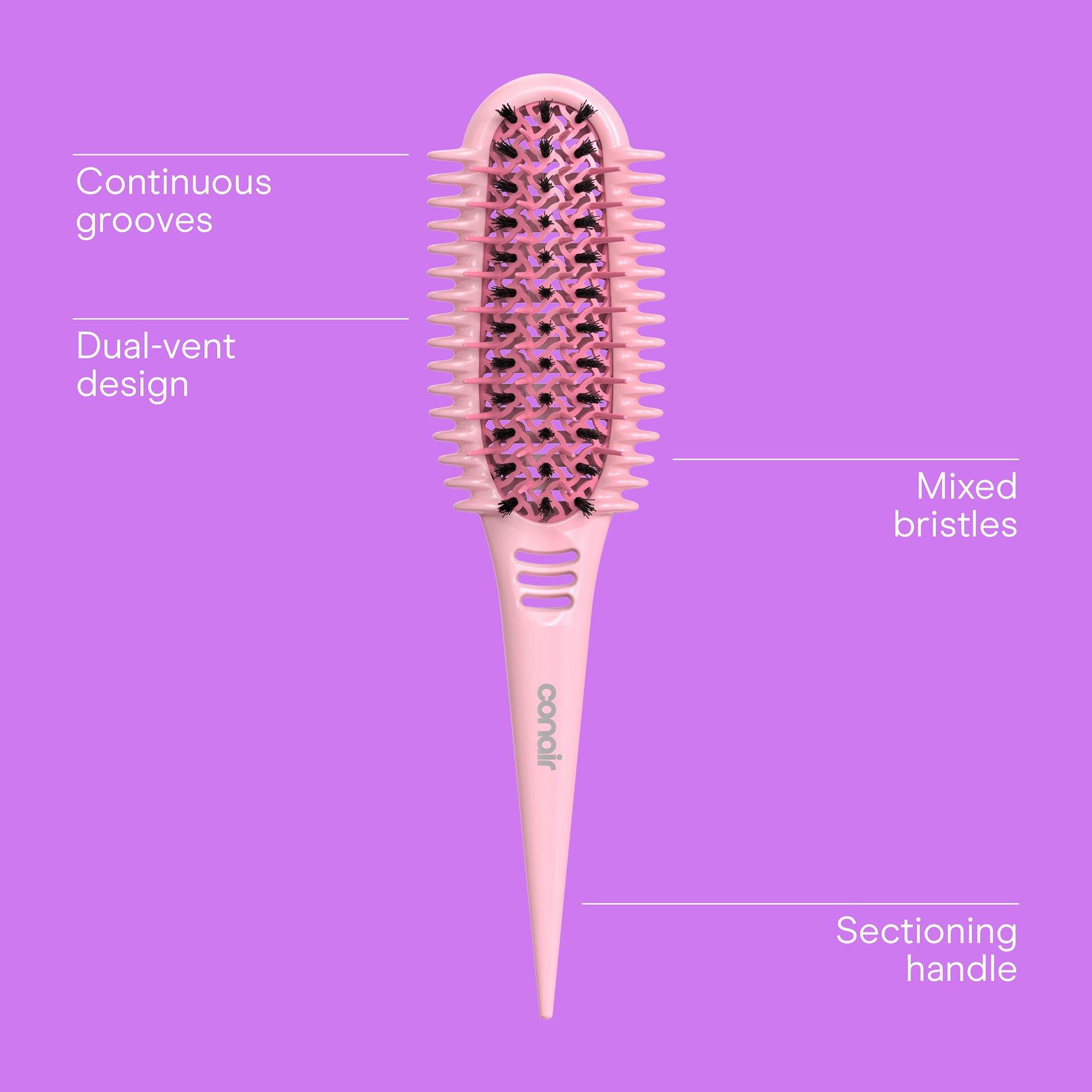 The Conair Curl Define Pro Detangler Brush is designed for hair with tight curls to gently detangle, smooth, and define. Continuous grooves smooth and separate curls, vents help remove excess water and product, and mixed bristles gently detangle with no pulls to reduce frizz and breakage.