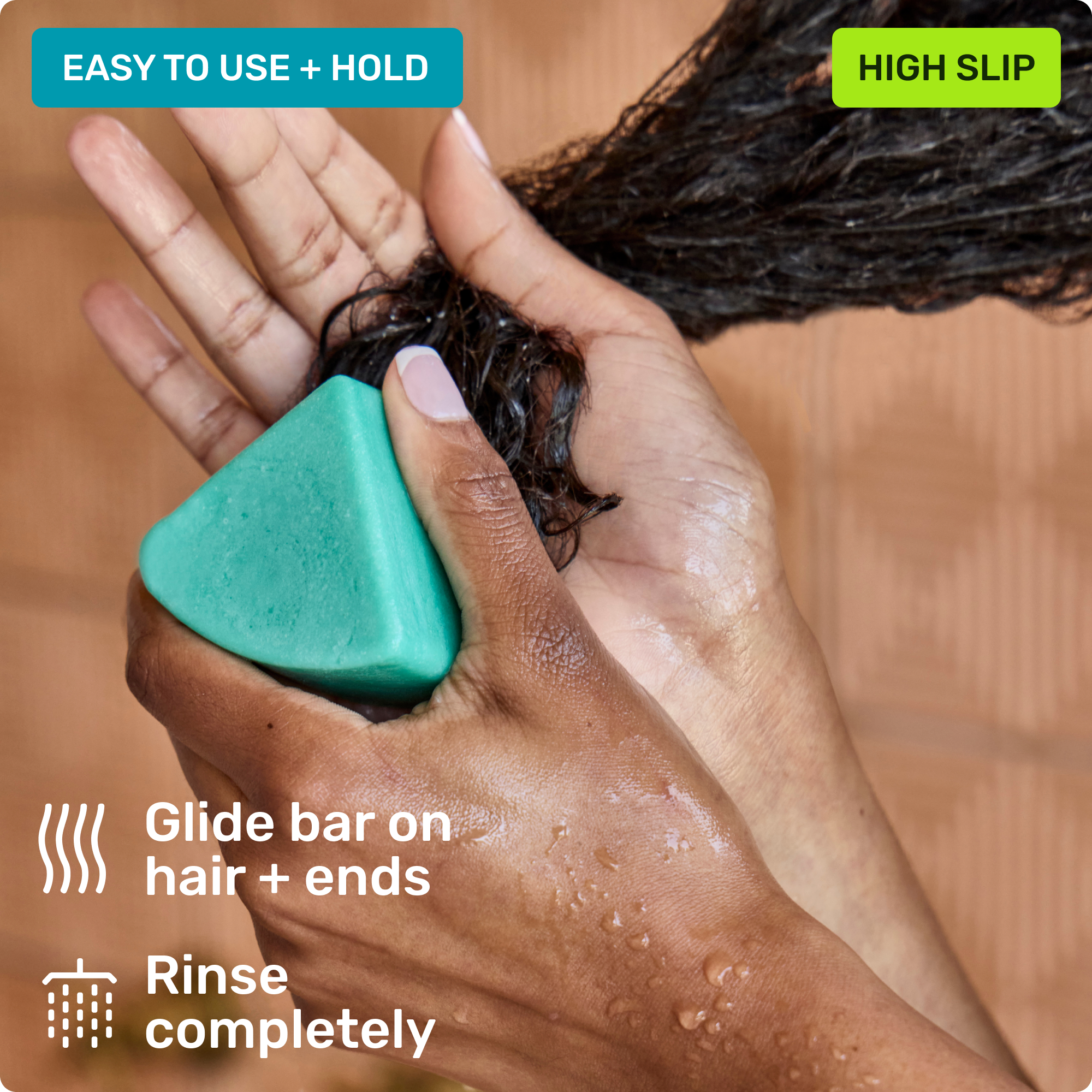 Post-shampoo, glide bar onto wet hair from mid-lengths to ends. Distribute evenly. Rinse completely.