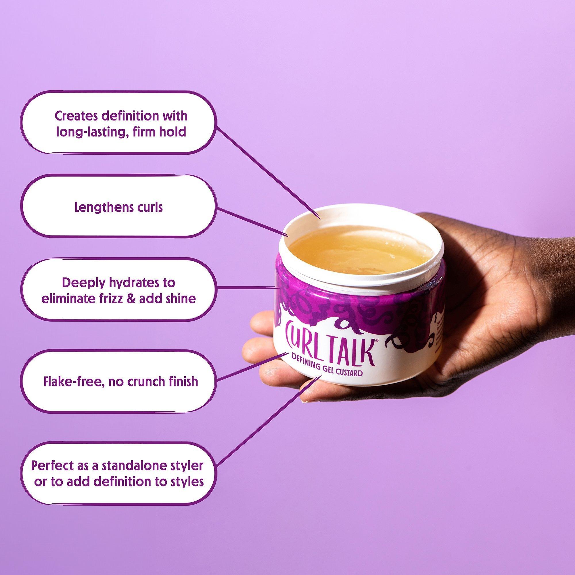 Not Your Mother's Curl Talk Defining Gel Custard extends the length of your curls, while fighting frizz and adding shine for maximum definition and bounce. All of this in a long-lasting firm, flake-free hold.