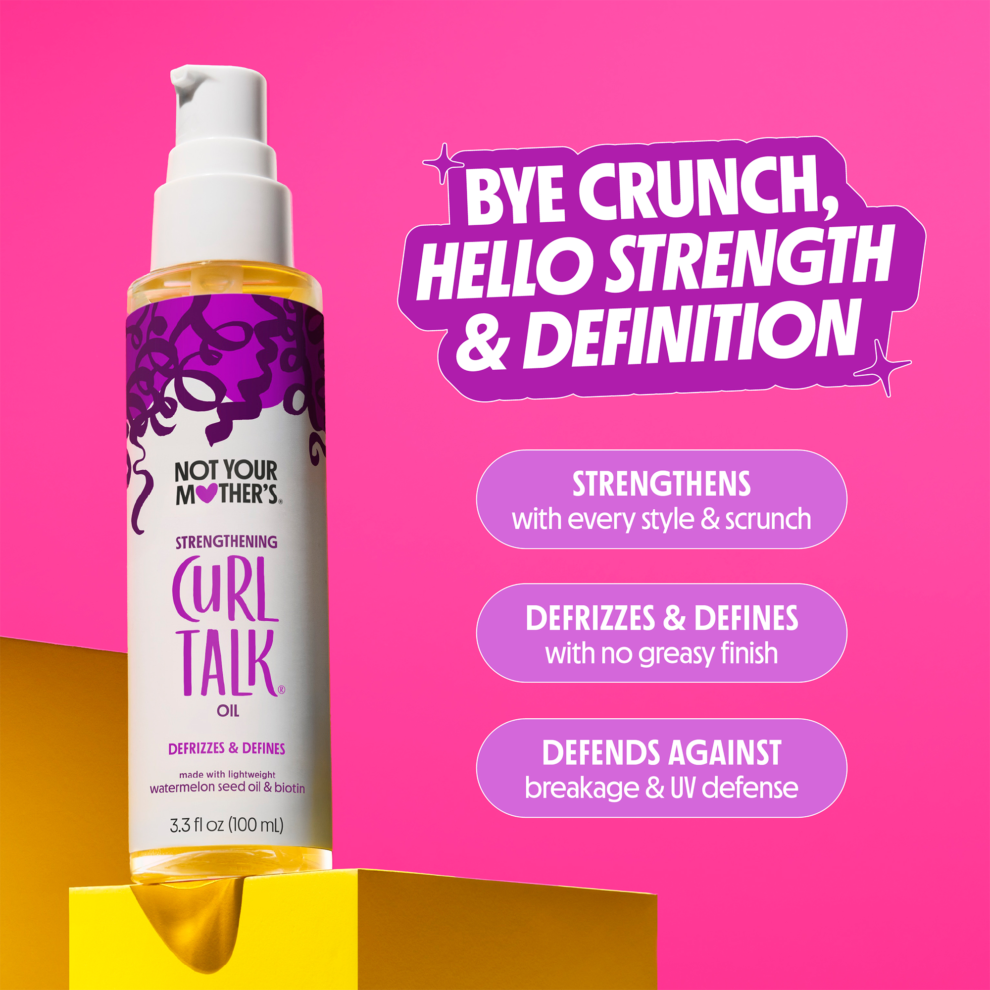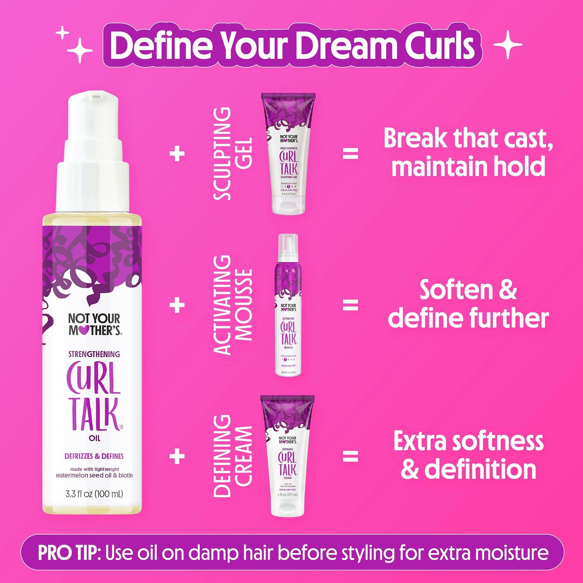 Get stronger curls every time you style with Not Your Mother's Curl Talk Strengthening Oil's lightweight, nourishing formula. This hair oil repairs stressed out curls to protect from breakage and frizz and scrunches out the crunch, adding definition, shine, and UV defense for healthier hair.