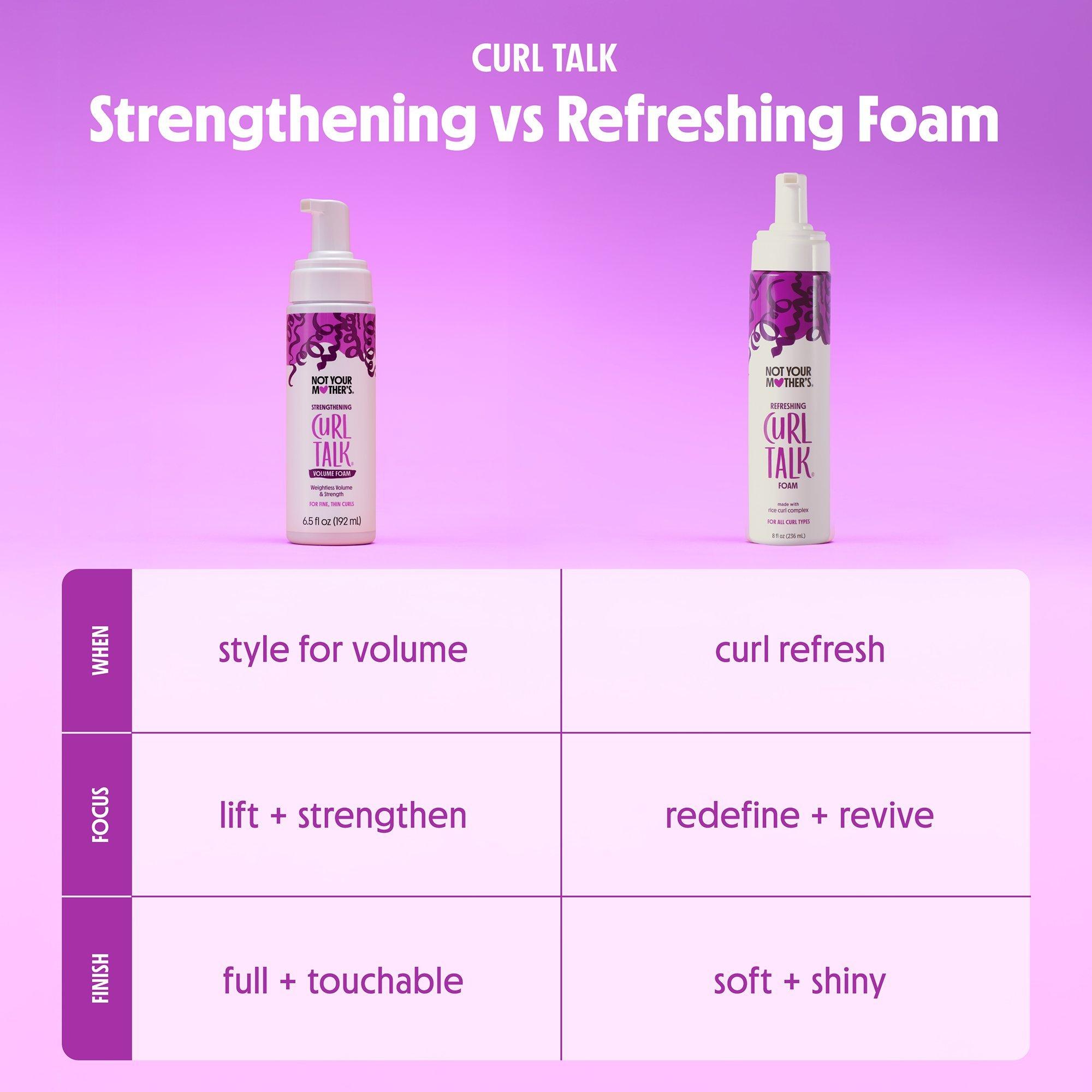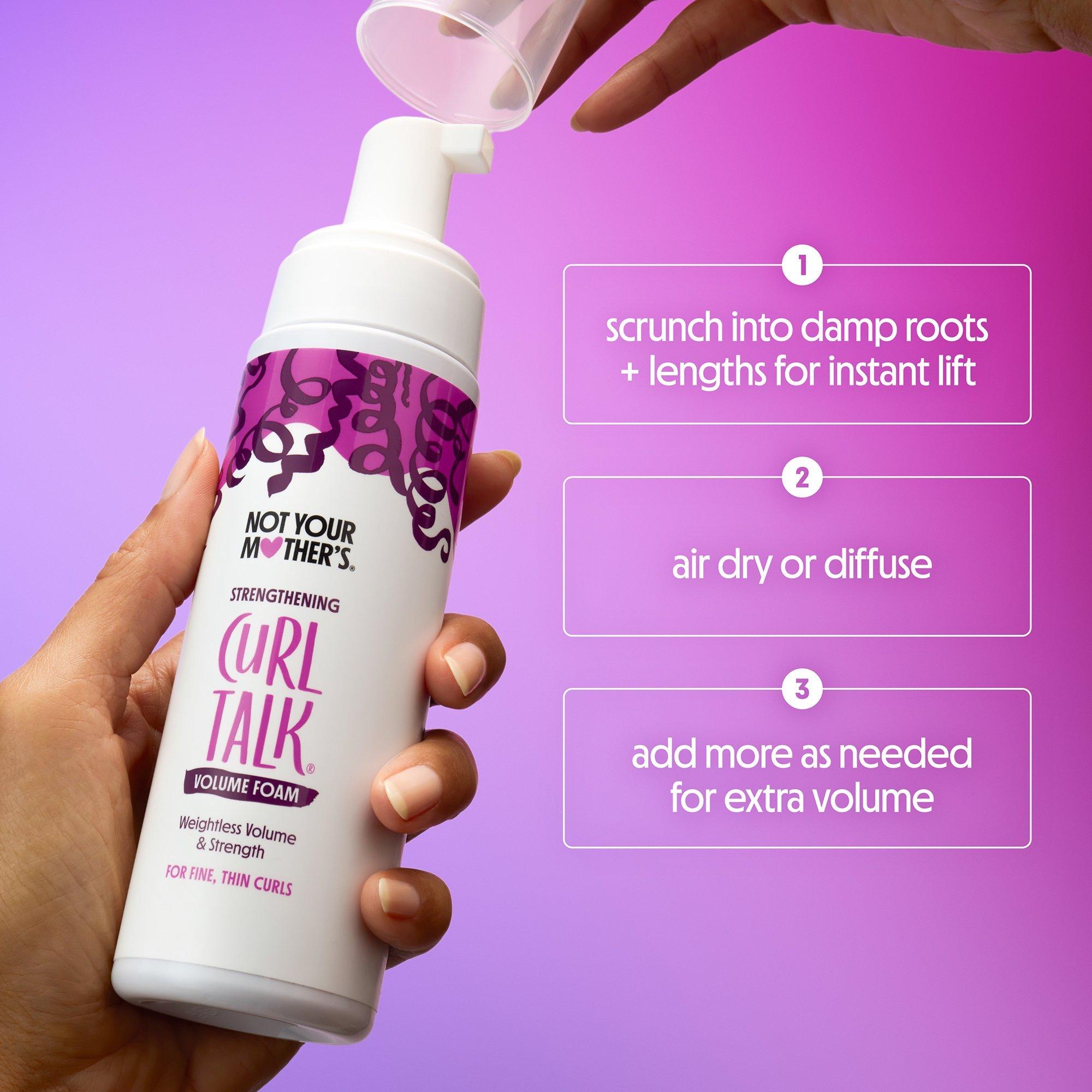 You'll do a double take when you see the instant volume that Not Your Mother's Curl Talk Strengthening Volume Foam delivers to thin, fine curls. Its weightless texture leaves them fuller and bouncier, never stiff or crunchy, while biotins and rice protein build strength to reduce breakage over time.