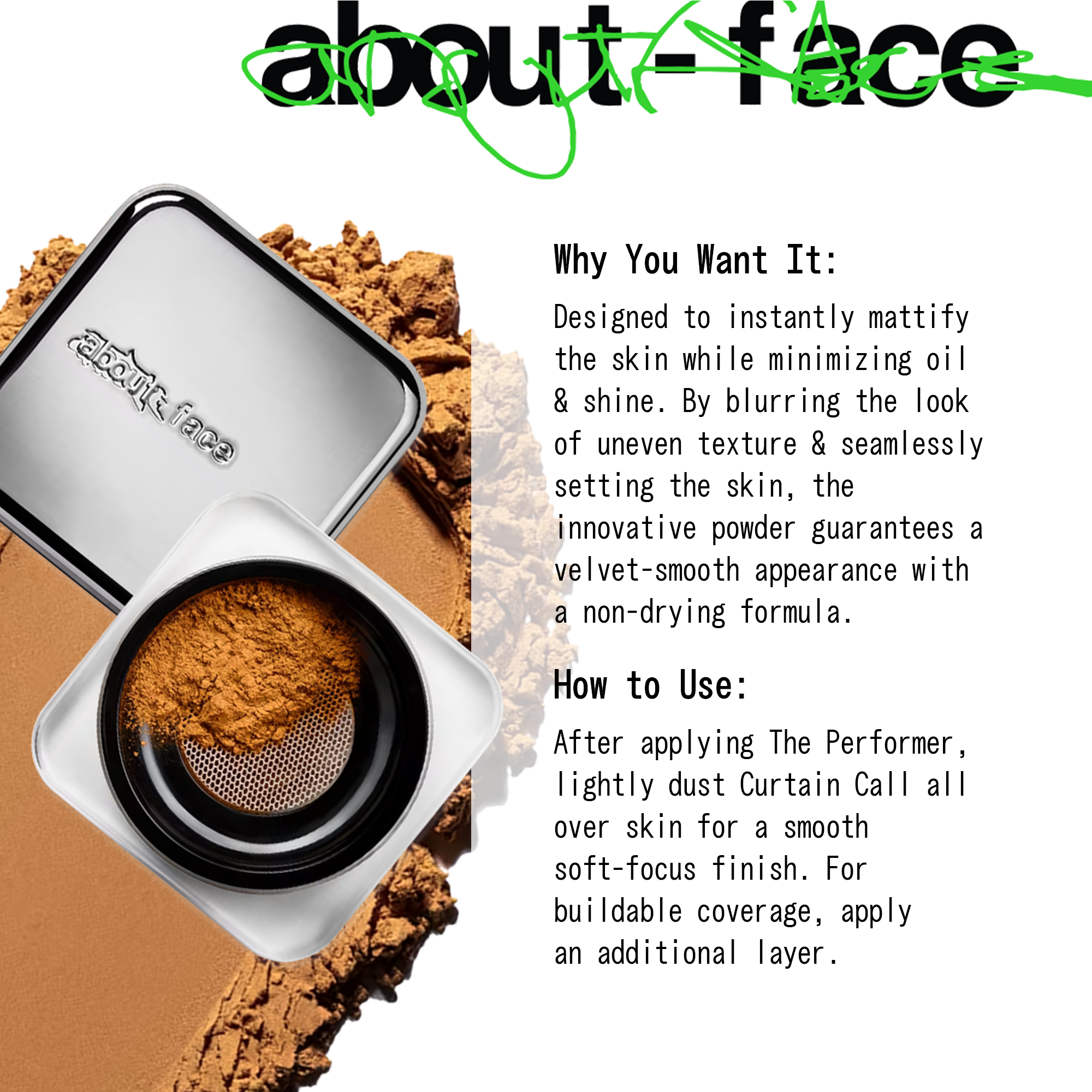After applying The Performer, lightly dust Curtain Call all over skin for a smooth + soft-focus finish. For buildable coverage, apply an additional layer.