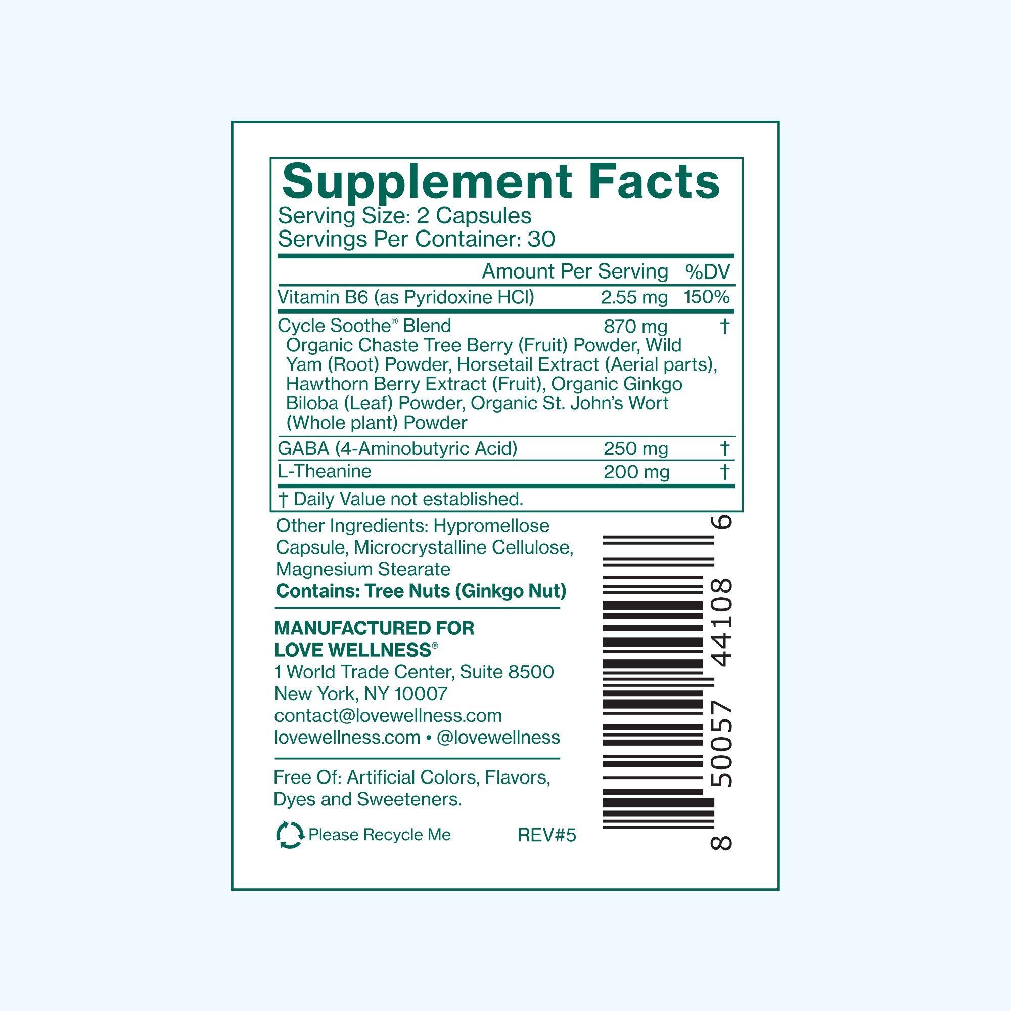 Love Wellness Cycle Soothe is a daily supplement that soothes symptoms from normal hormonal changes including PMS, mood changes, bloating, and stress.*