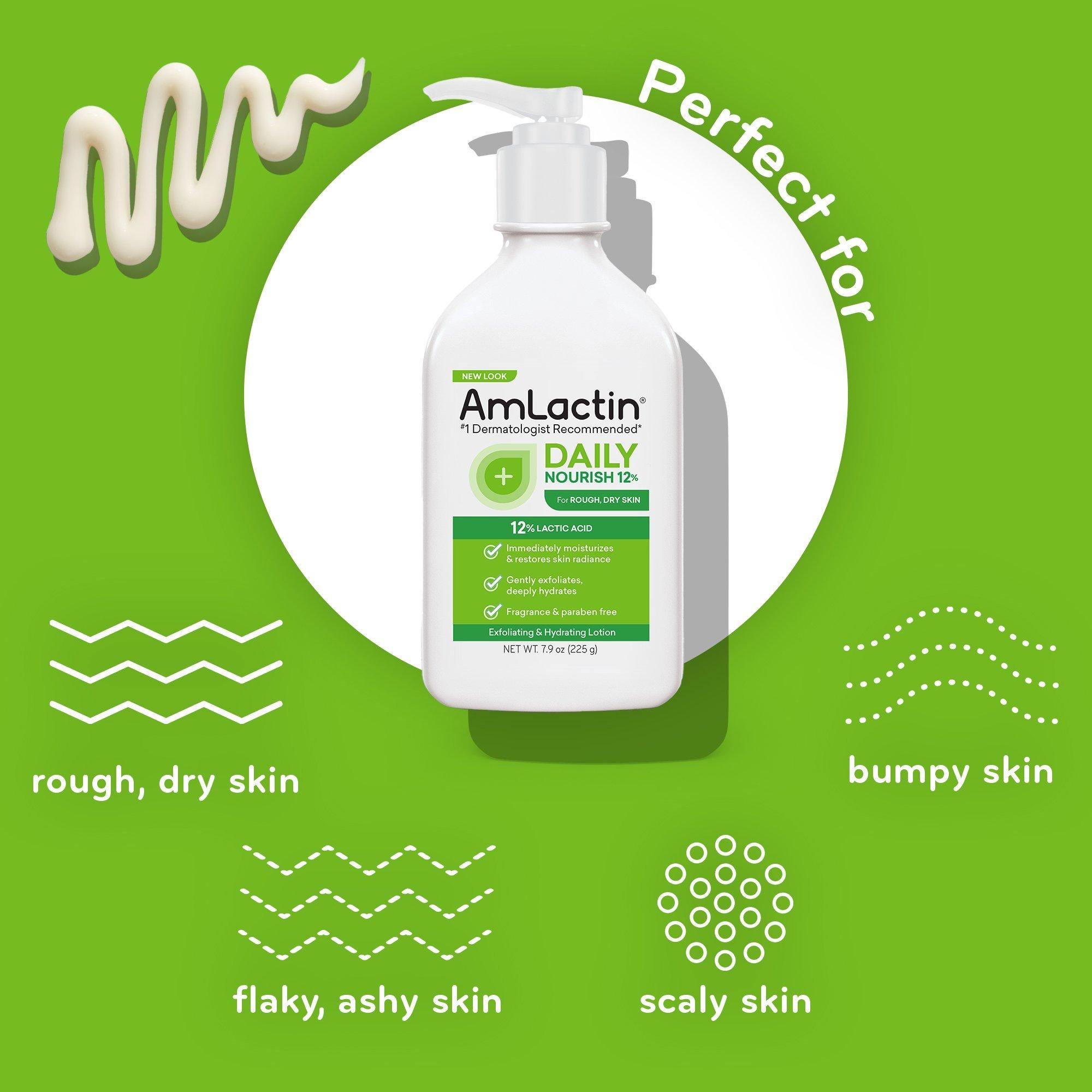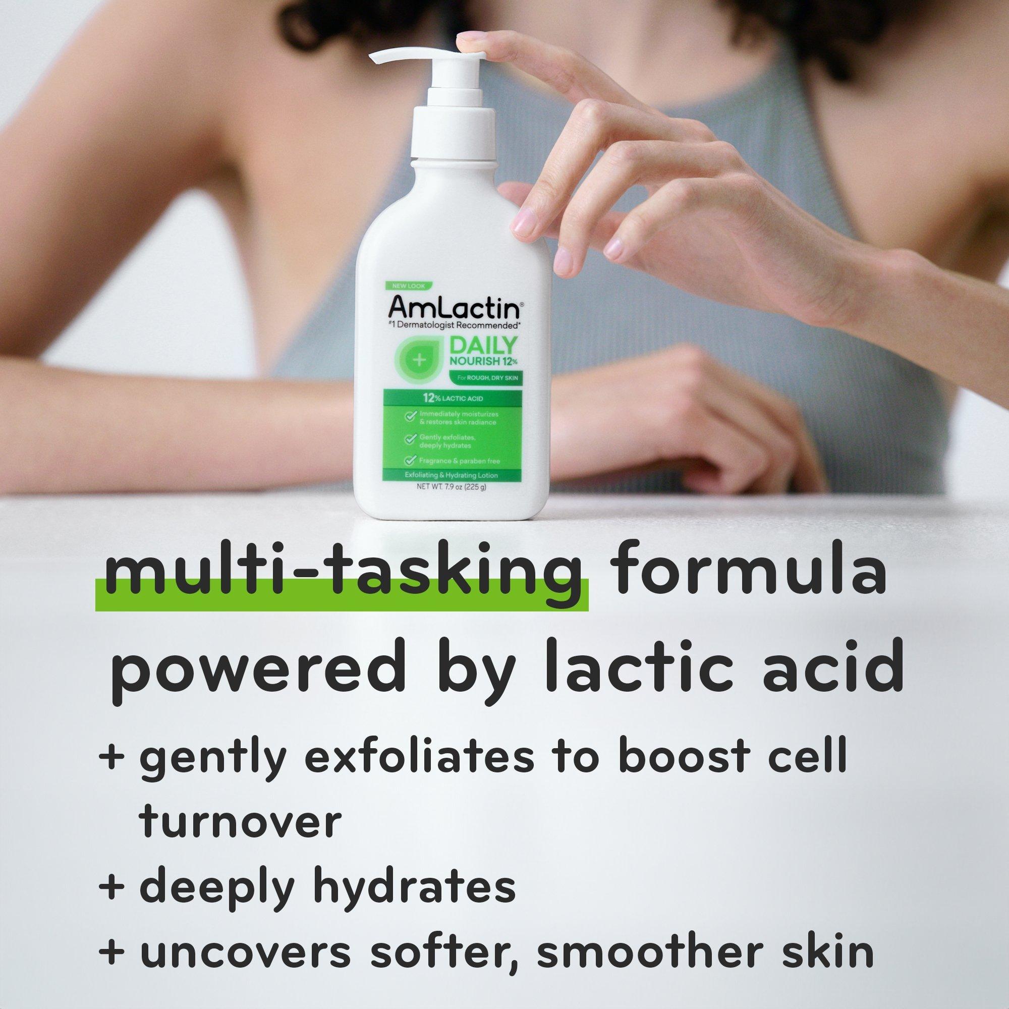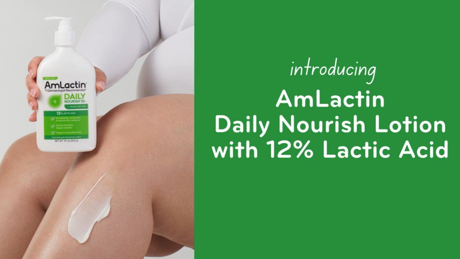 AmLactin Daily Nourish Lotion with 12% Lactic Acid AHA uncovers softer, smoother skin with a multi-tasking formula that gently exfoliates & deeply hydrates.