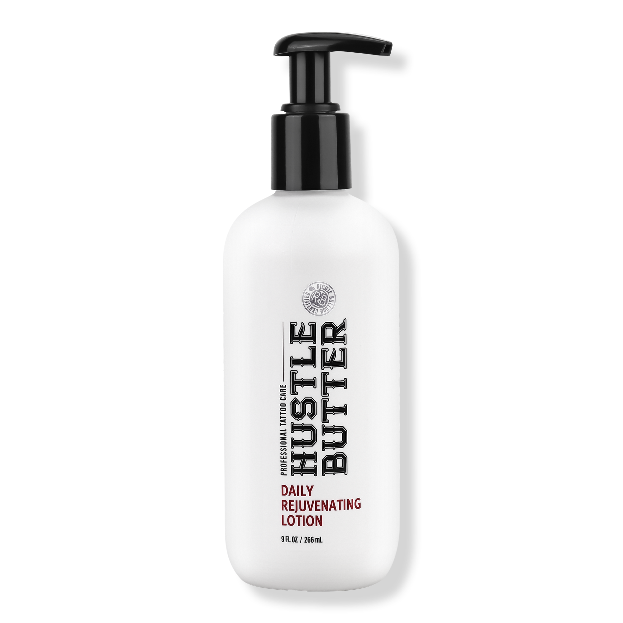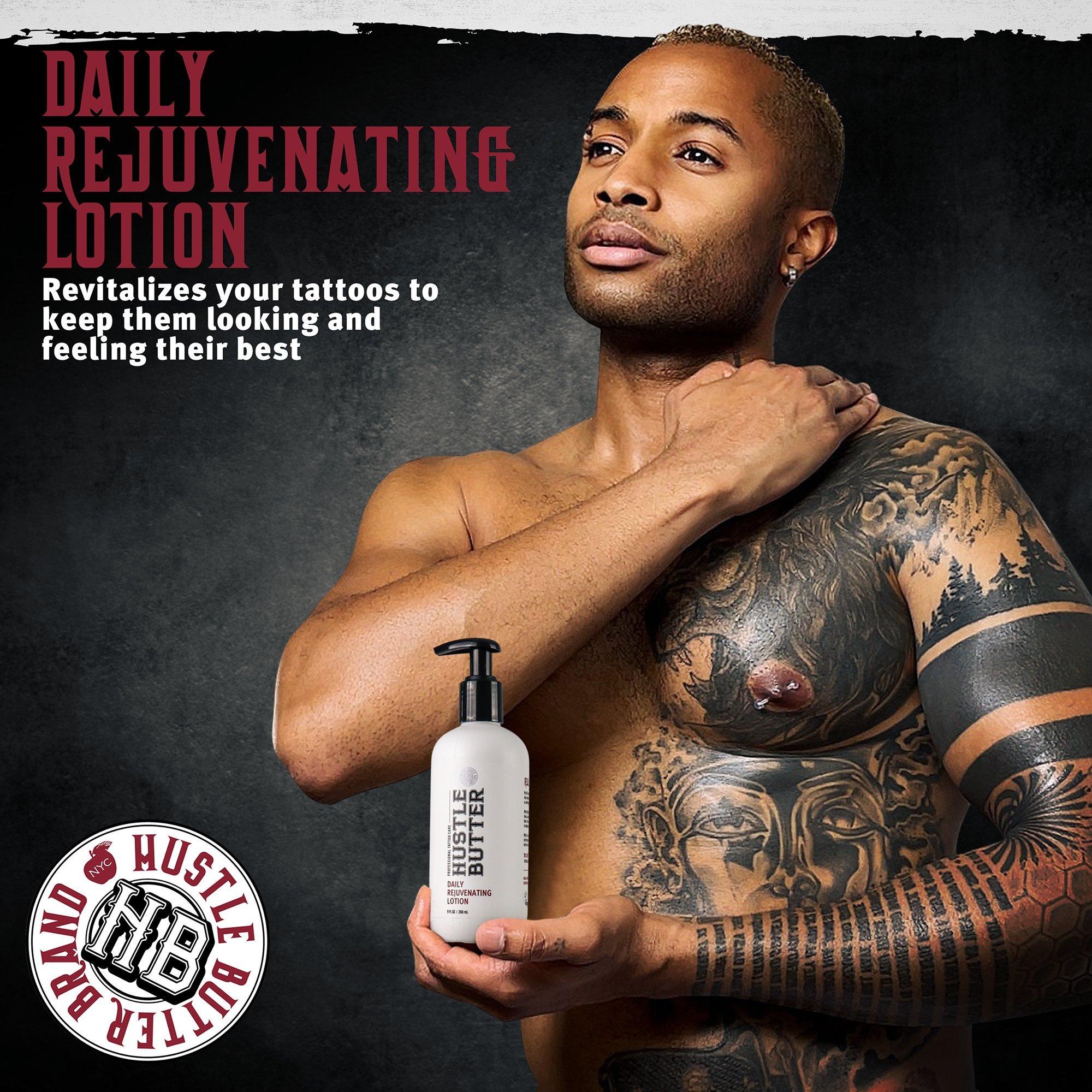 Hustle Butter Daily Rejuvenating Lotion nourishes your skin and tattoos to keep your artwork looking fresh. Use it all over for moisturized, glowing skin.
