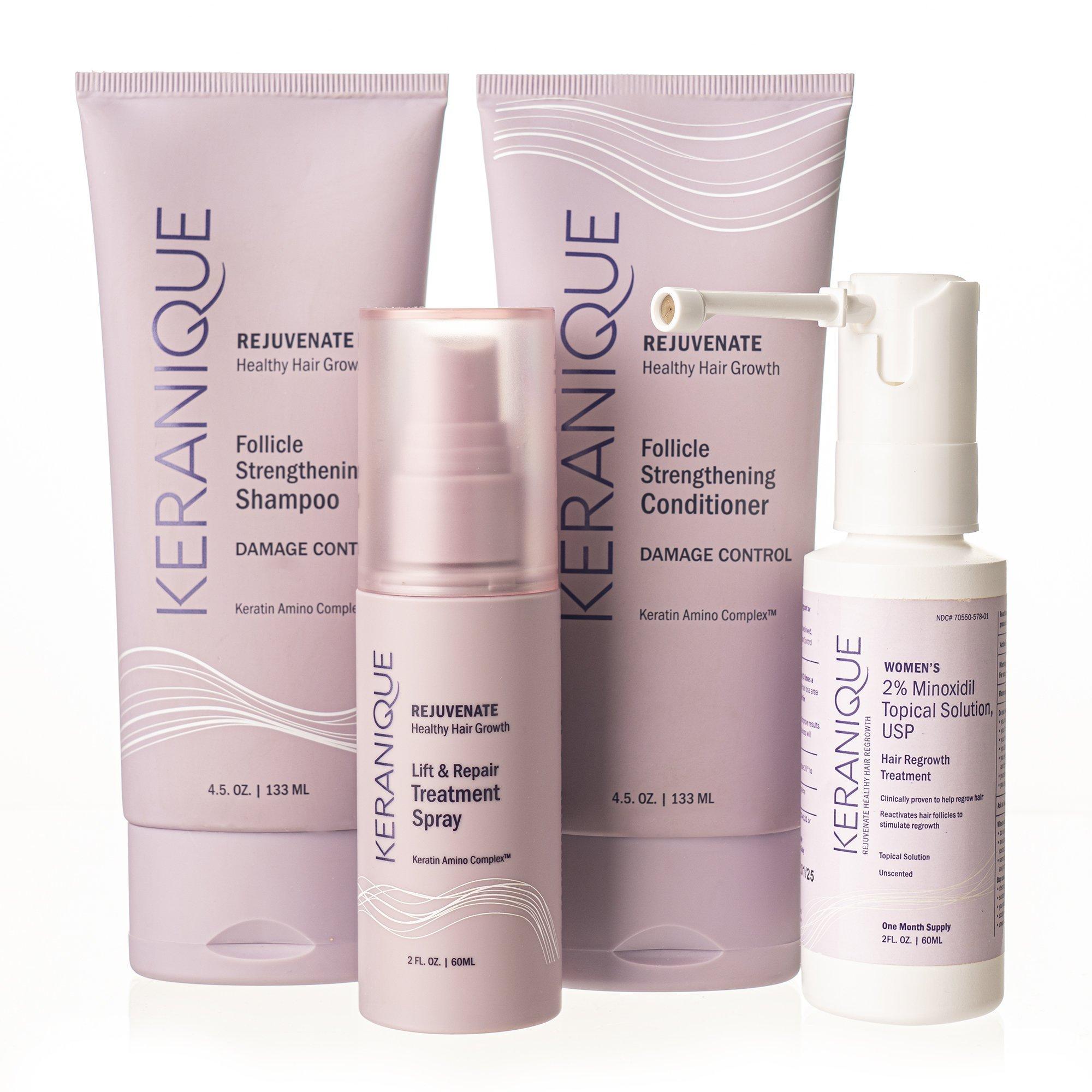 Keranique's Damage Control Complete Hair Regrowth System is a 4-piece kit that combines the science of a clinically proven hair regrowth treatment with premium hair care. Developed for chemically-processed, dry, damaged hair and enriched with strand-saving Keratin Amino Complex.