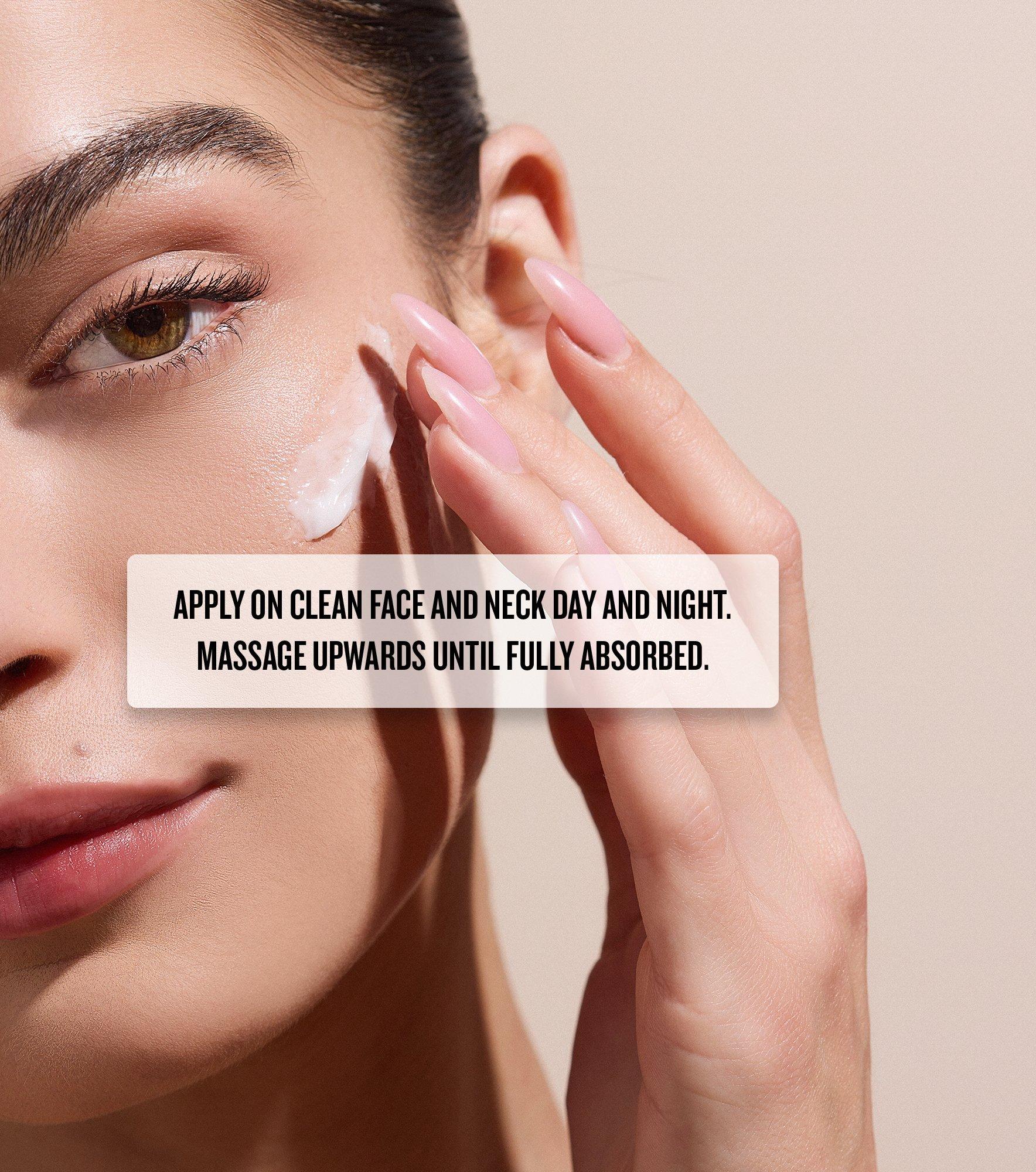 Apply on clean face and neck day and night. Massage upwards until fully absorbed.