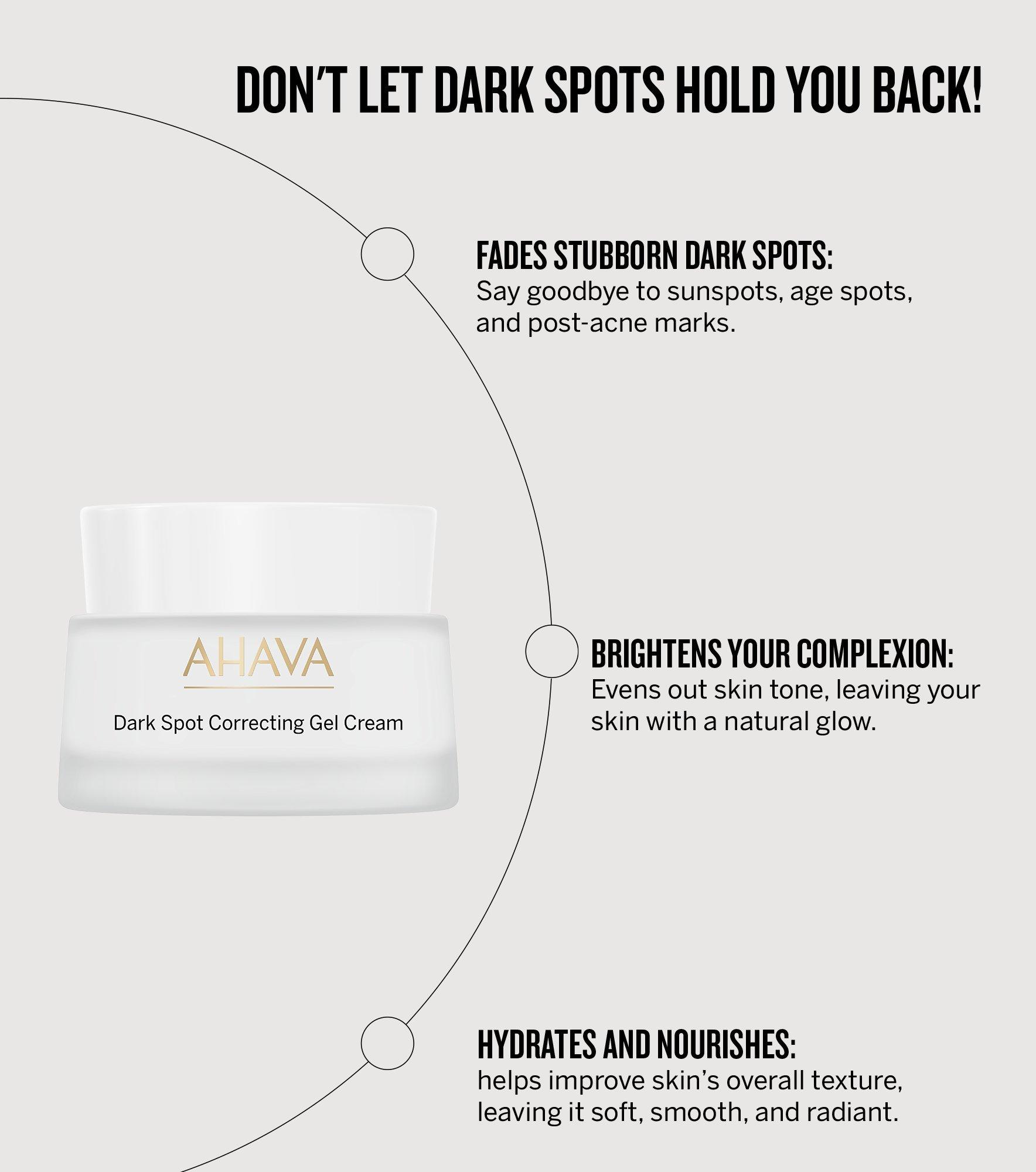 AHAVA's Dark Spot Correcting Gel Cream visibly reduces and brightens dark spots, helps inhibit future skin discoloration and improves skin's radiance, leading to a beautifully hydrated and even skin tone.