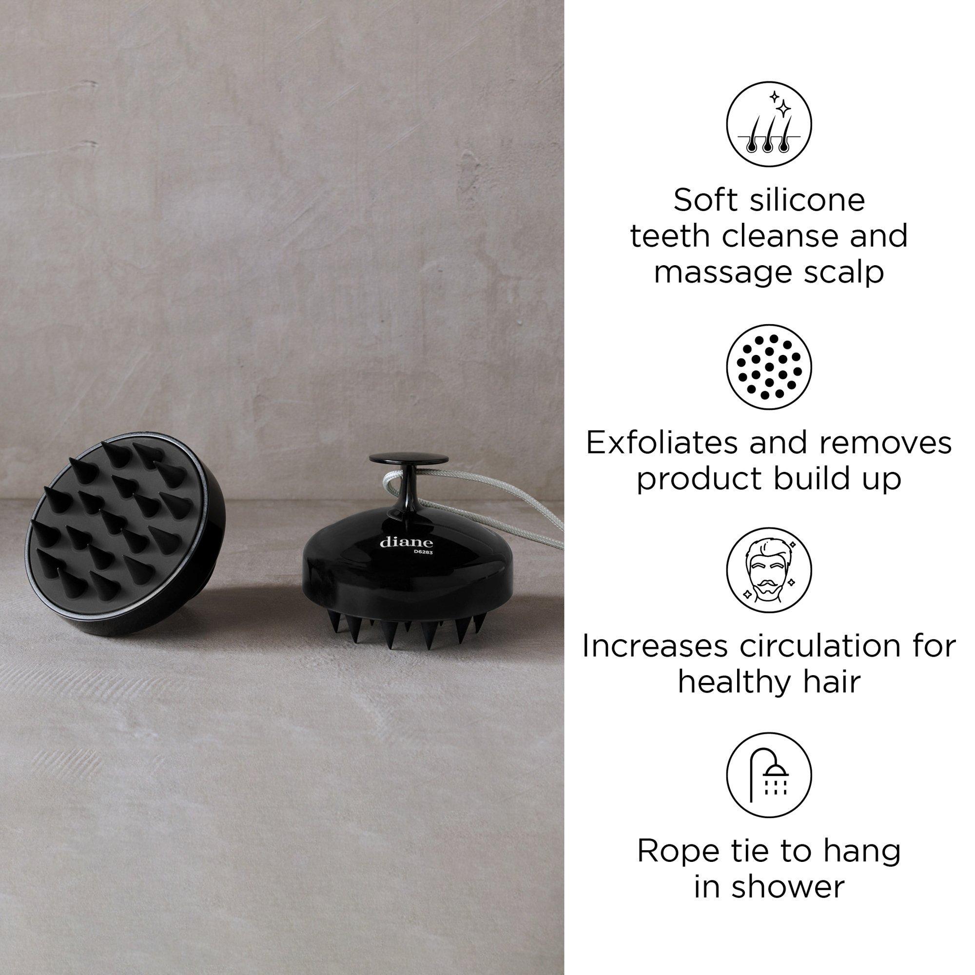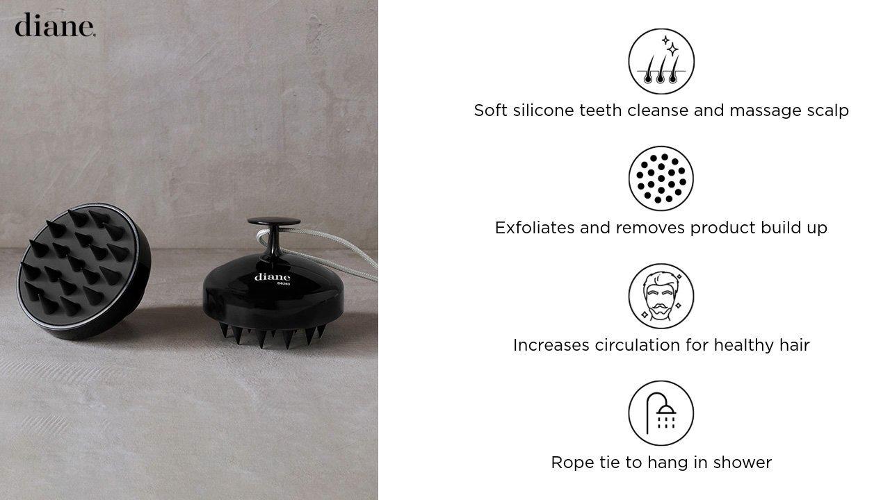 The Diane Black Shampoo Massage Brush is great for deep scalp cleansing. Use this scalp massager in shower for a deep cleansing shampoo. Soft silicone teeth gently exfoliate scalp to remove product build up and dry skin. Massaging teeth increase circulation for healthy hair and scalp.