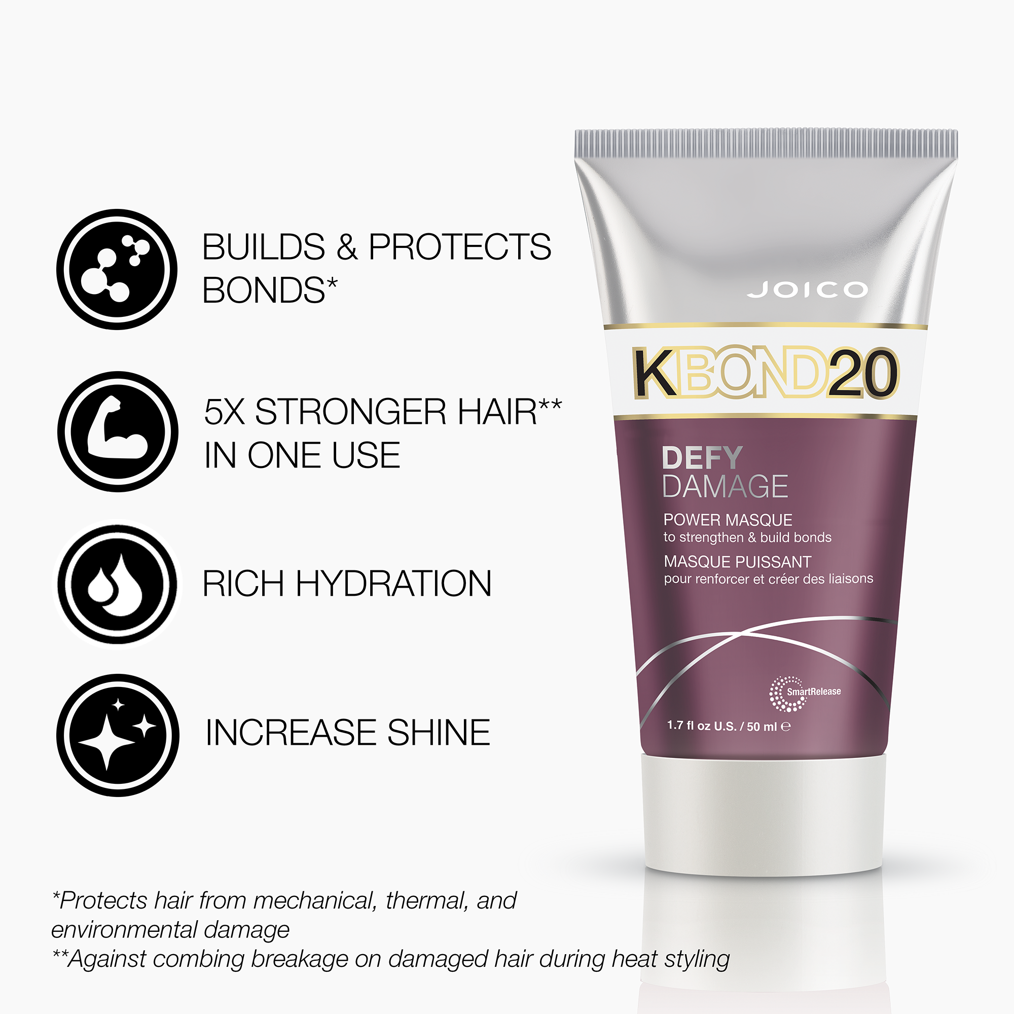 Meet KBOND20, power masque from Defy Damage, Joico's bond-building treatment that doubles down on technology for 5X stronger* hair. (*Against combing breakage on damaged hair during heat styling).