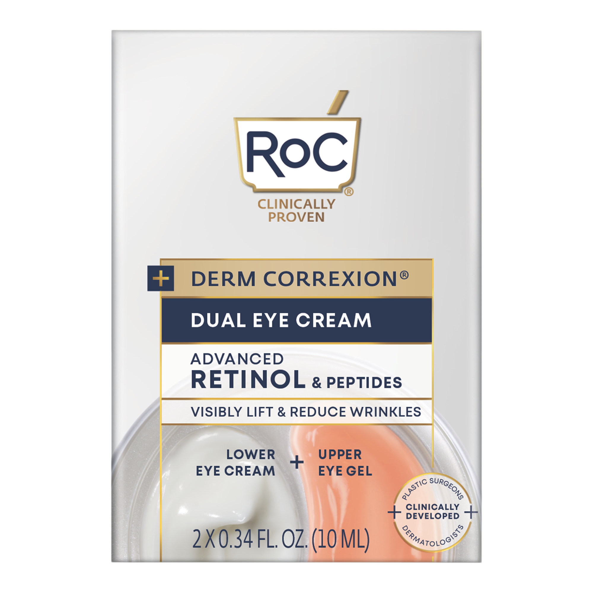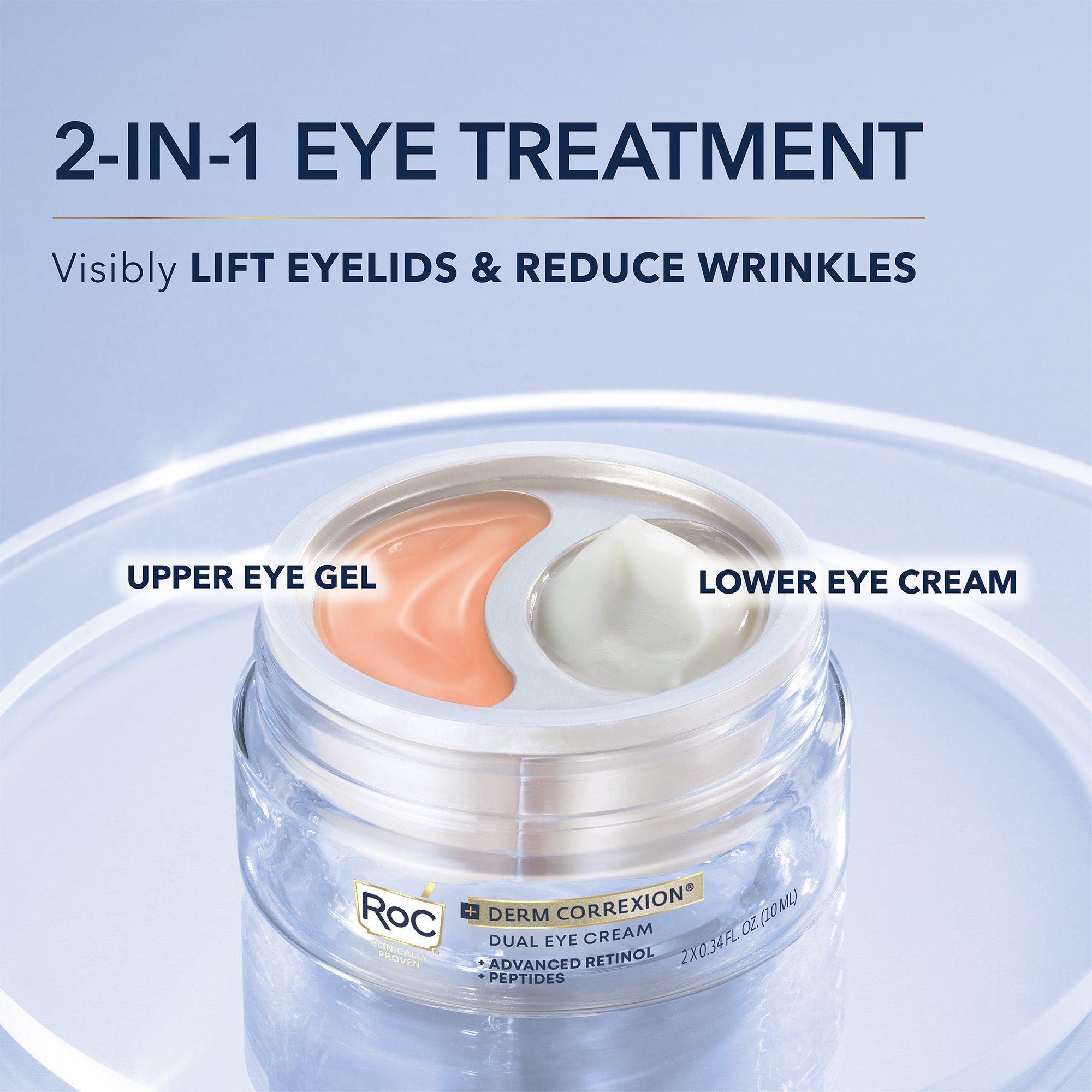 RoC Derm Correxion Dual Eye Cream is a gentle, yet effective 2-in-1 eye duo powered by retinol and peptides. This non-drying formula is specifically engineering for the delicate eye area and clinically proven to firm and lift the upper eye lid, while addressing lower eye concerns.