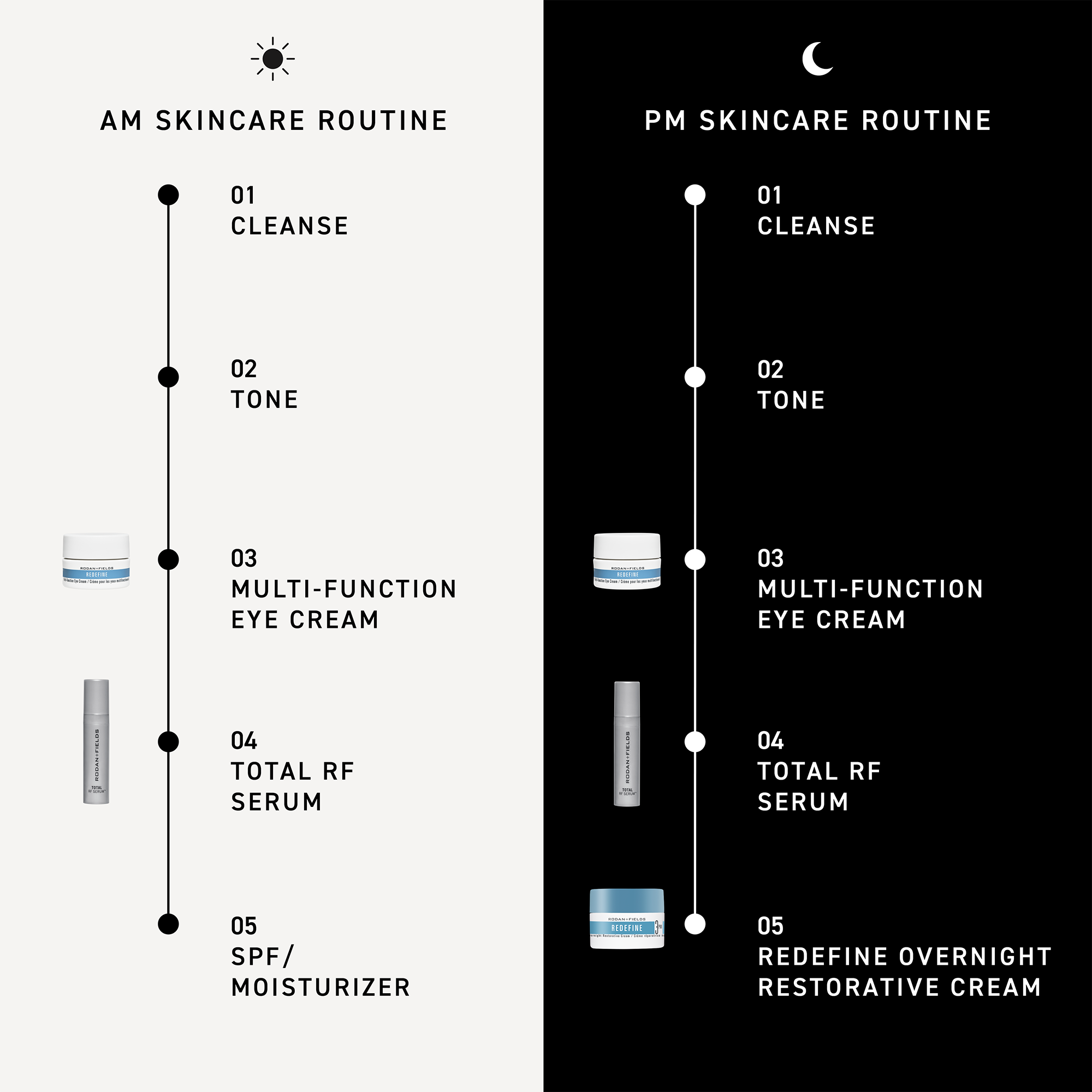 Total RF SerumTM: Apply evenly over face every AM + PM after cleansing + toning and before moisturizing. Avoid eye area. Redefine Overnight Restorative Cream: Every PM, apply liberally and evenly over face + neck. Avoid eye area.