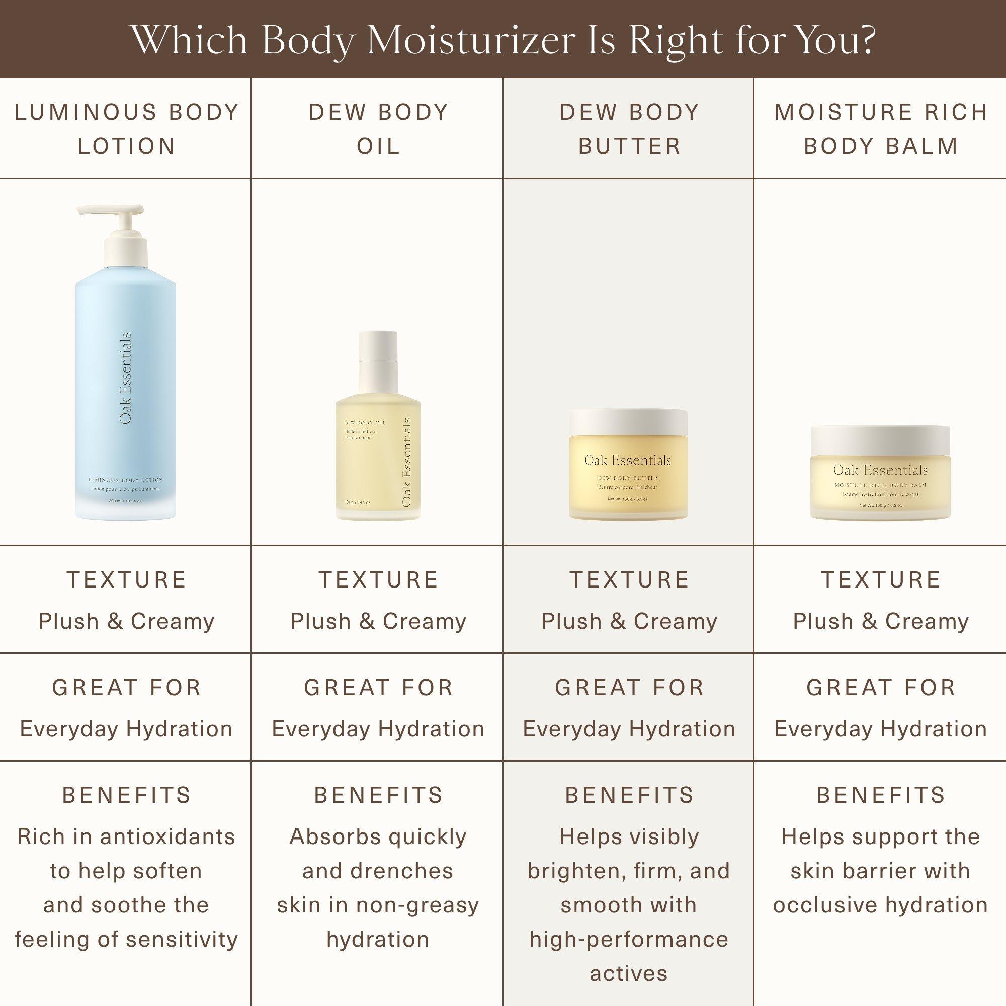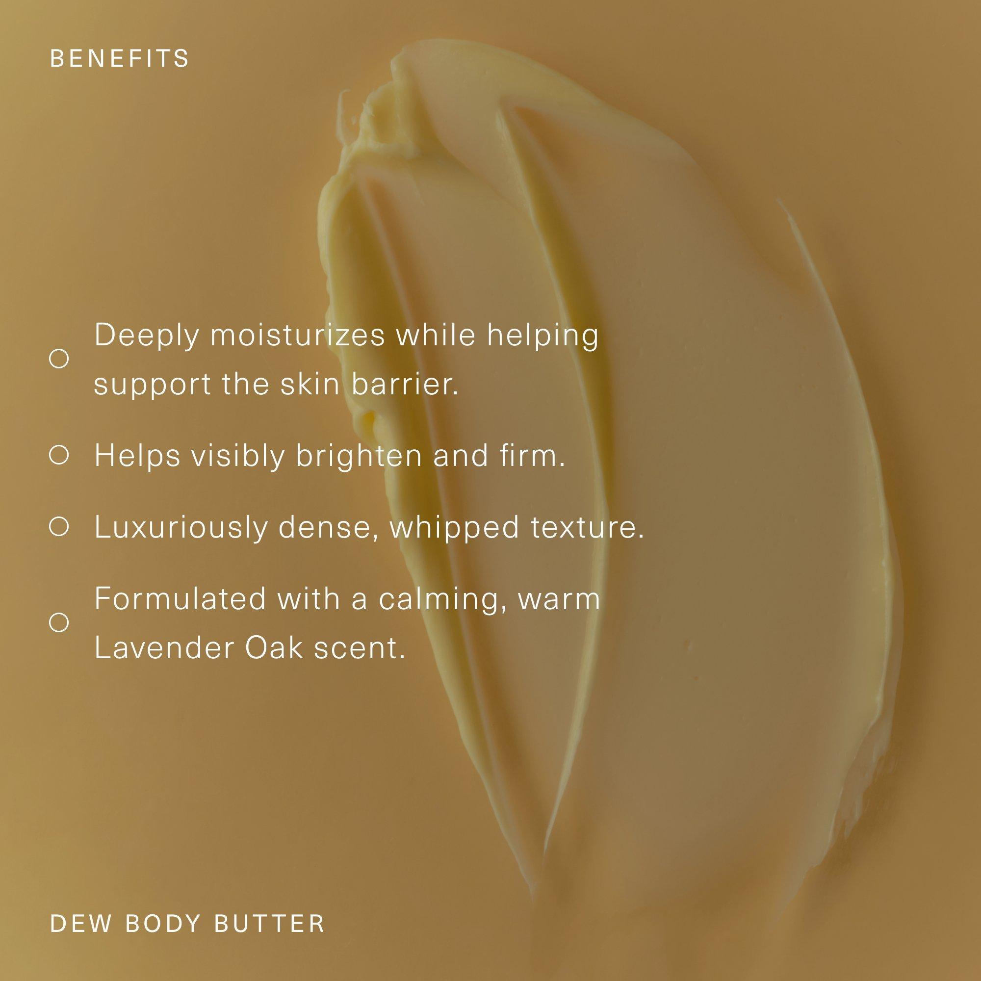 Use AM and PM daily. Massage into dry or damp skin. For added softness and glow, mix with a few pumps of Dew Body Oil.