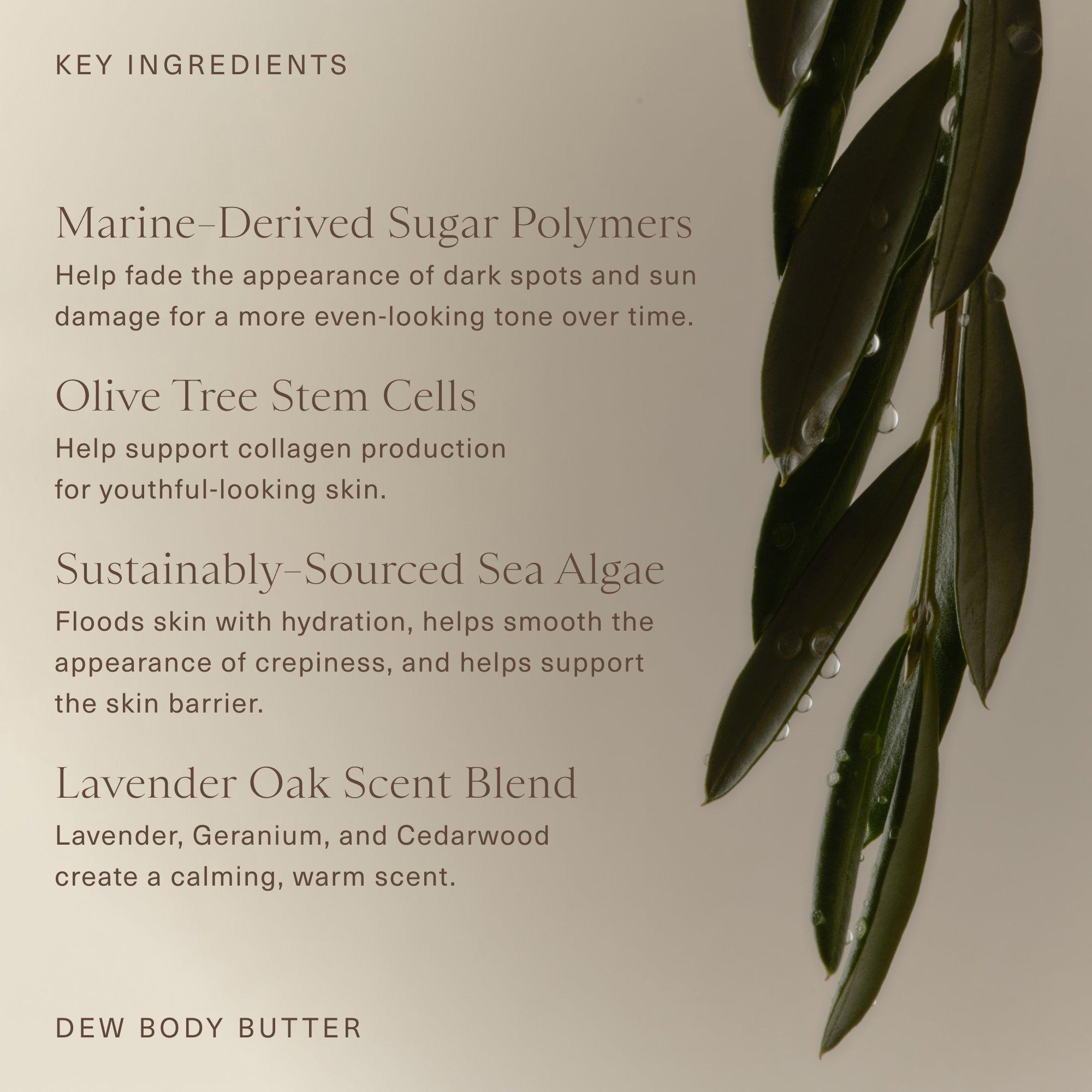 Oak Essentials' deeply moisturizing whipped body butter is powered by Olive Stem Cells and skin-renewing Sea Algae to help smooth the look of crepiness and improve the appearance of sun damage for firmer, more radiant skin. It has the same calming, warm scent as Oak's bestselling Dew Body Oil.