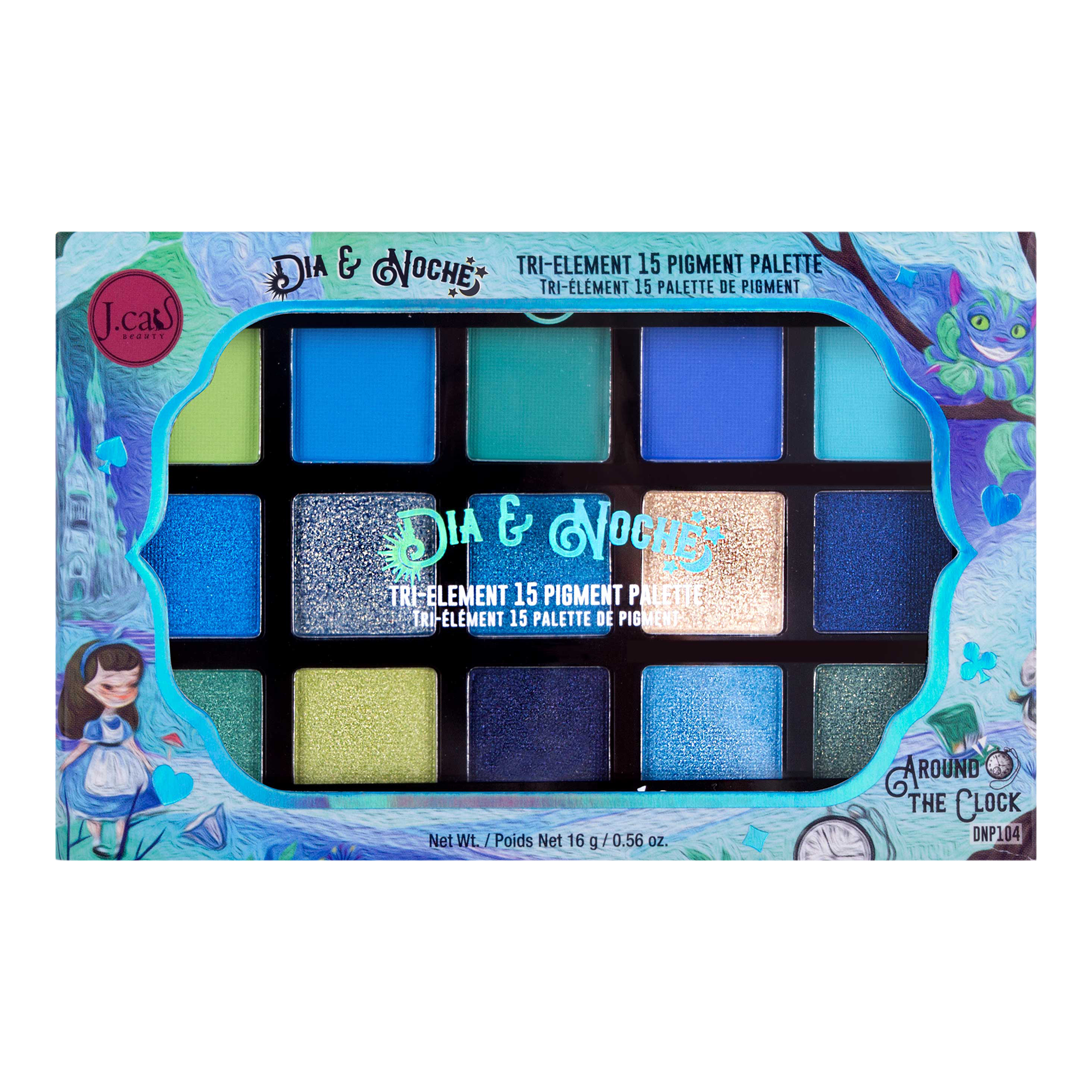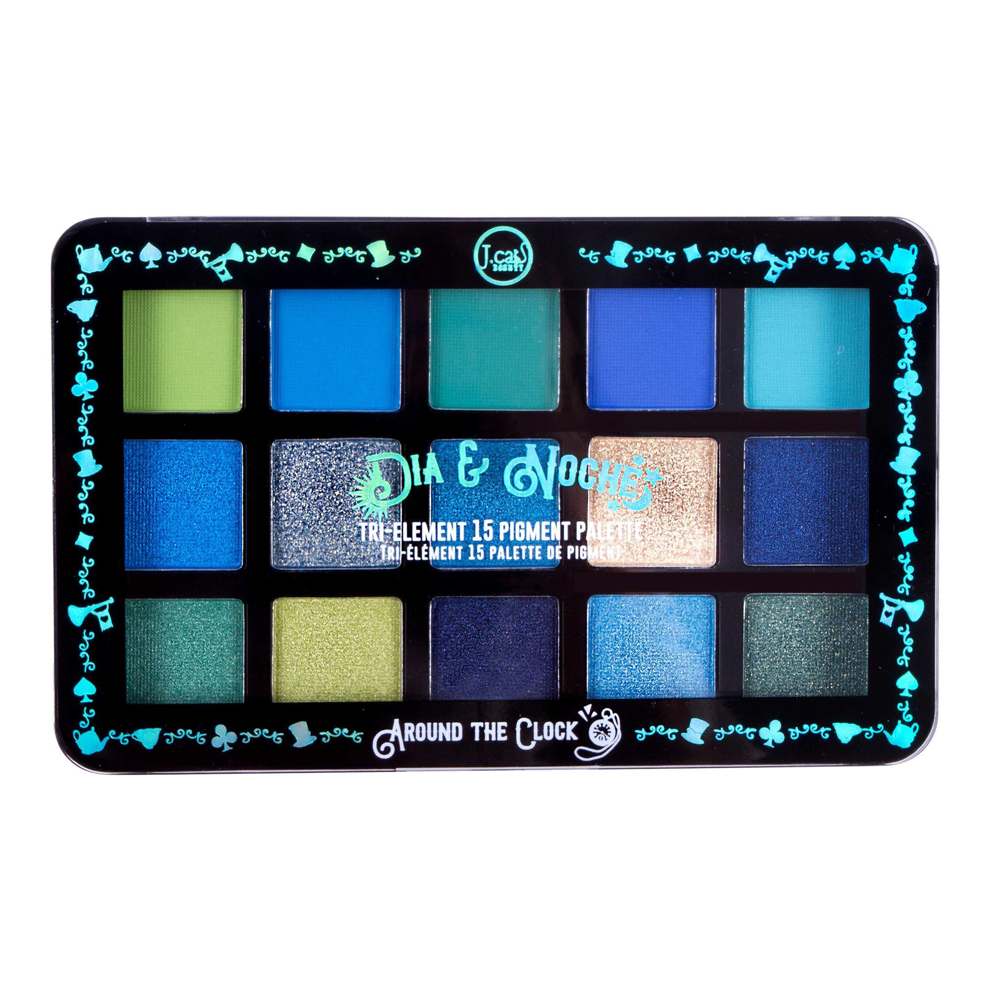 J. Cat Beauty Dia & Noche Tri-Element 15 Pigment Palette Around The Clock has all the blues and greens that are needed in a single palette to explore your creativity.