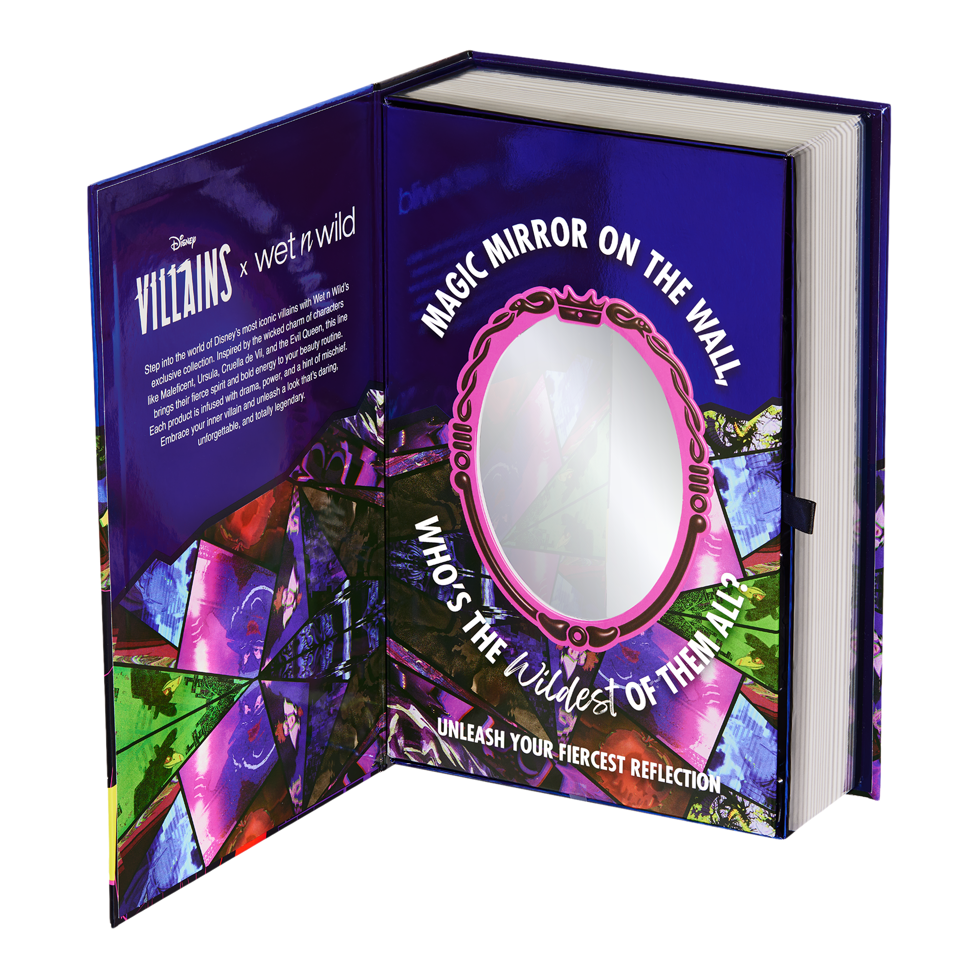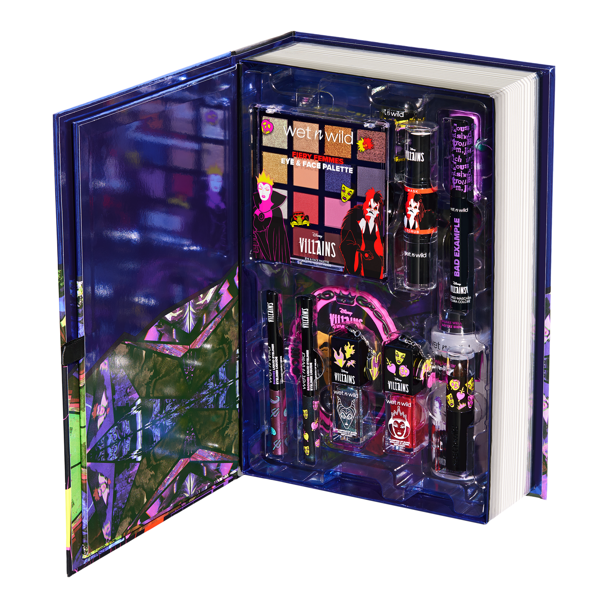 Open the cover, flip the page, and reveal the magic that lies within! This exclusive Disney Villains PR Box holds 14 of the most charming eye, face, lip and accessories products. Let the dark magic unfold with looks that are fearless, striking, and truly iconic.
