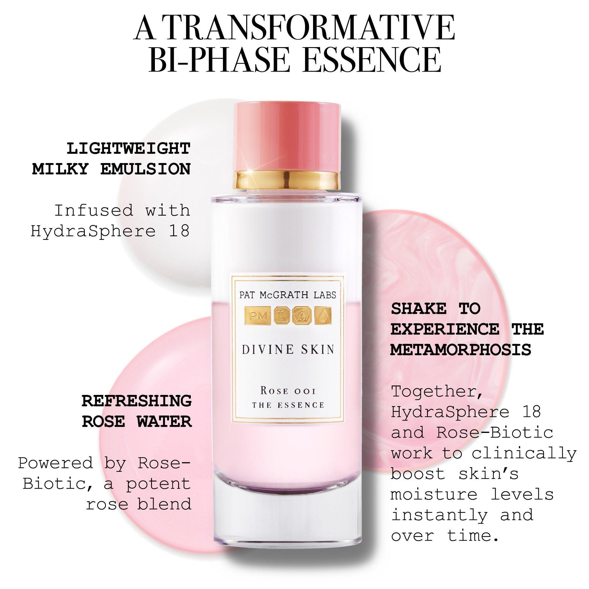 PAT McGRATH LABS Divine Skin: Rose 001 The Essence works instantly and over time to clinically boost moisture and help replenish the skin barrier. Skin is revitalised and perfectly prepared for flawless makeup application.