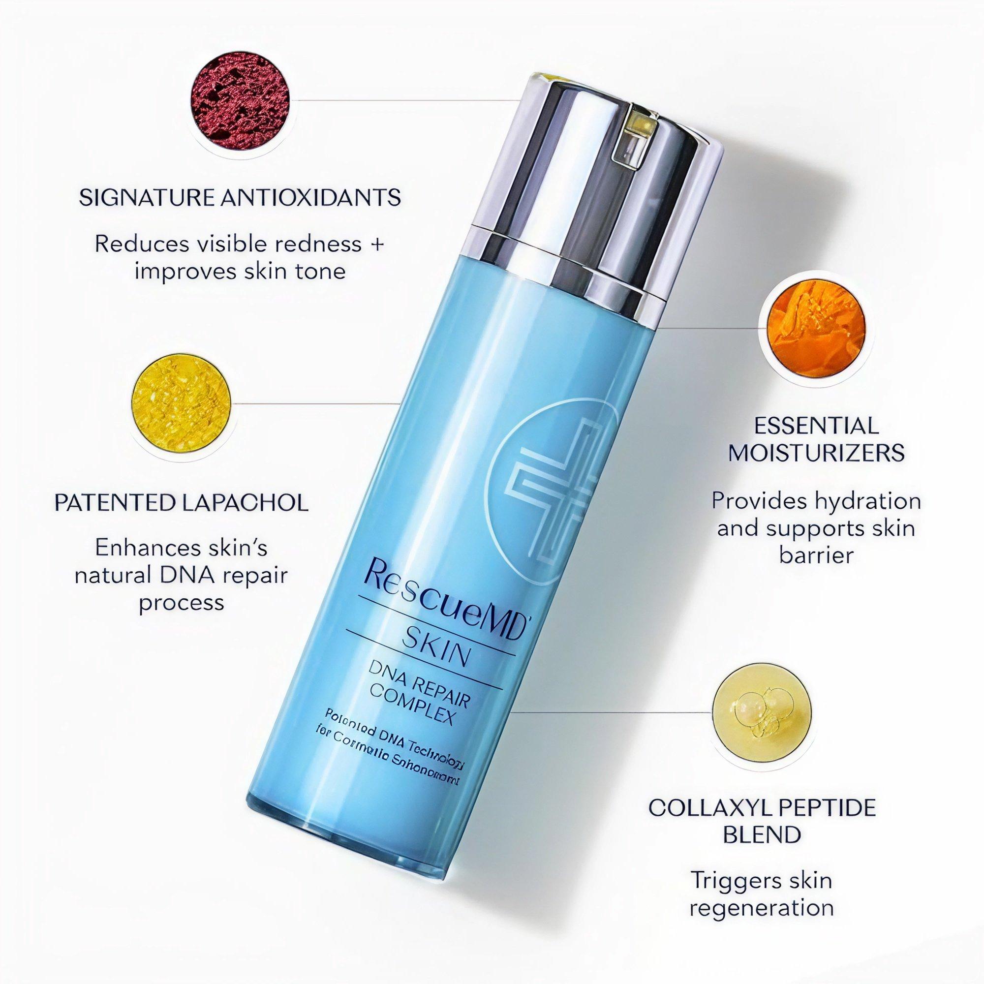 RescueMD DNA Repair Complex improves the appearance of redness, scars, hyperpigmentation, acne blemishes, and skin damage. This gentle, clinically tested serum uses a patented formulation to support the skin’s natural healing process for transformative results.