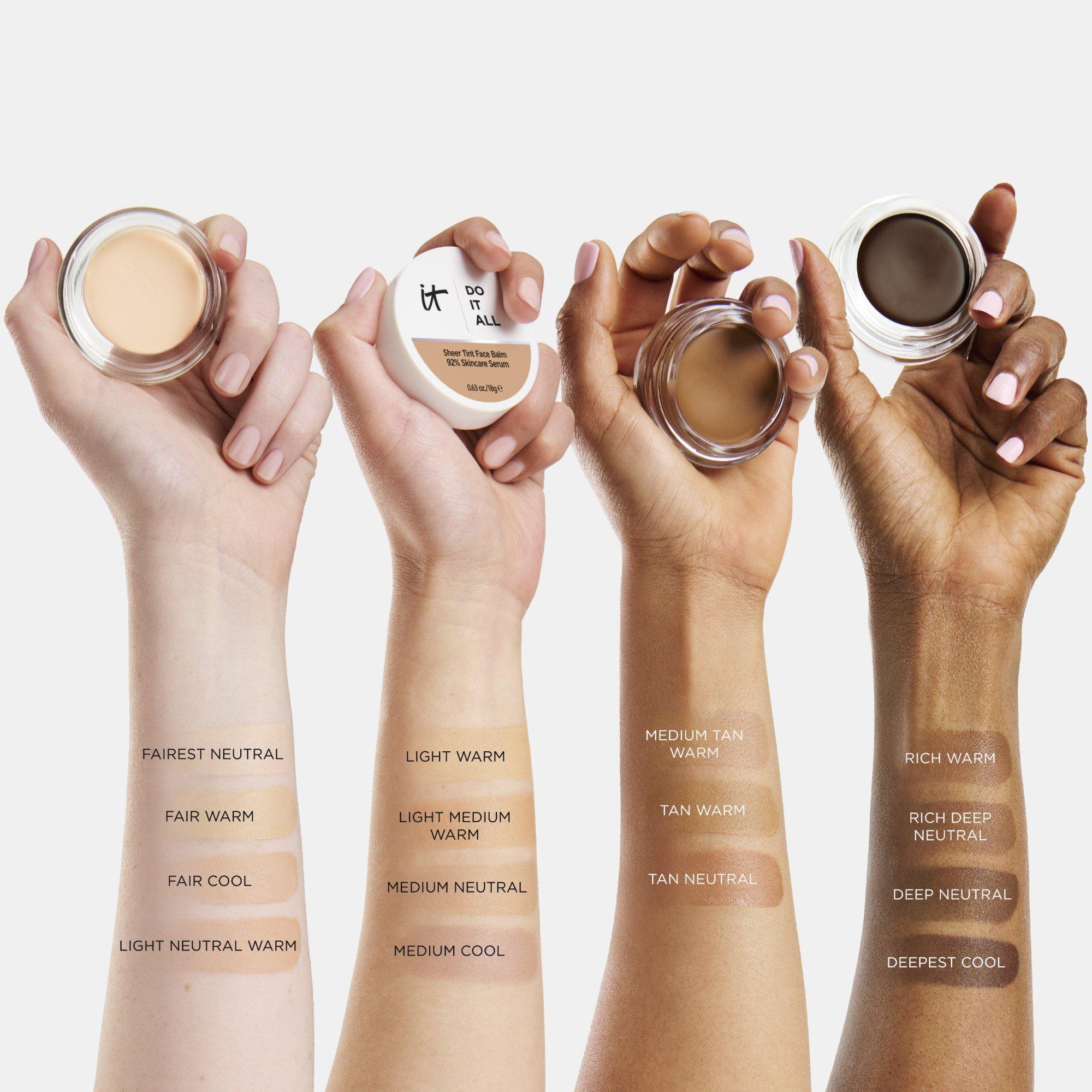 IT Cosmetics Do It All Sheer Tint Face Balm is your ultimate 4-in-1 tinted moisturizer that transforms skin instantly and over time. This next-generation serum combines sheer, buildable coverage with 92% skincare ingredients for a radiant look that firms, hydrates, and minimizes the look of lines.