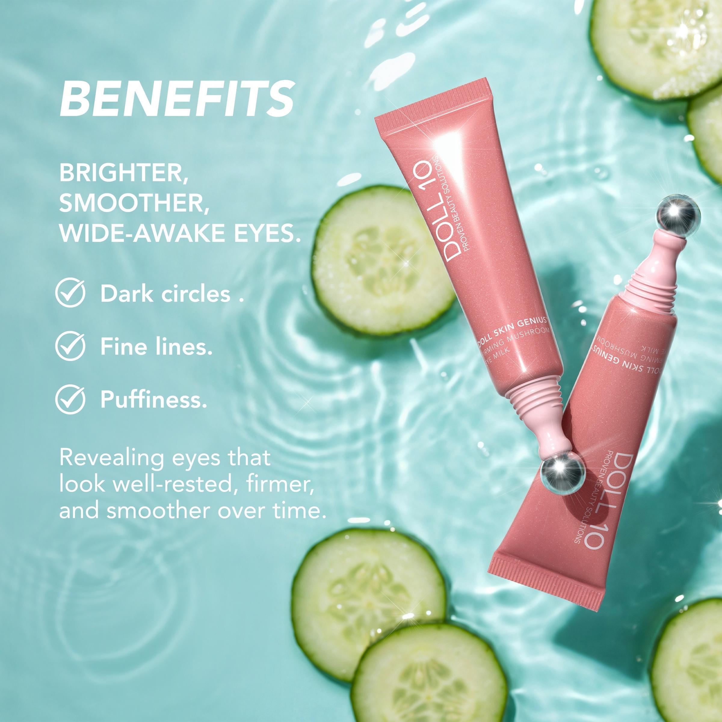 Doll Skin GeniusTM Firming Mushroom Eye Milk works to smooth and brighten the look of under eyes while diminishing the appearance of fine lines. Powered by skin-loving ingredients including Niacinamide, Peptides, Caffeine Extract, and Marshmallow Extract. Intentionally clean. Cruelty-Free.