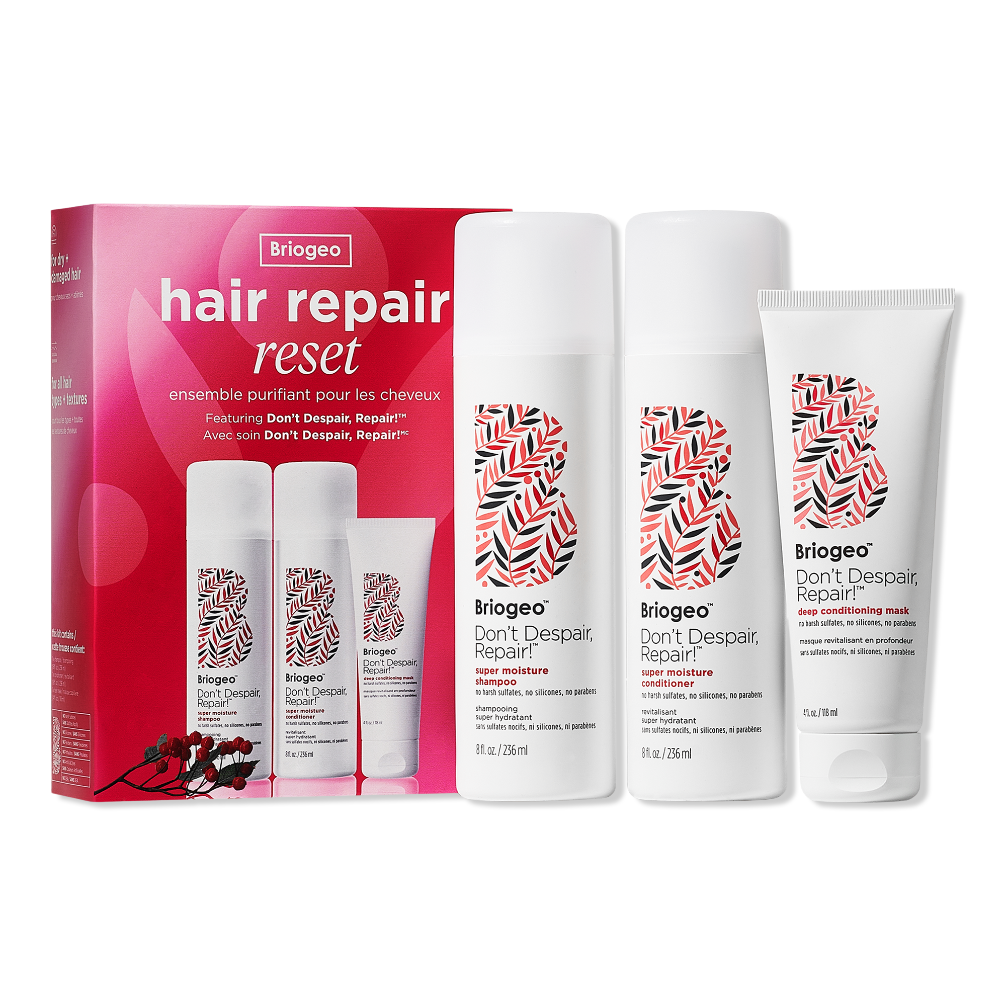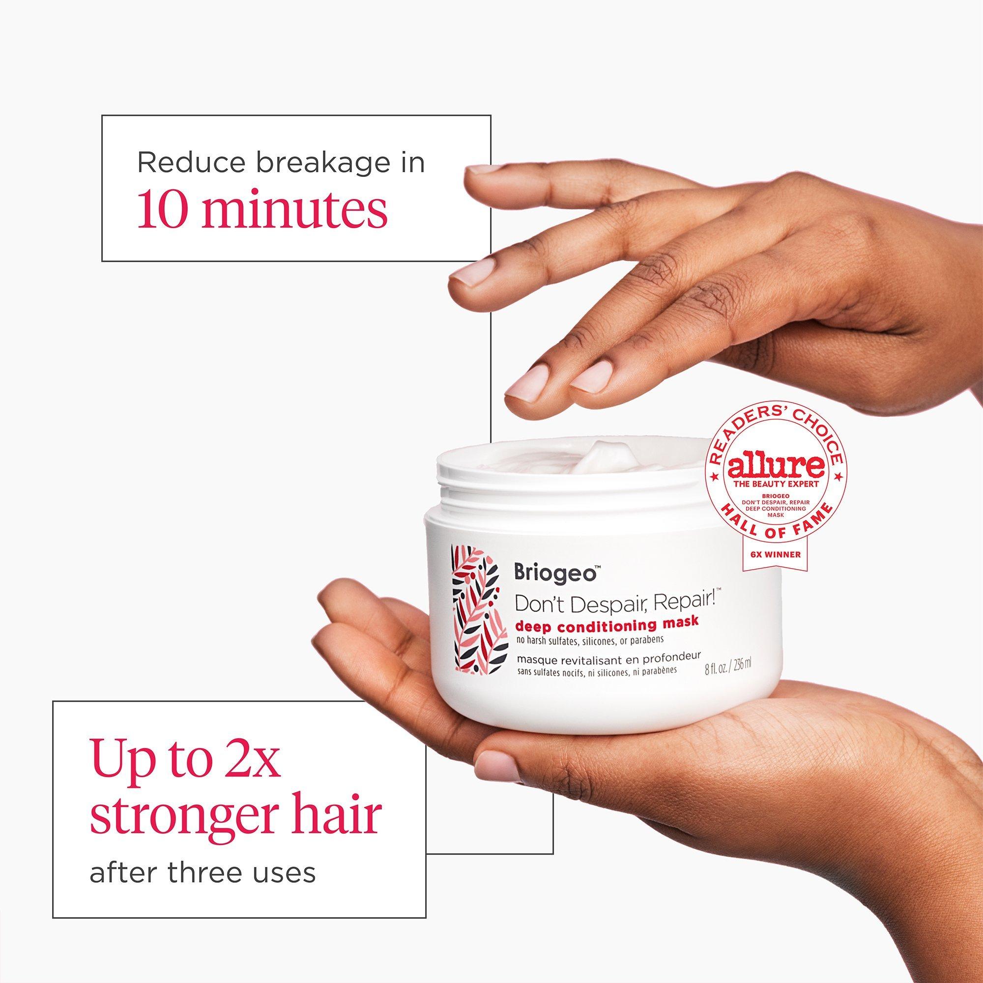 Briogeo's Don't Despair, Repair! Hair Repair Reset Kit features the award-winning Deep Conditioning Mask and Super Moisture Shampoo + Conditioner that work to strengthen and repair damaged hair.