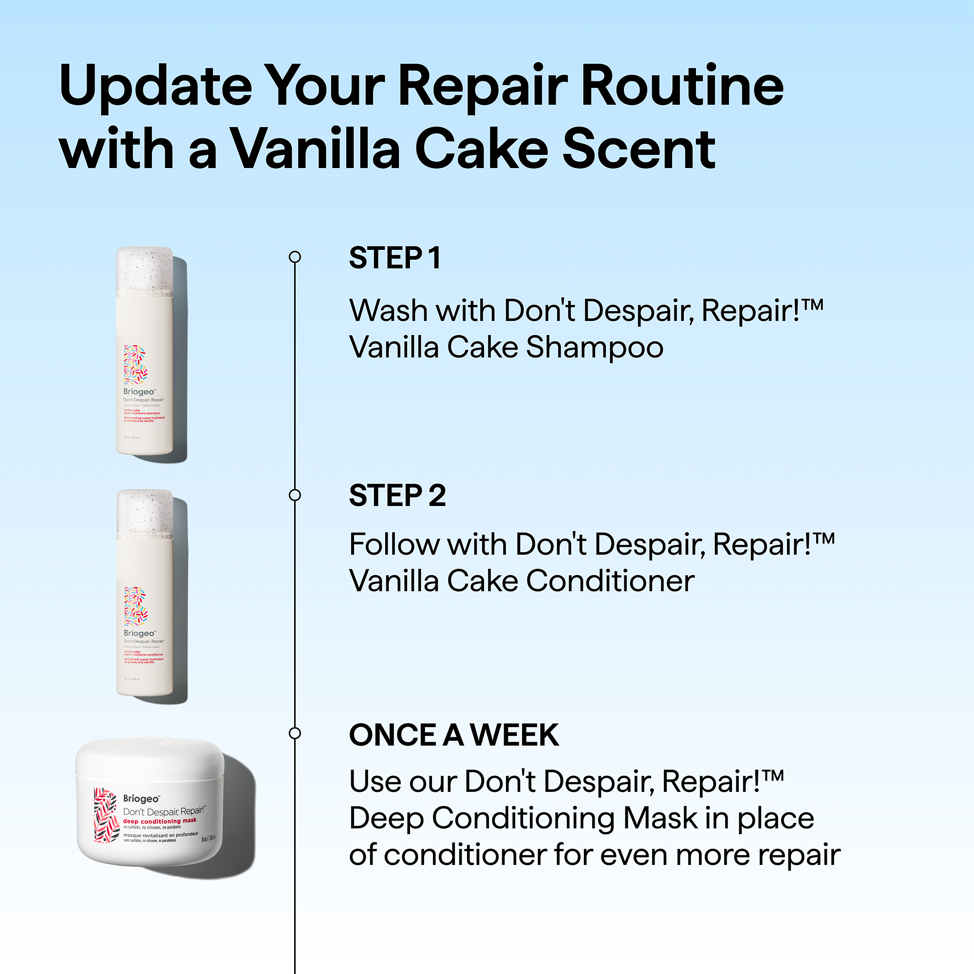 A limited-edition take on Briogeo's bestselling Don't Despair, Repair! Super Moisture Conditioner. The same hydrating, strand-strengthening formula you love, now with a gourmand vanilla cake scent.