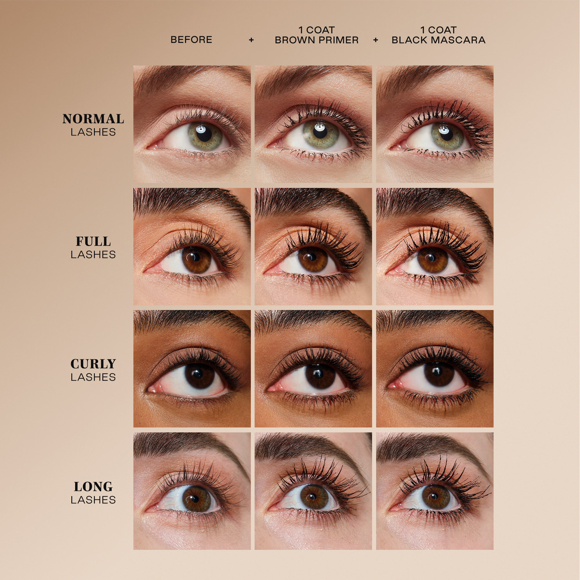 Use the precise elastomer-bristle to swipe on the brown primer for a natural, lengthened lash. Use the bold, wavy bristle brush to go bold with the black volumizer. Or layer them up for full-on lash impact. Build to your desired drama.