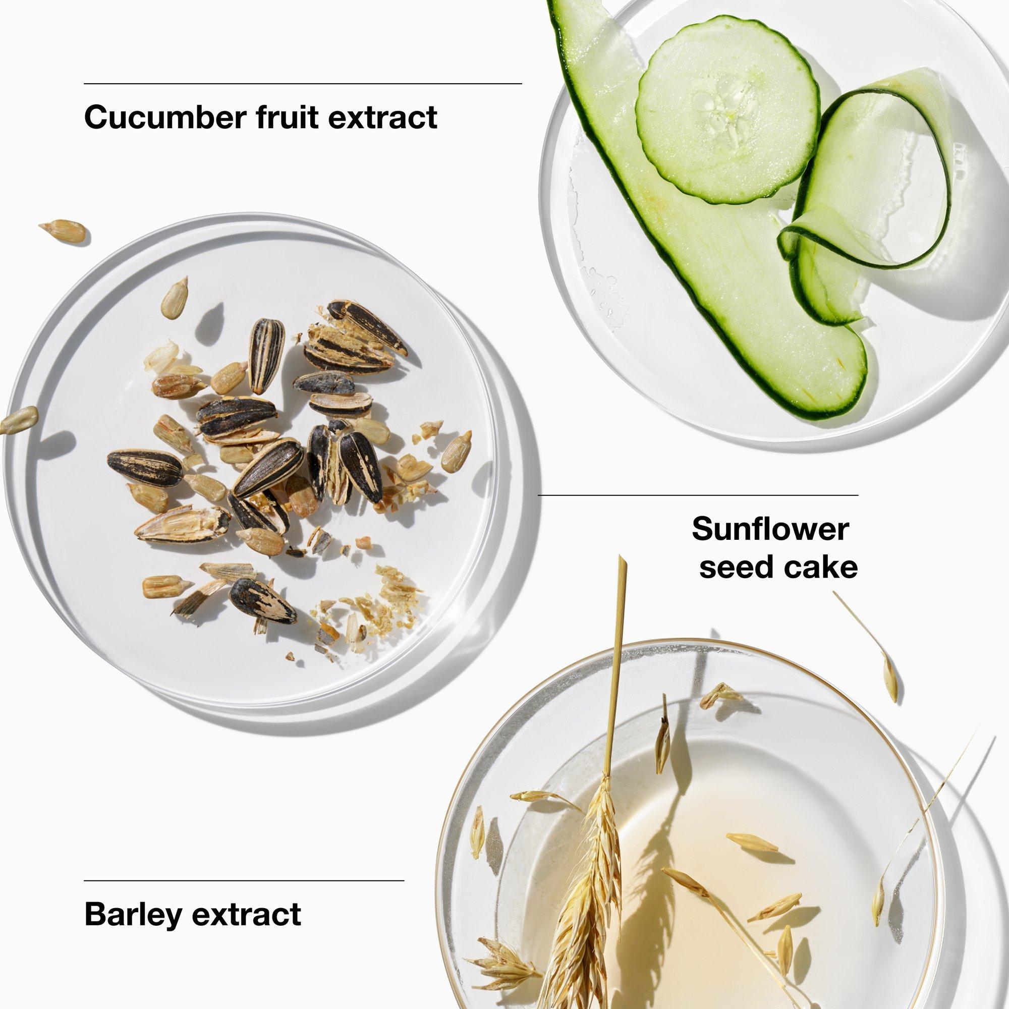 • Sunflower seed cake, barley extract, and cucumber fruit extract help strengthen skin's barrier, improve its resiliency, and balance and retain skin's moisture levels.