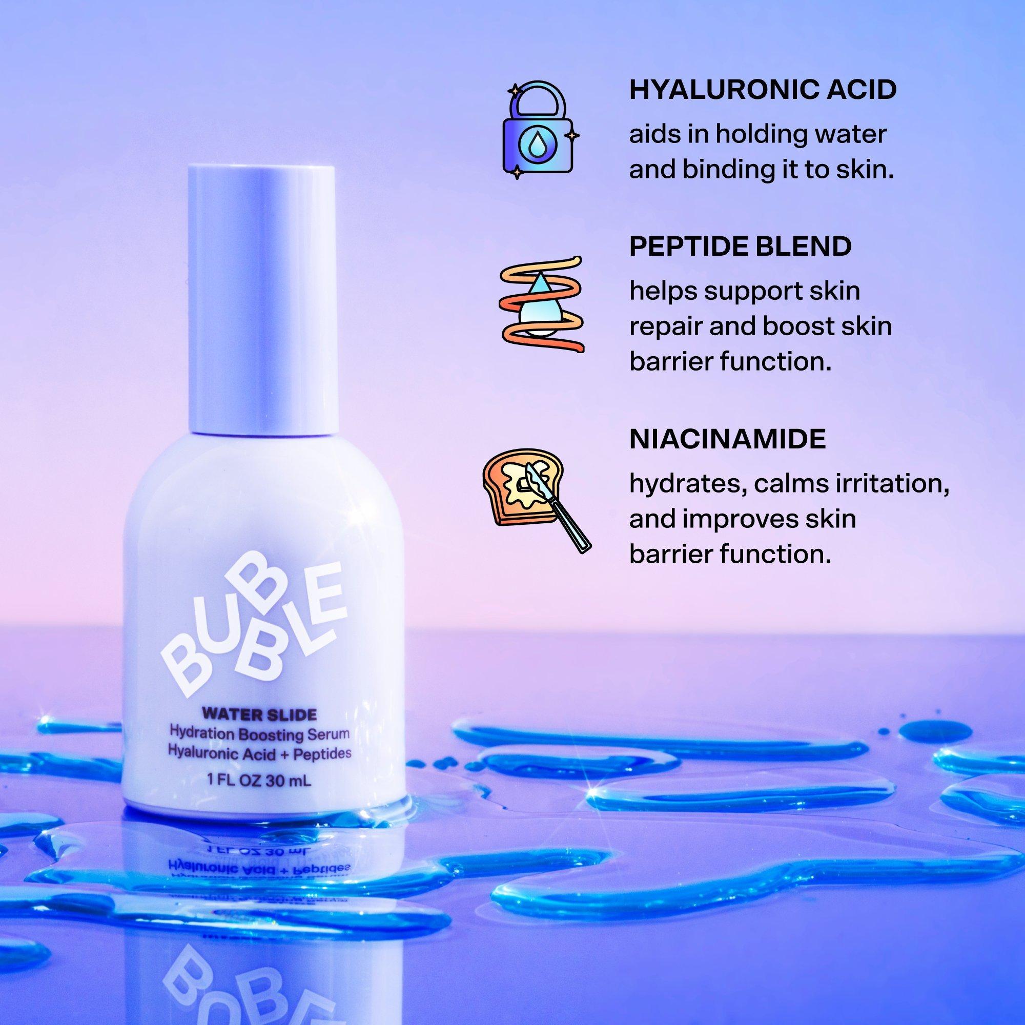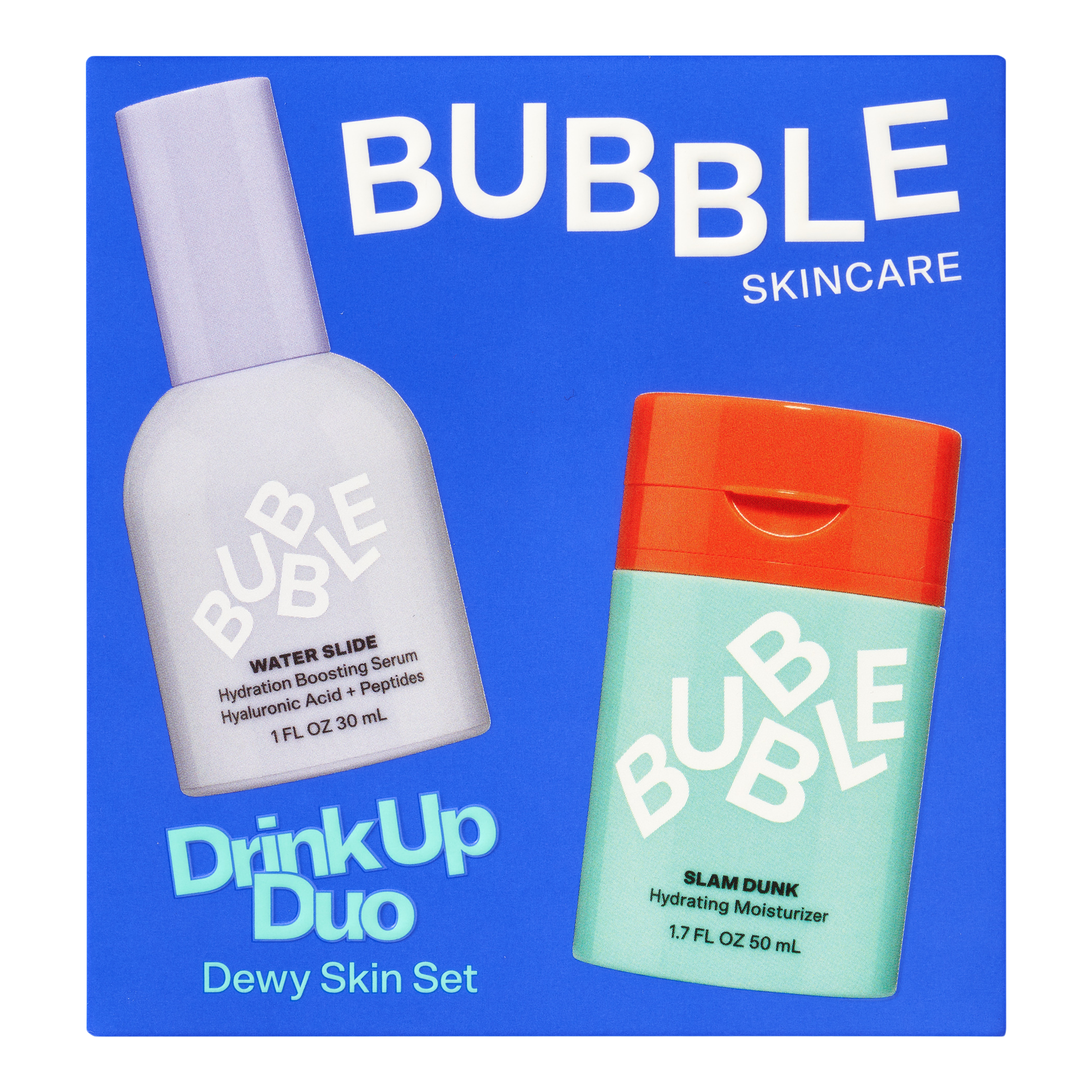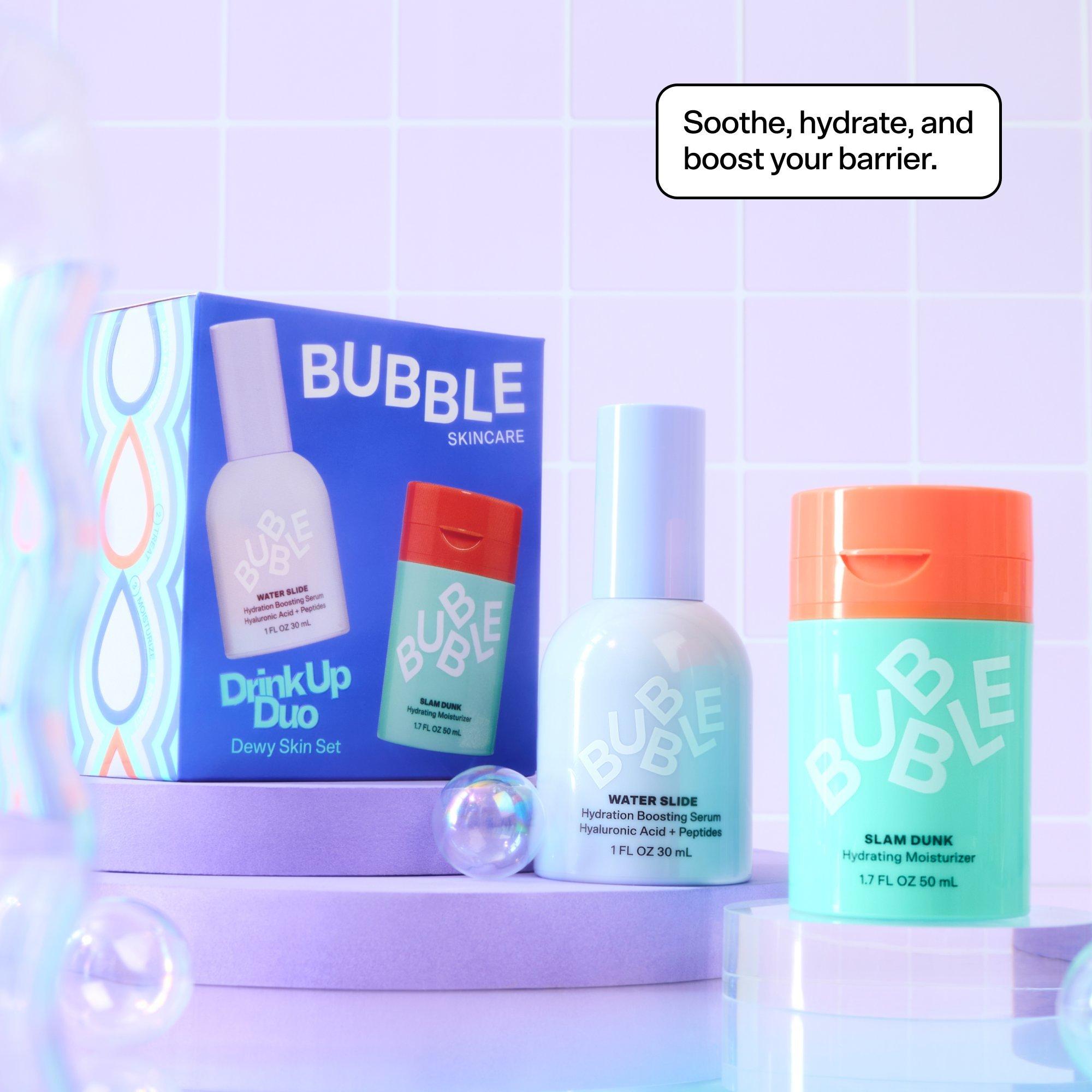 Meet the dynamic duo of drench. Bubble's Drink Up Duo Dewy Skin Set contains a 2-step routine that leaves skin fresh, plump, and dewy. Slam Dunk soothes and calms, while Water Slide draws water into skin and supports barrier function. You can even mix them together for a super skincare smoothie!