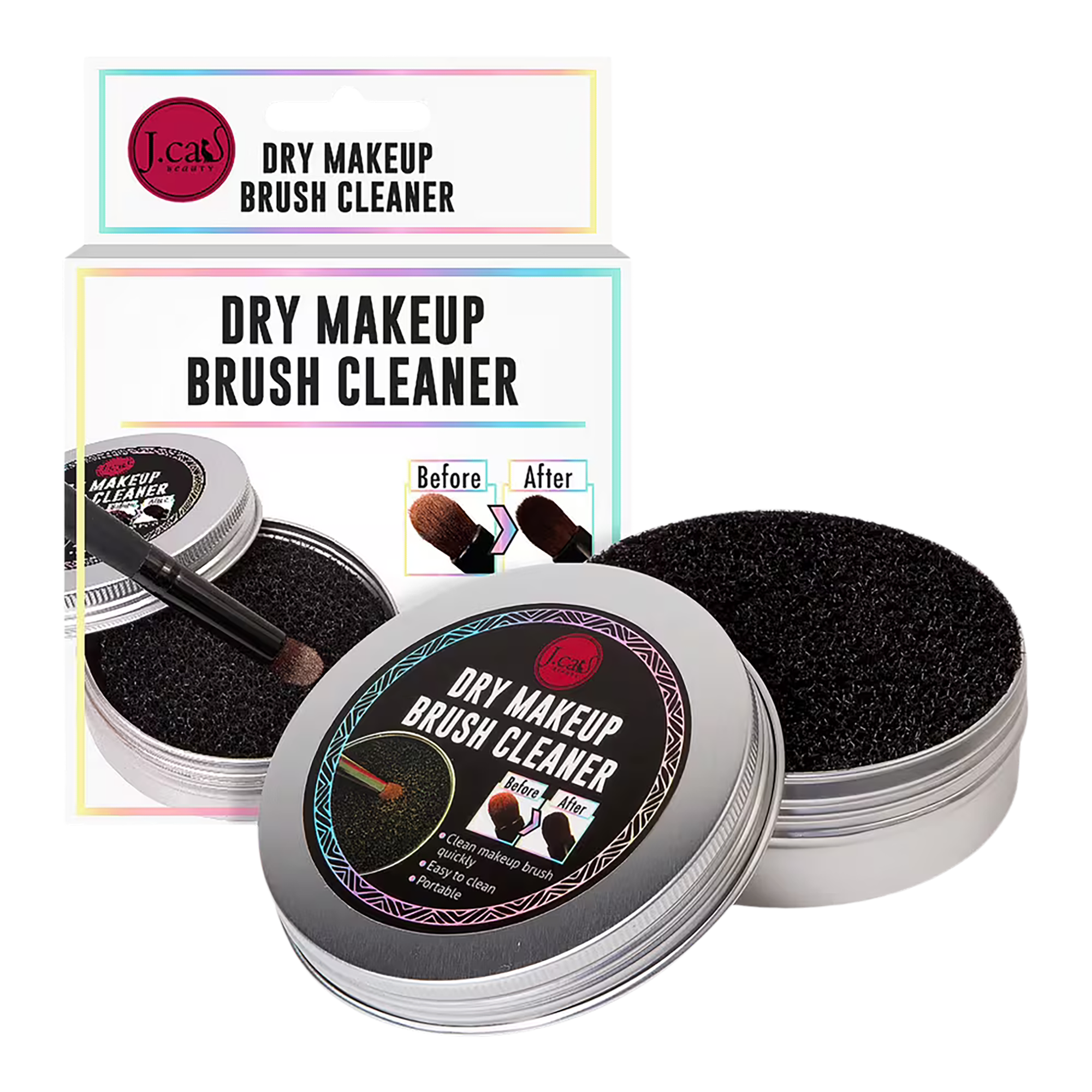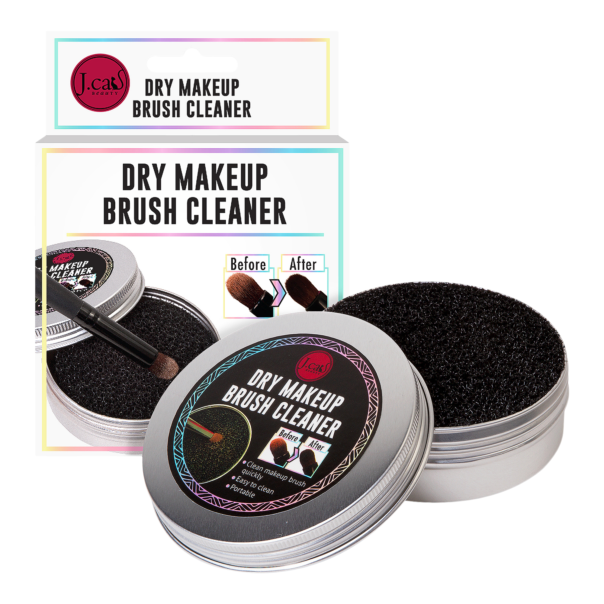 J.Cat Beauty's Dry Makeup Brush Cleaner gently removes makeup pigment residue quickly without changing makeup brushes.