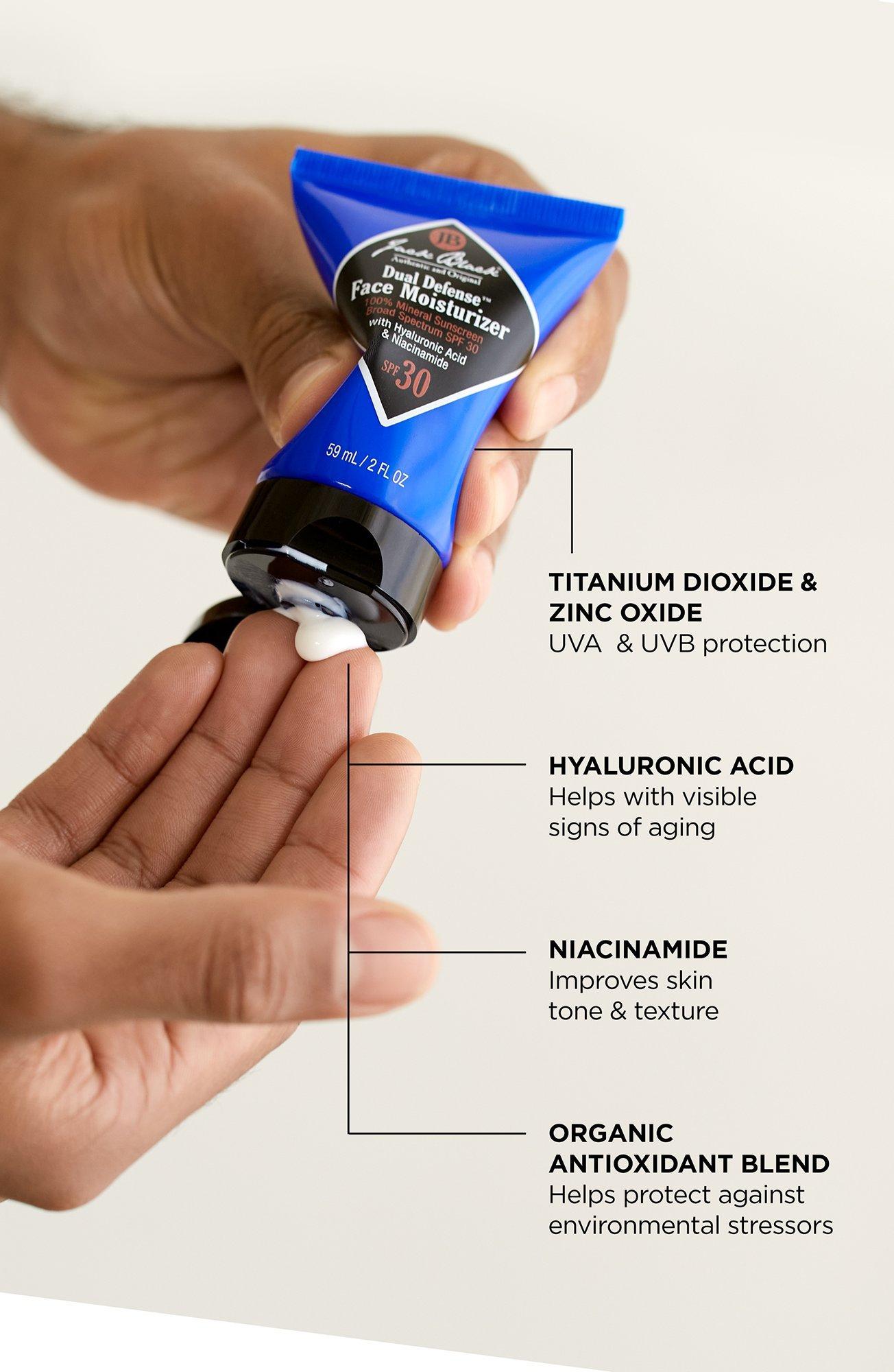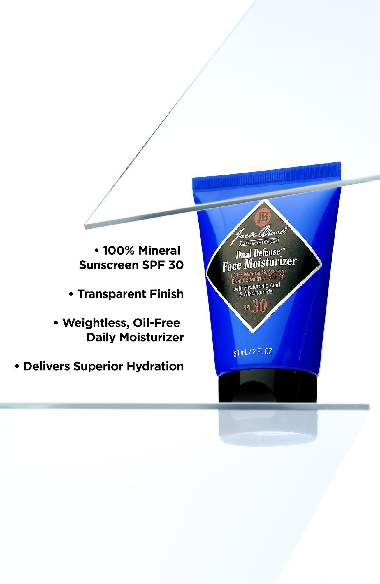 Jack Black's Dual Defense Face Moisturizer is a weightless, oil-free daily moisturizer with 100% mineral sunscreen SPF 30 that provides hydration and protection from UVA and UVB exposure with a transparent finish. No chemical filters. Suitable for all skin types, including blemish-prone skin.