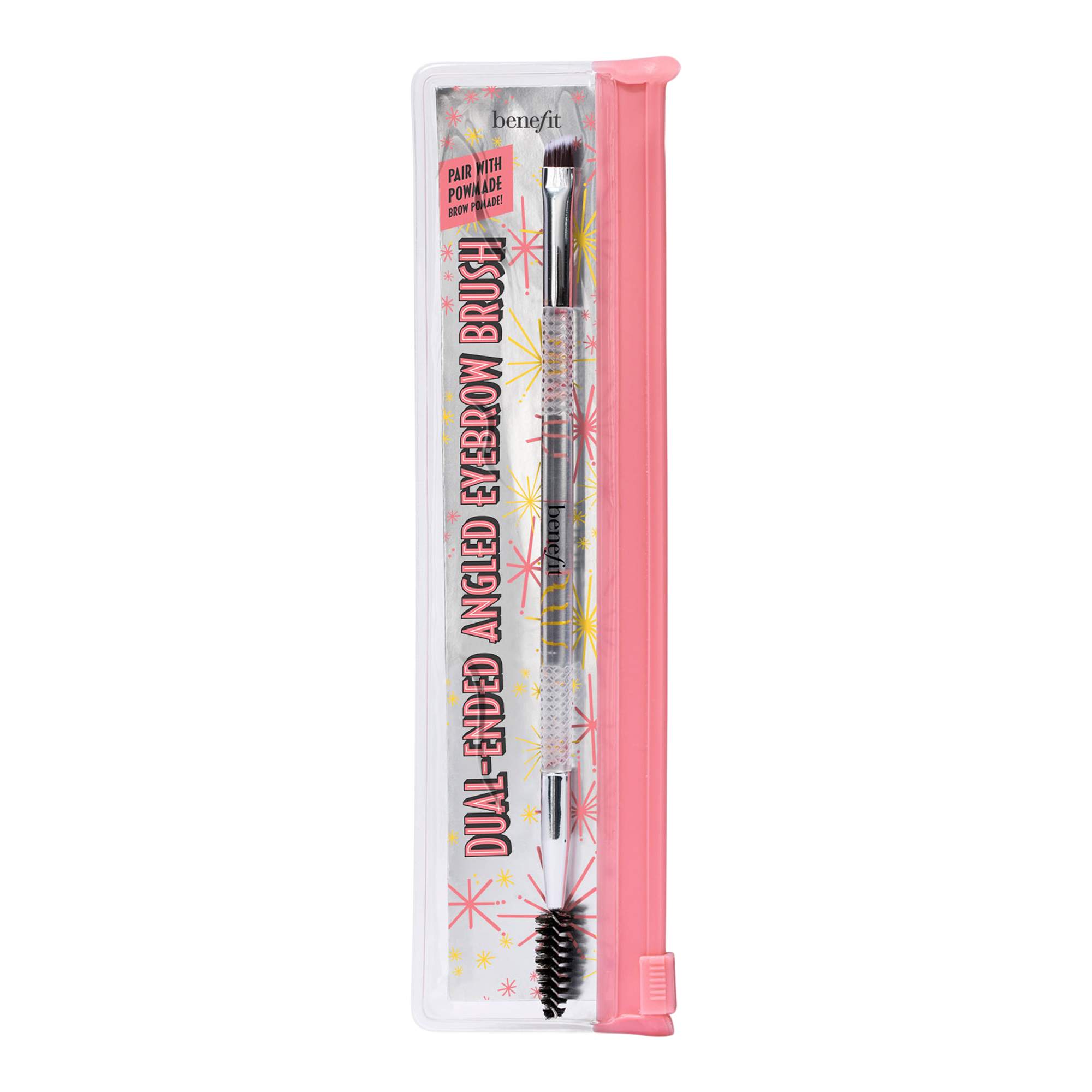 Expertly apply brow pomades, powders & waxes with ease! The Benefit's Dual-Ended Angled Eyebrow Brush features a brush made of silky synthetic fibers that form short, stiff bristles at a steep angle for precise, controlled application and a custom spoolie for smooth, seamless blending.