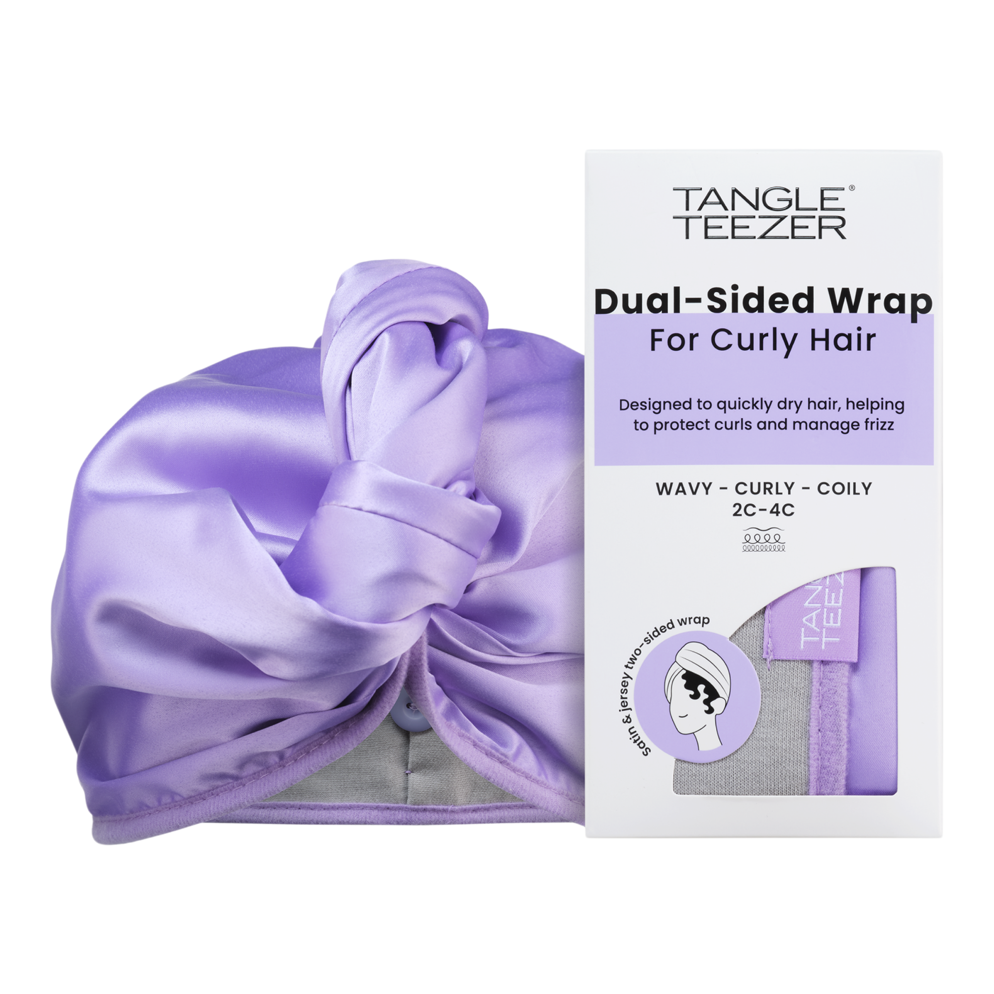 Calling all curls & coils: Tangle Teezer's Dual-Sided Hair Wrap keeps your pattern popping. The t-shirt like cotton side speeds up drying and the satin side protects while sleeping for defined, frizz-controlled curls. It’s your post-wash and overnight curl care wrapped up in one.
