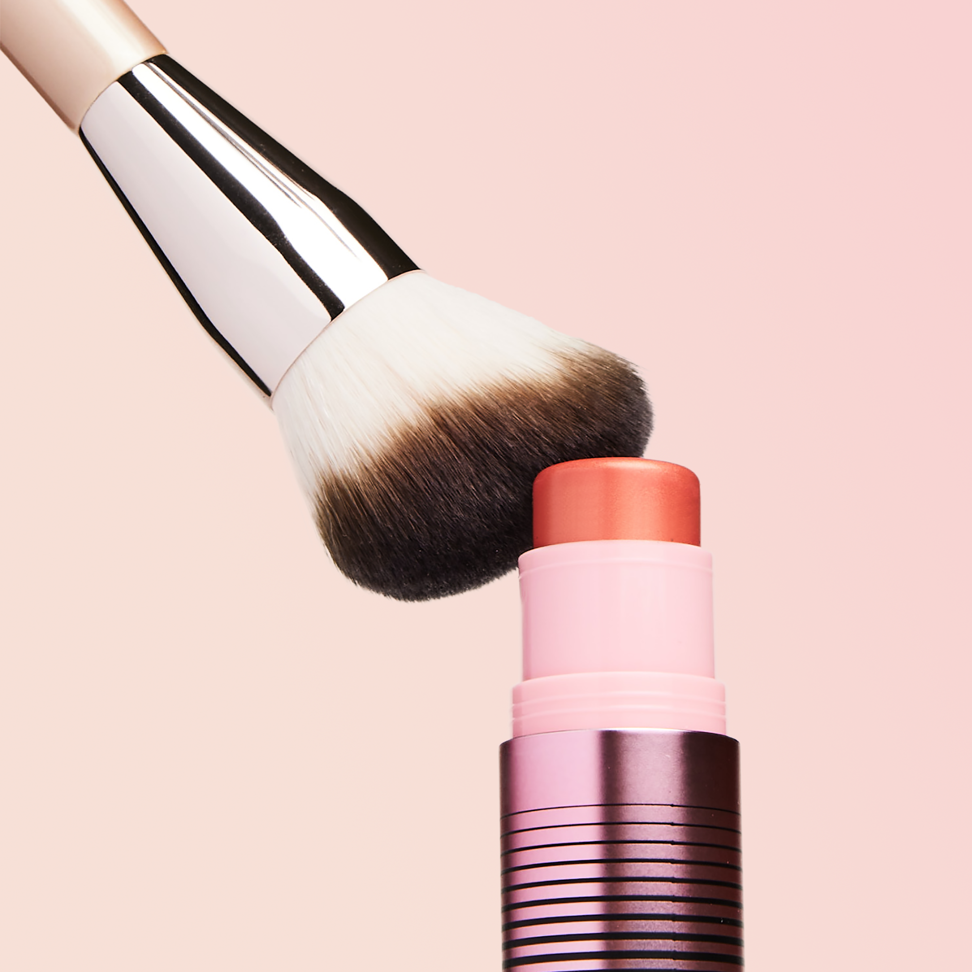 Blend, set \& build complexion products however you like, using the angled brush head for cream products and the larger rounded brush head for powder products.