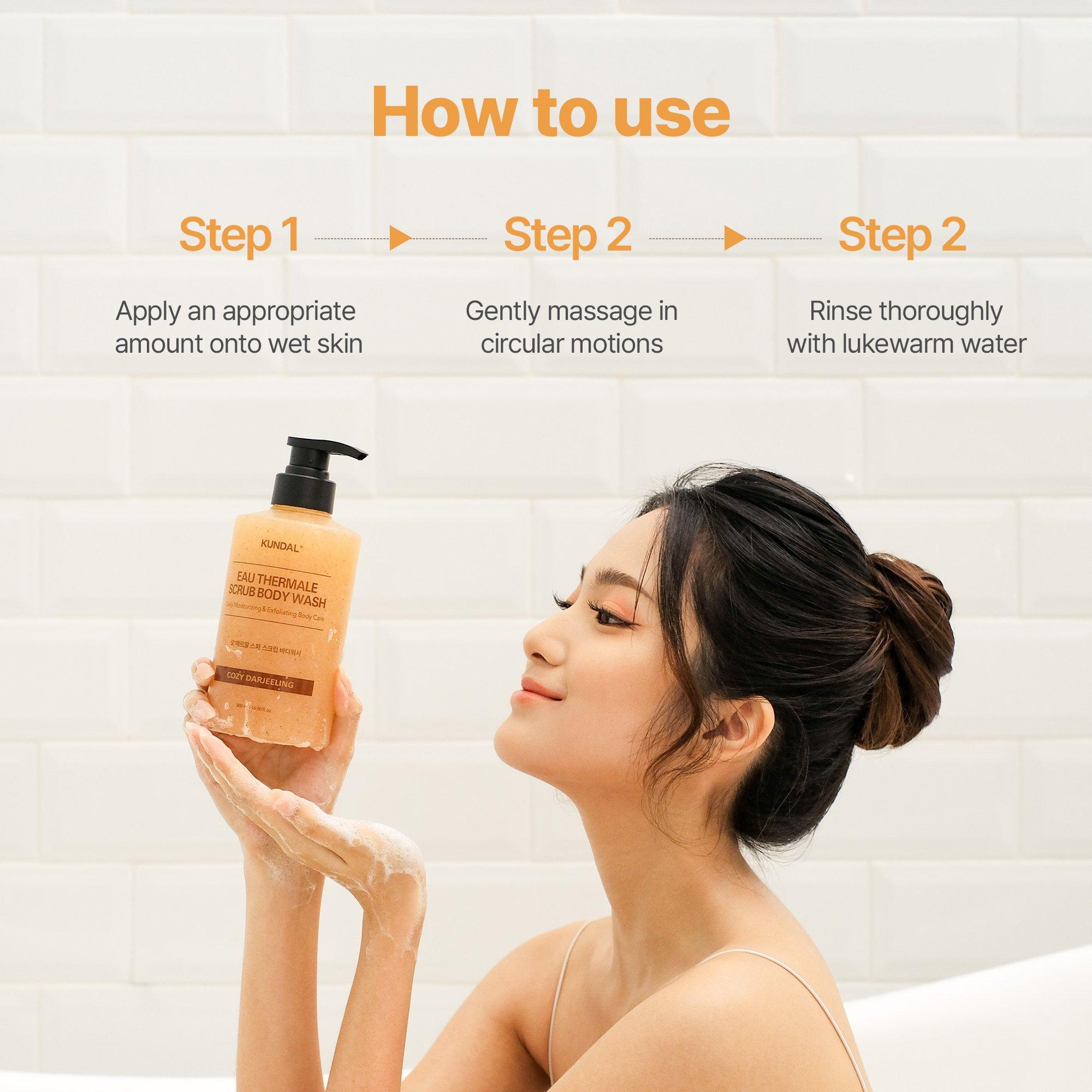 KUNDAL Eau Thermale Scrub Body Wash delivers daily exfoliating and moisturizing care to create a smoother skin texture.