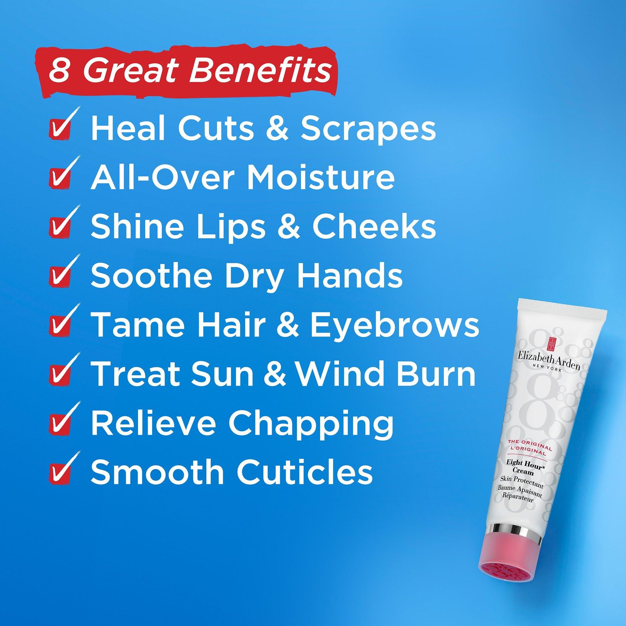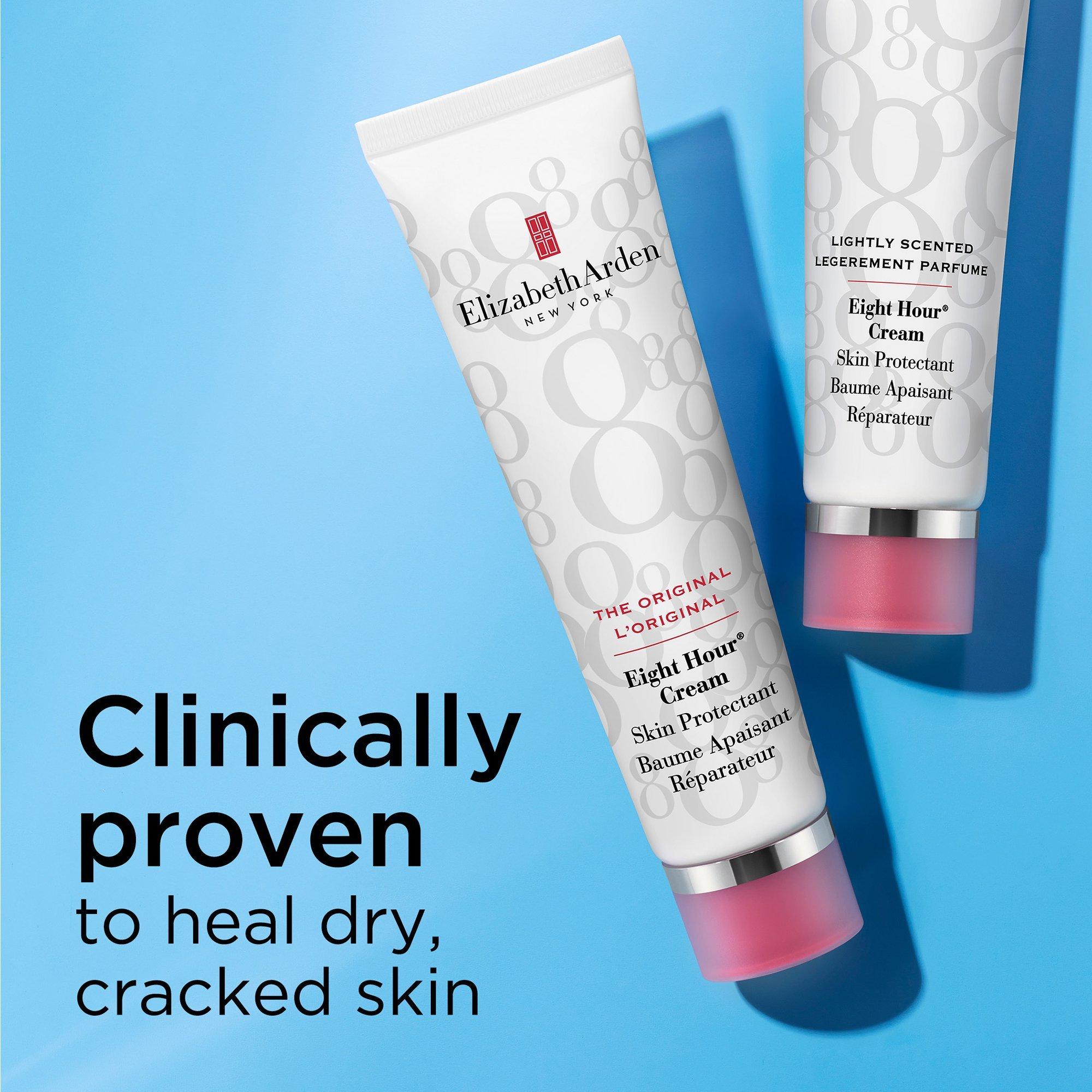 Elizabeth Arden's Eight Hour Cream Skin Protectant Lightly Scented works to intensely hydrate, smooth and soothe any way you choose. Use to moisturize face, body, shape brows, illuminates cheeks and smooths cuticles. Locks in moisture and helps safeguard skin from environmental exposure.