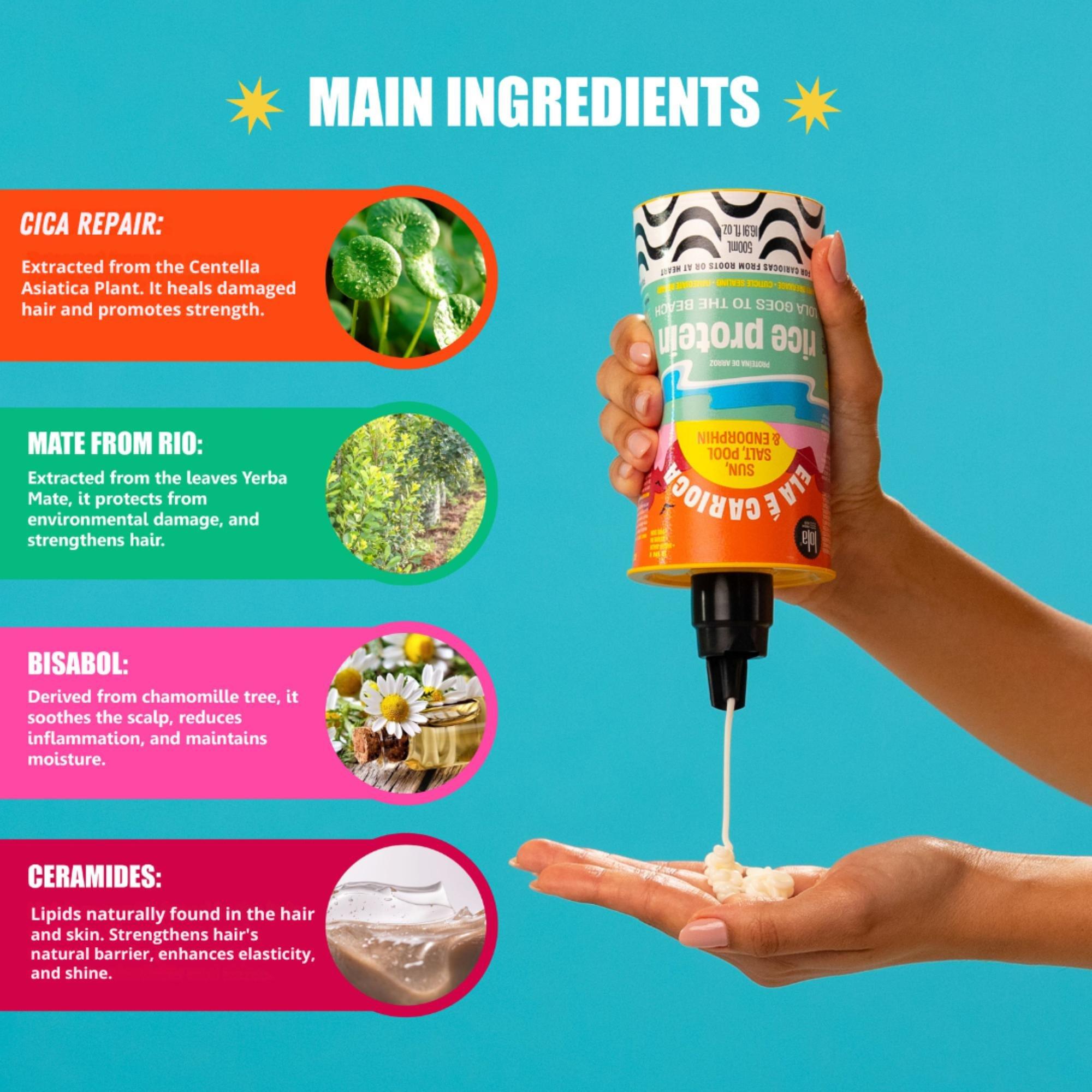 Overnight Balm: Apply Rice Protein evenly throughout damp hair. Leave in for at least 10 minutes or longer/overnight as desired. Rinse out, then apply Ela é Carioca Shampoo and Nourishing Hair Mask to complete your intensive treatment. For best results, use once a week. Sun Protection: Apply to dry or damp hair before or after sun exposure and after each plunge on the beach. Dose a pea-sized amount in your hands. Comb through lengths and ends. Leave In: Blend a small amount into your hands and apply evenly through damp hair—style as usual.