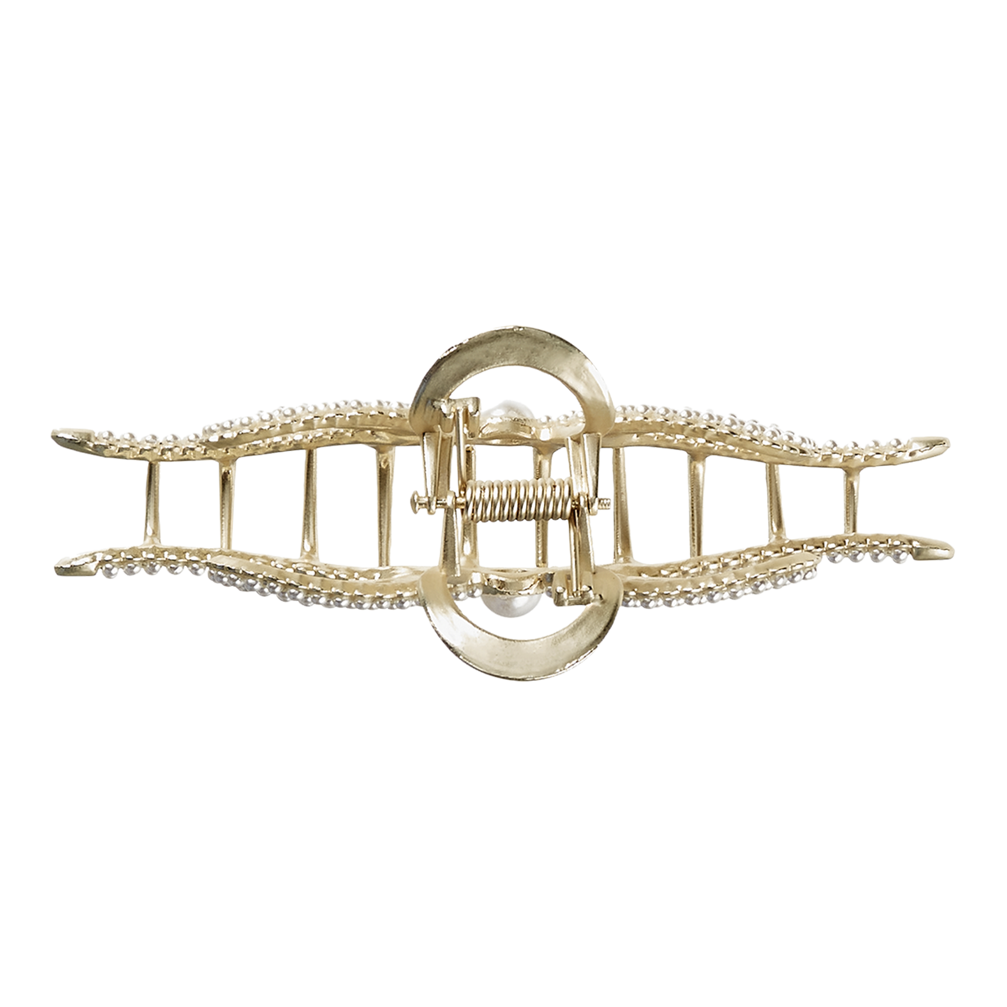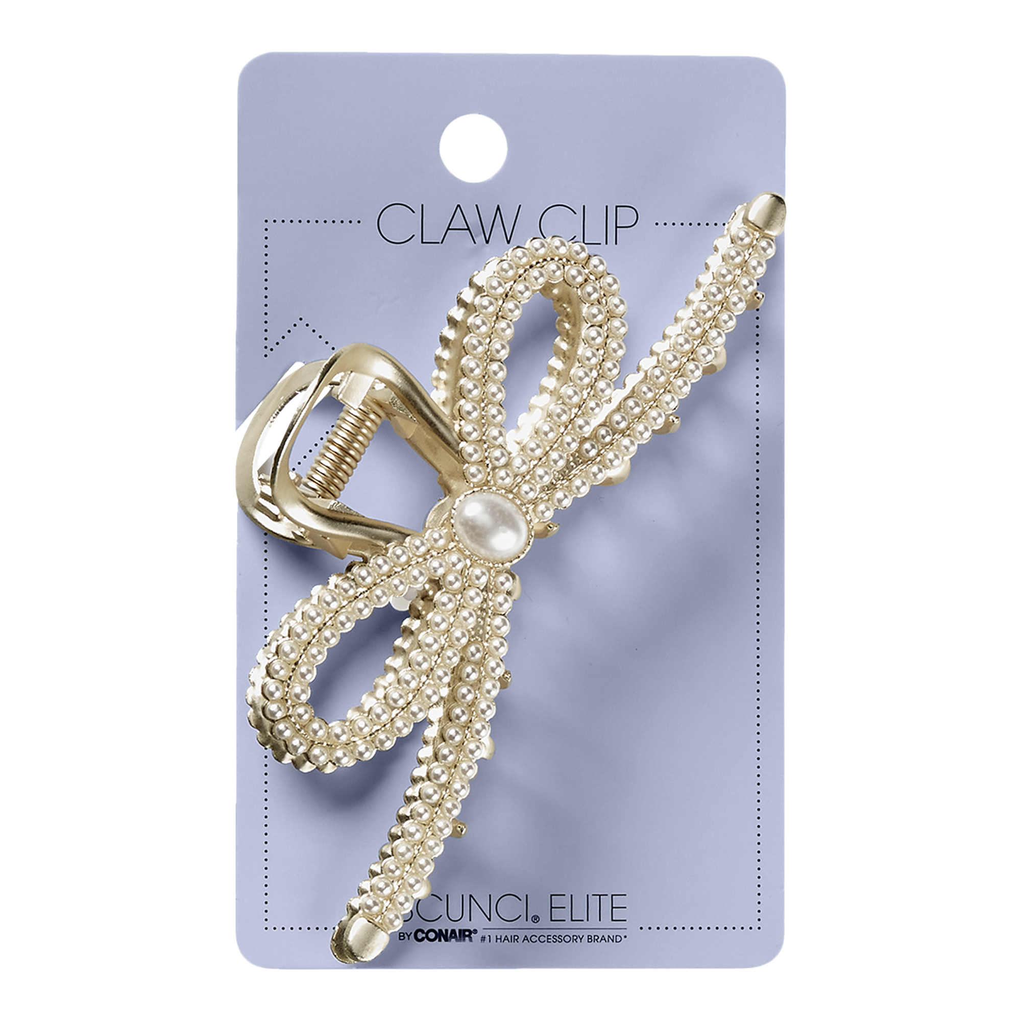 Add glamour to a formal updo with this Scünci gold-tone metal bow faux pearl claw clip. Featuring rows of faux pearl accents in a trendy bow shape, this clip has a strong grip that secures hairstyles in place.