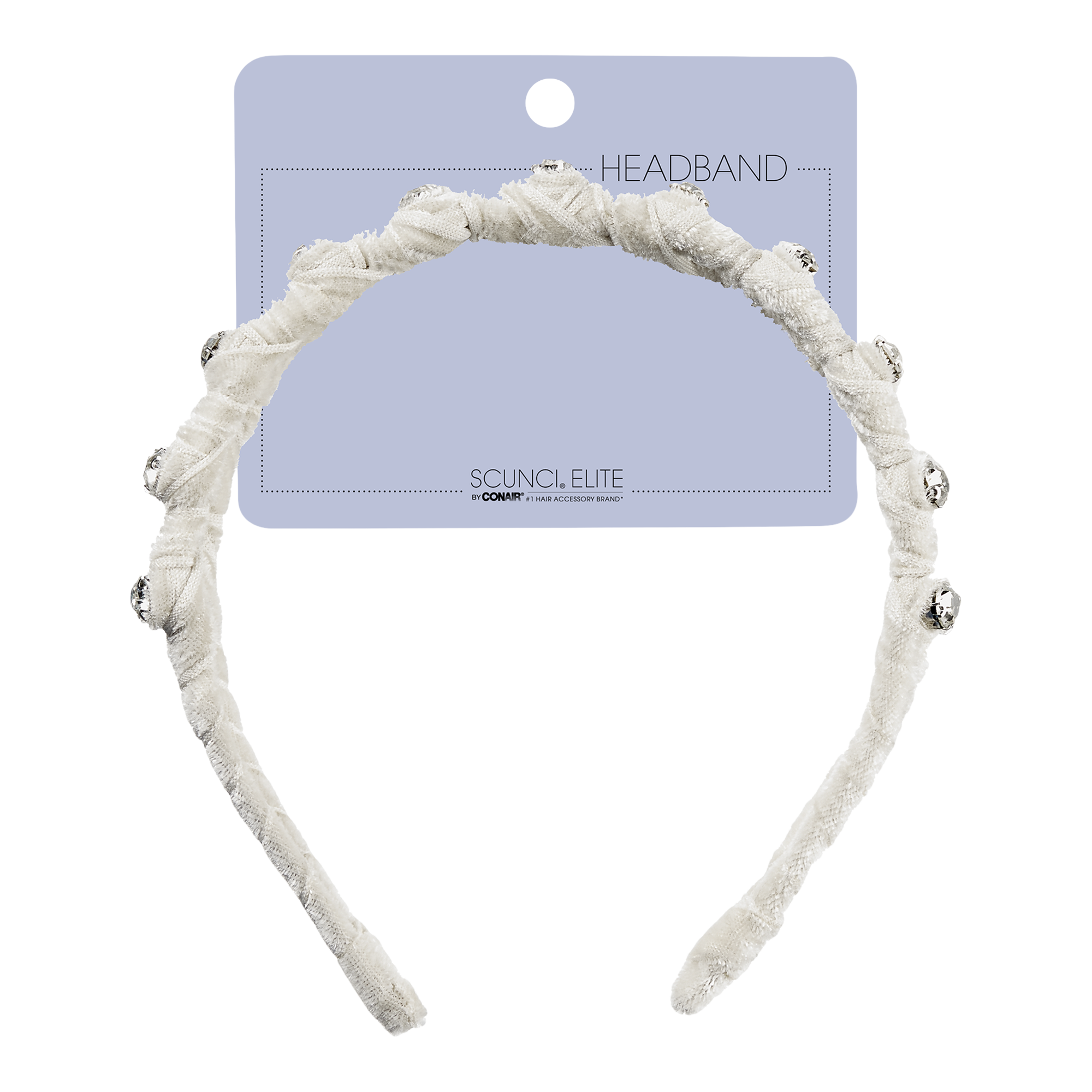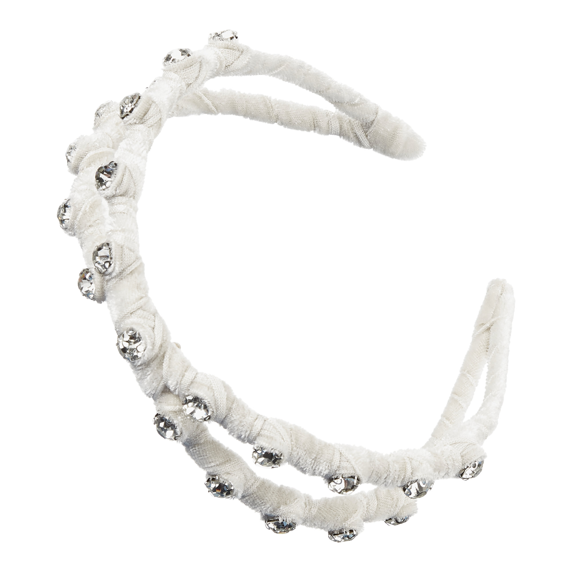 Make a statement with this stunning Scünci double-row headband. Wrapped in luxurious ivory velvet and adorned with faux crystal stones, this accessory slides on easily to instantly add glamour to any look.
