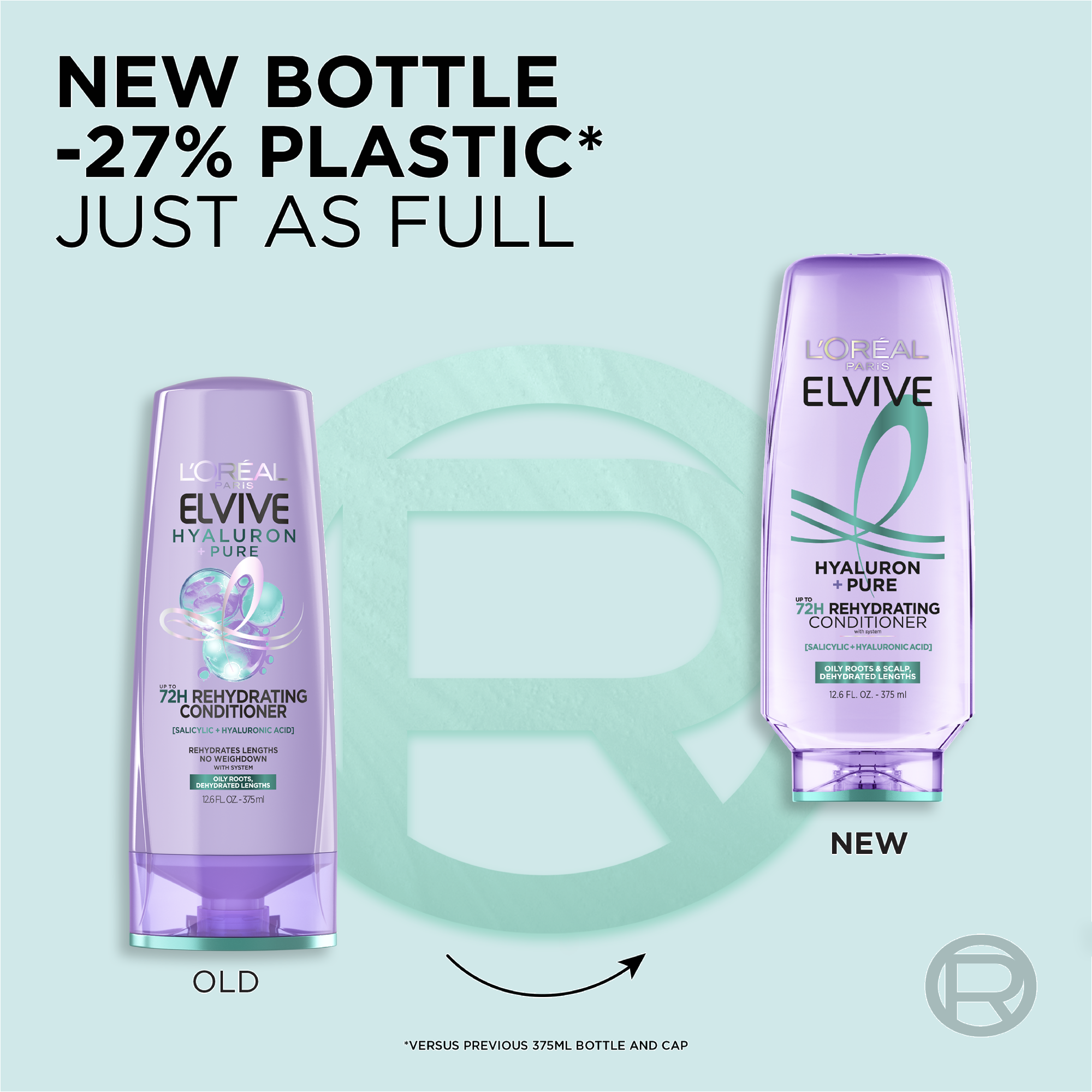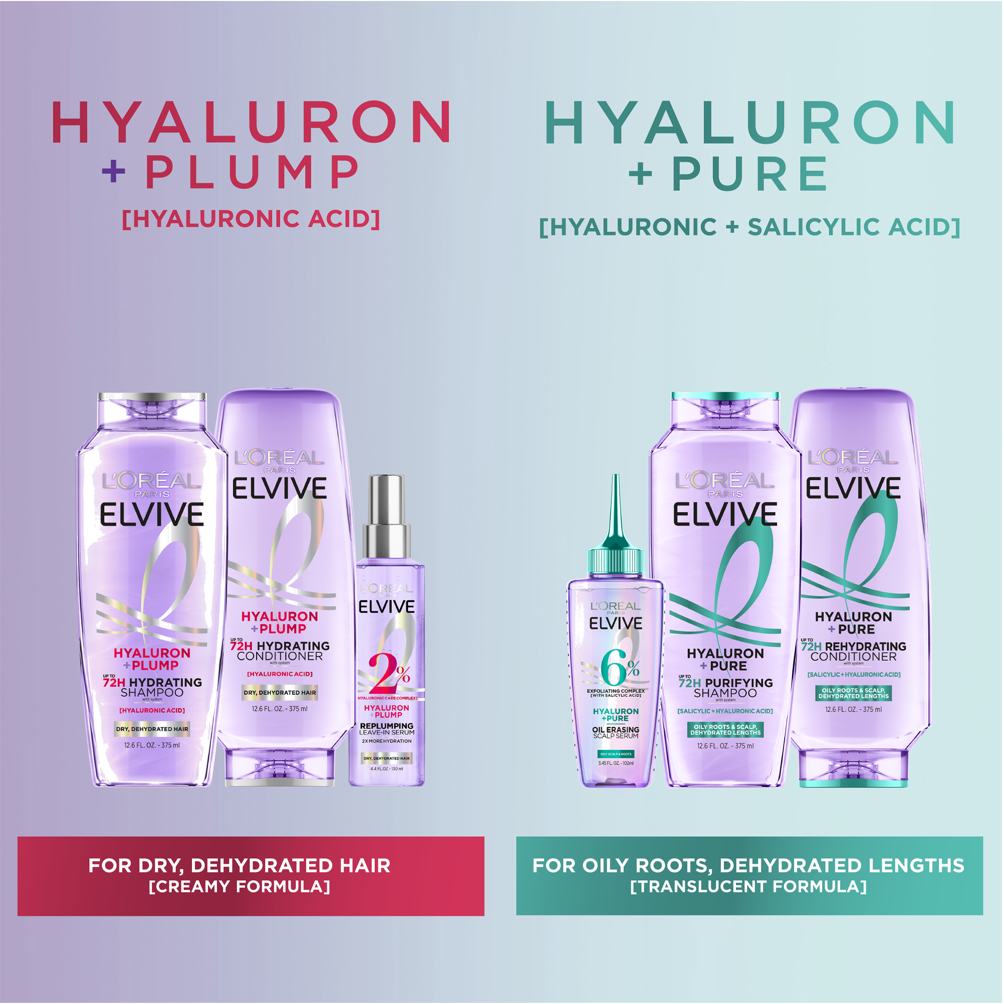 Inspired by skincare, L'Oréal Paris Elvive Hyaluron Pure 72H Rehydrating Conditioner with Hyaluronic Acid & Salicylic Acid purifies scalp and hydrates lengths for 72H of freshness and moisture
