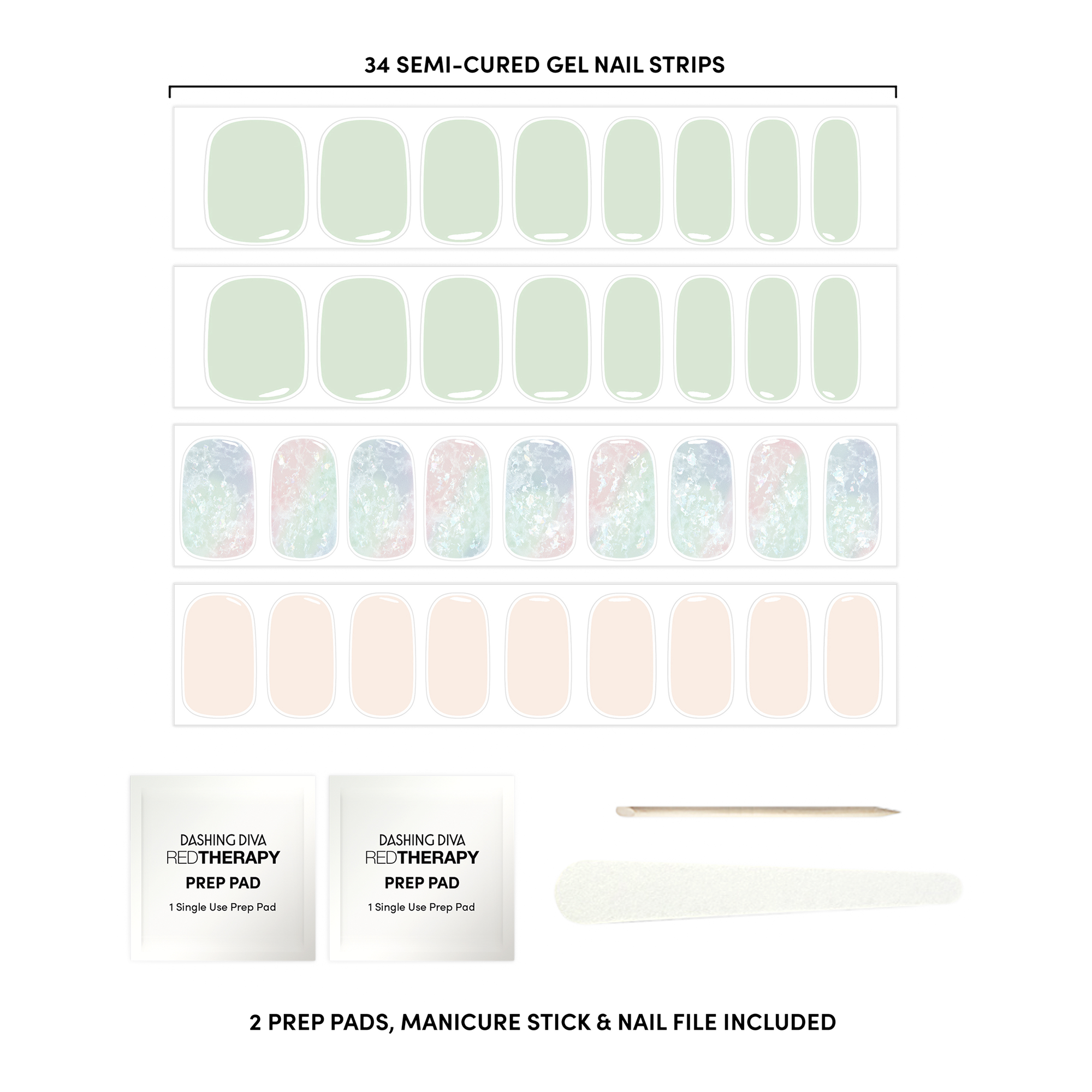 • 34 semi-cured gel manicure strips in 12 sizes
