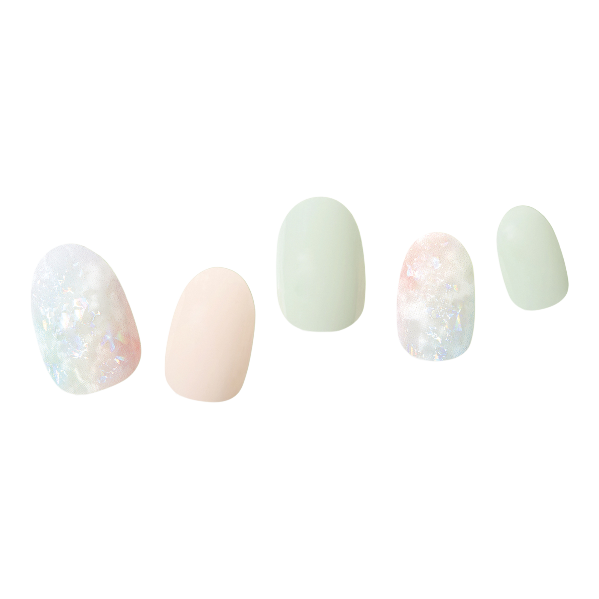 • A work of art manicure crafted like a stain glass window. Semi-cured light green & beige strips with a marble, glass-like effect and a glossy, high-shine finish