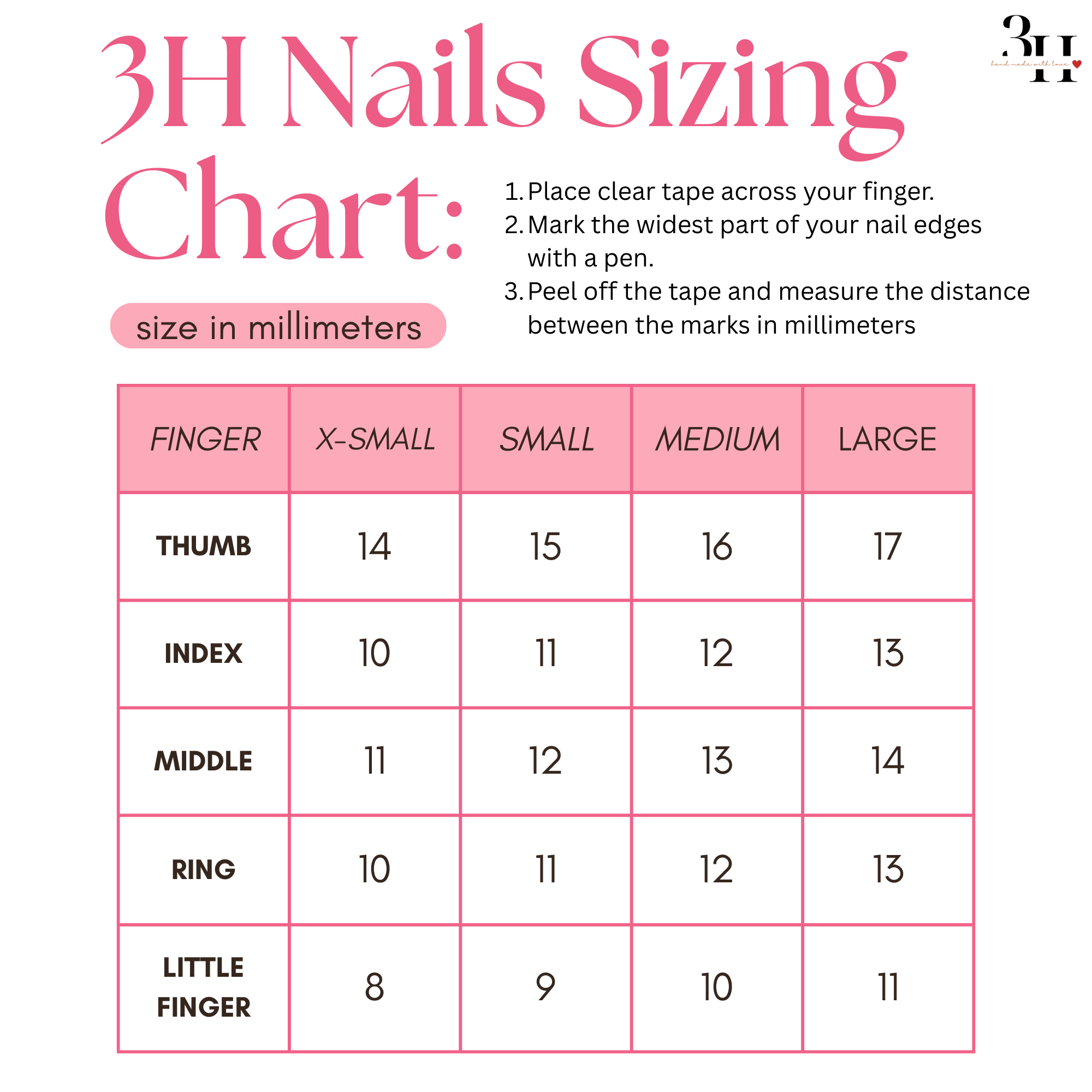 APPLICATION: Prep: Wash hands, push back cuticles, buff nails, and clean with alcohol pad. CHOOSE METHOD: Adhesive Tabs: Select size, apply to nail, press on for 10–15 seconds Nail Glue: Apply thin glue layer to nail and press-on, hold 10–15 seconds Finish: Shape if needed and avoid water for 1 hour.