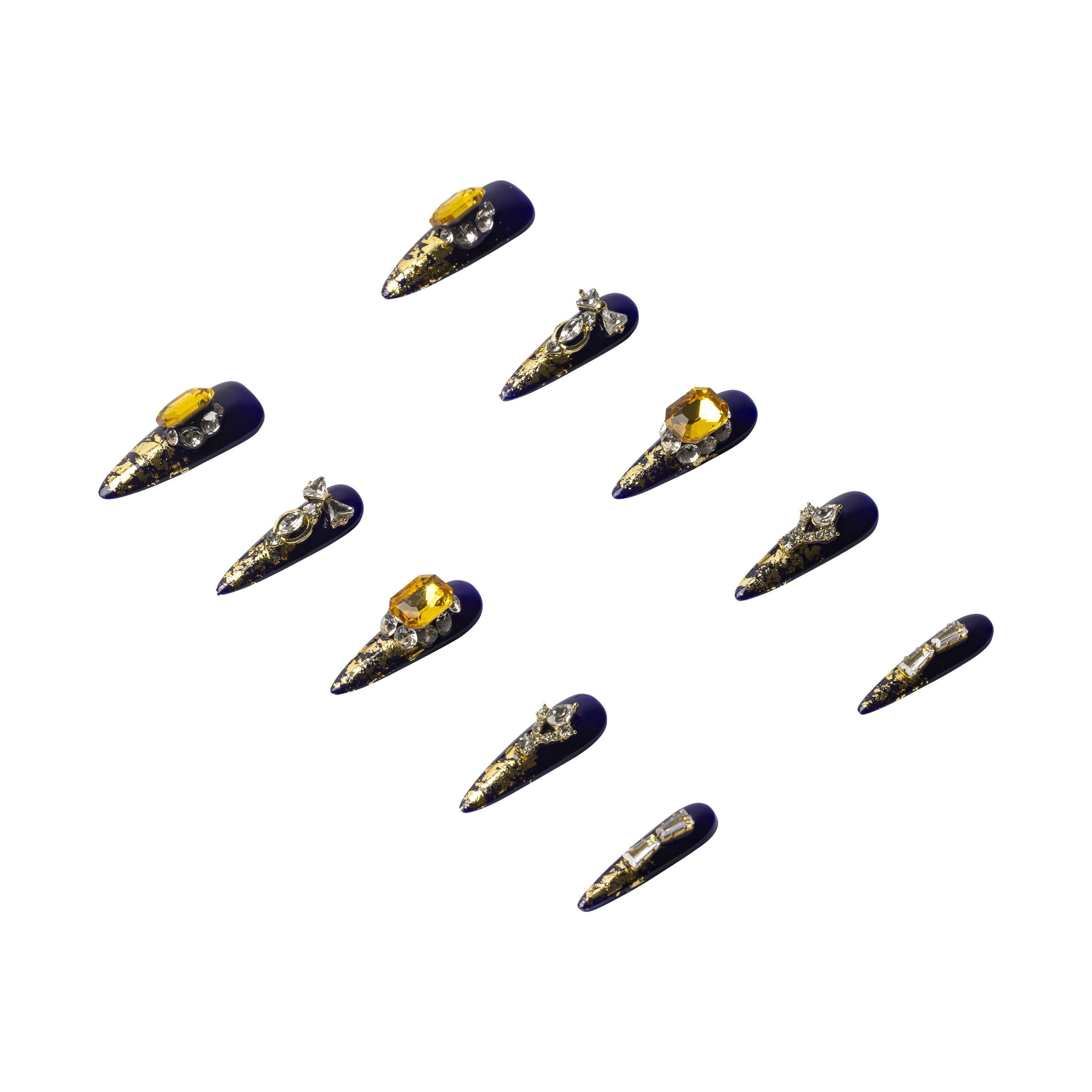 Dark navy stiletto nails with bold gold gems and metallic design. A regal, high-impact design made from high-quality materials. Handmade, reusable, and perfect for a glamorous finish.