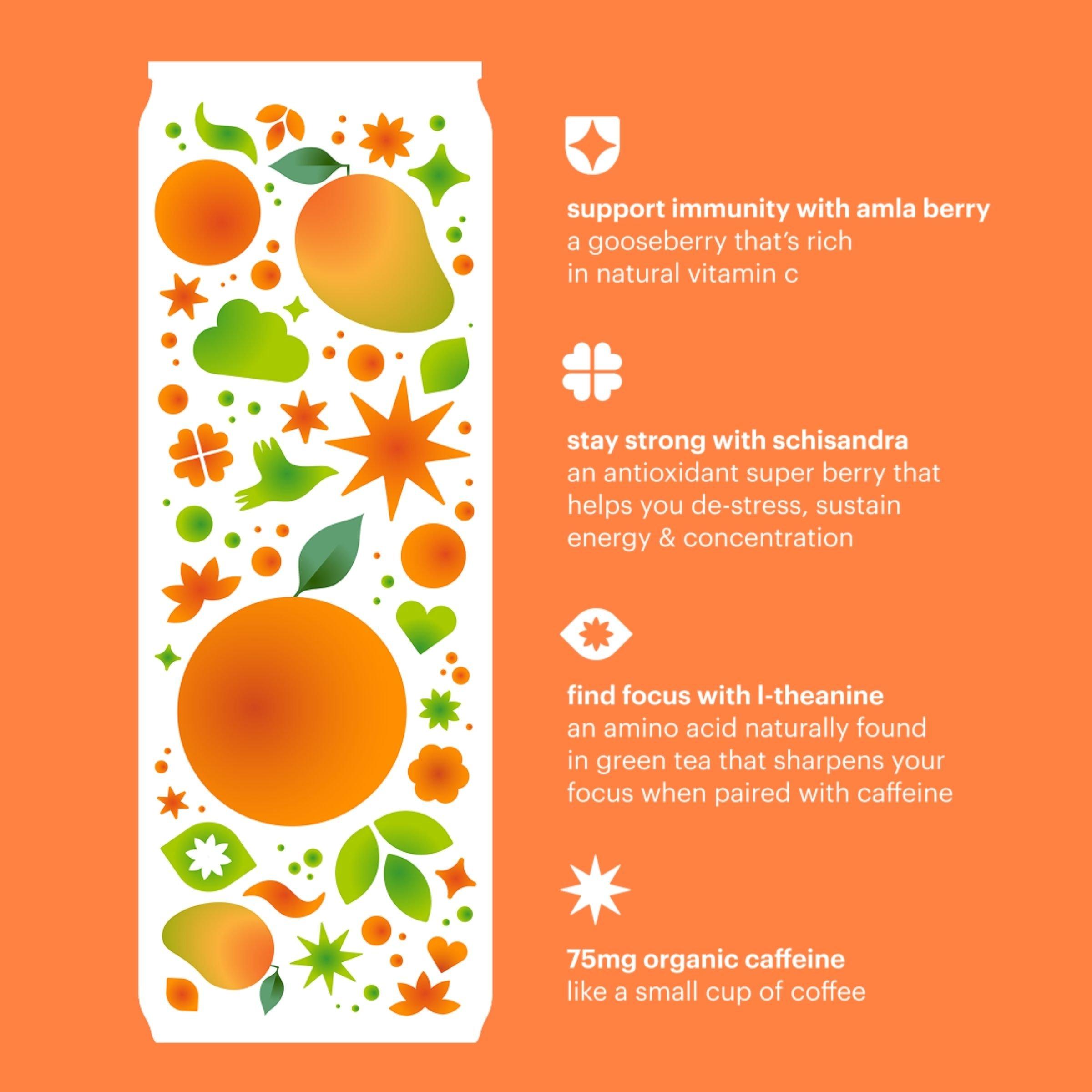 Carbonated filtered water, organic lime juice, organic orange juice, organic erythritol, organic mango puree, organic flavors, lemon balm extract, schisandra (fruit) extract, amla extract (vitamin C), organic ashwagandha (root) powder, malic acid, citric acid, L-theanine, organic caffeine (from green coffee beans), organic ginseng extract, and stevia extract.