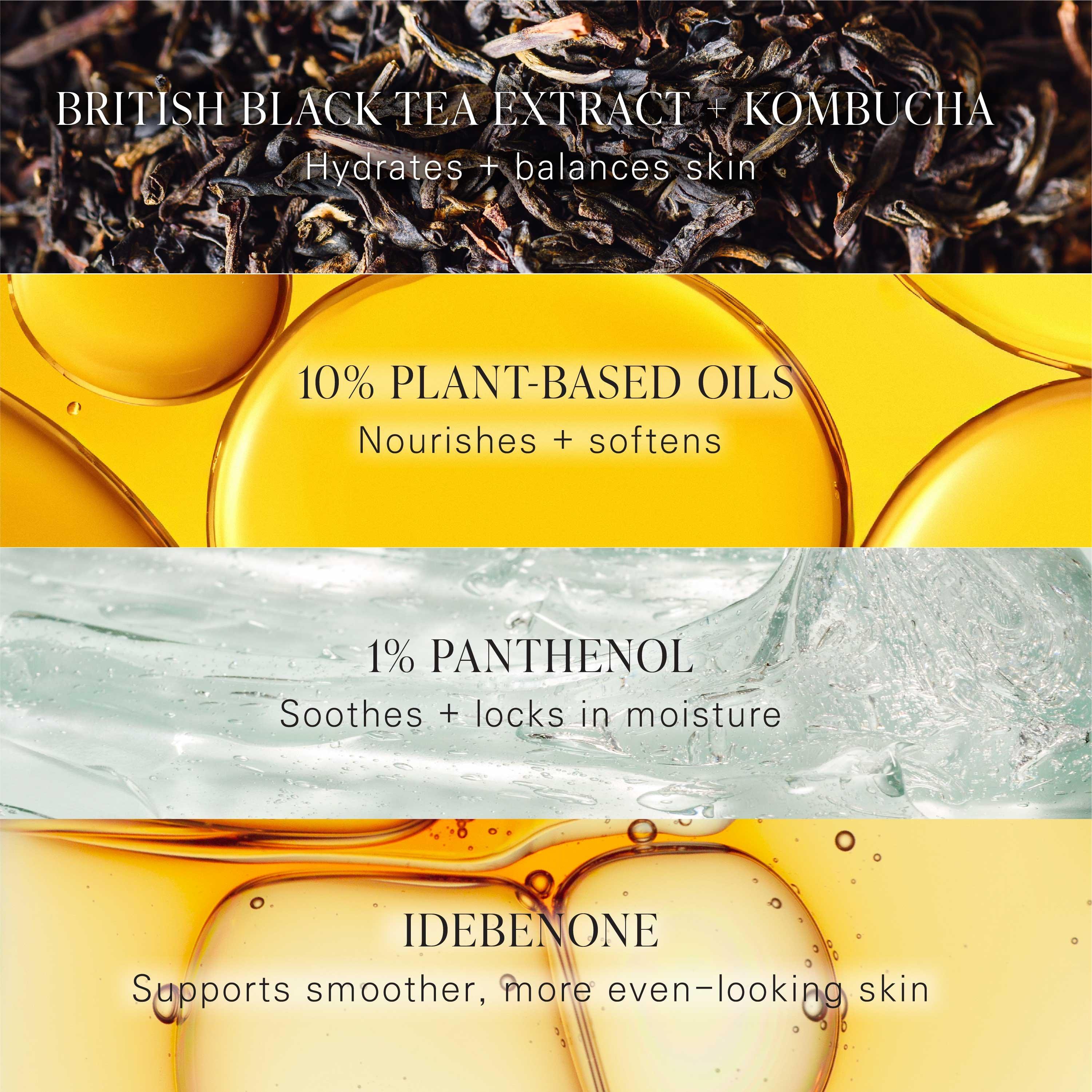 This bi-phase essence blends Black Tea, fermented Kombucha, and 10% plant-based oils to lock in moisture without heaviness. Clinically shown to hydrate for up to 72 hours, it softens dryness, smooths texture, and restores a supple, plump glow in one step.